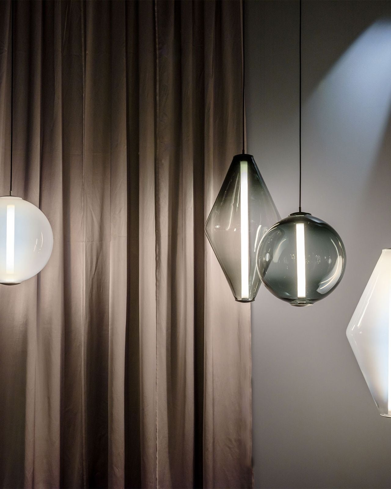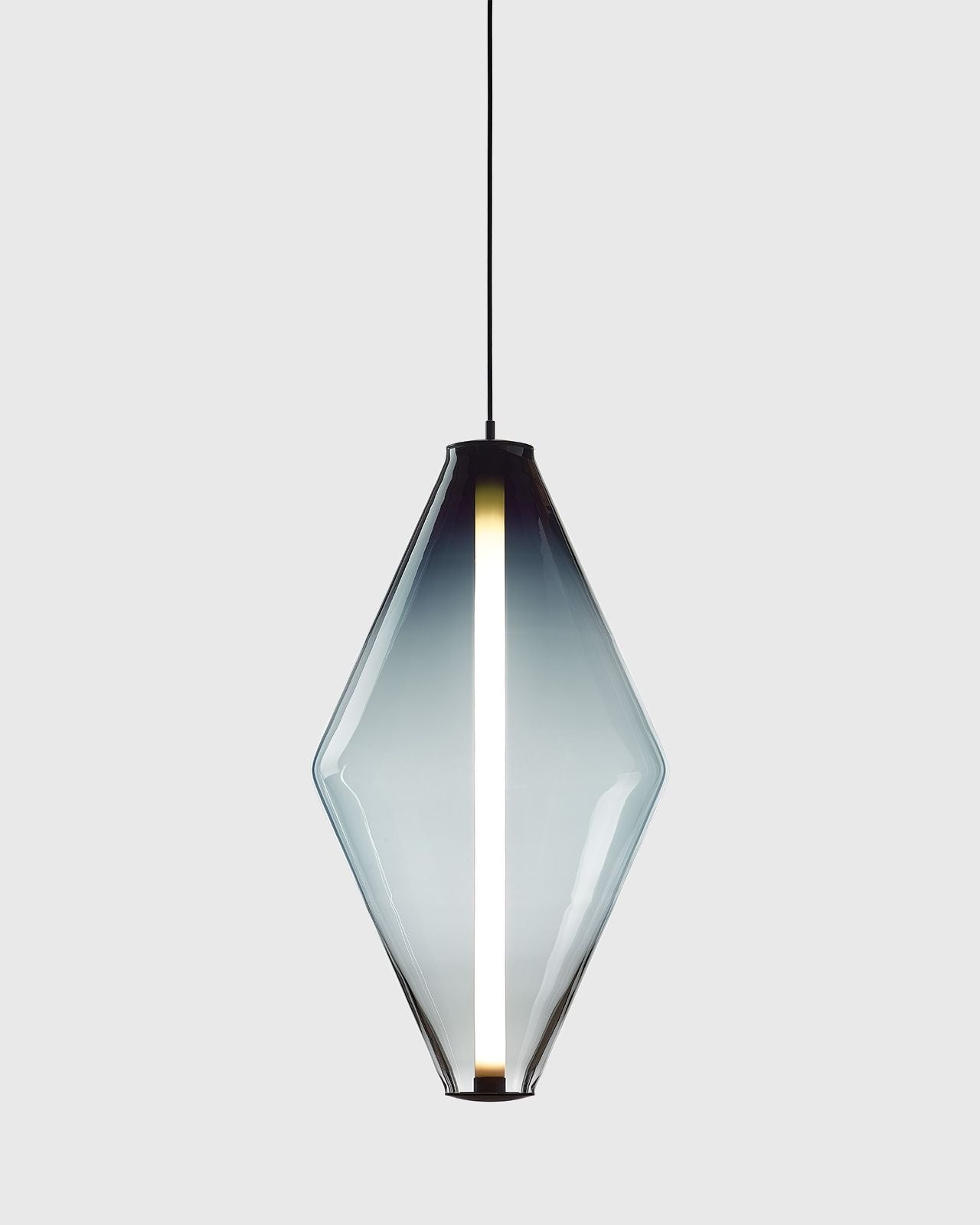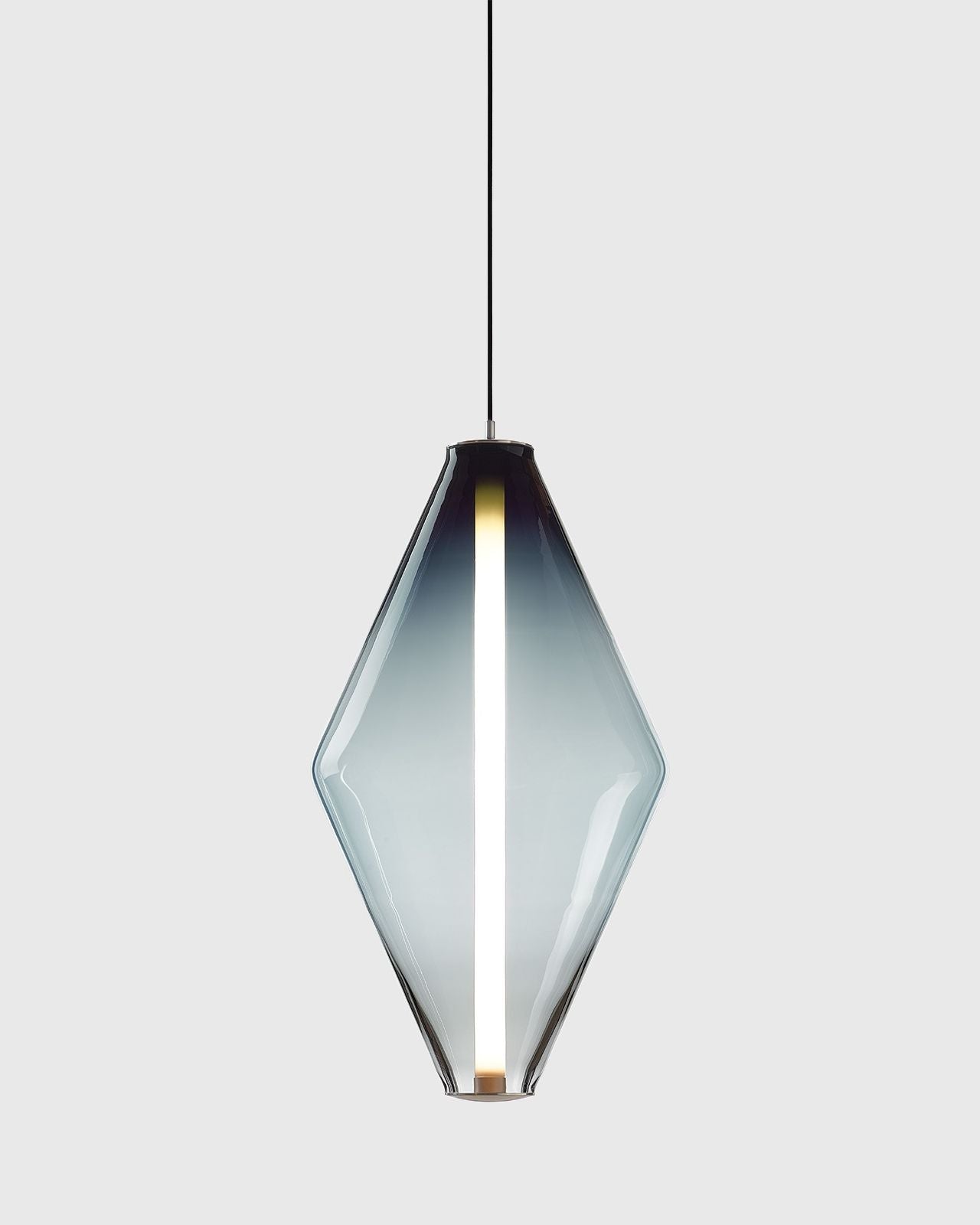 Inspired by buoys that served as orientation point for sailors during days and nights, this geometric and minimalist pendant was designed by Václav Mlynář. Crafted from hand-blown clear, white or smoked crystal glass, this double cone light features a unique rod made from sandblasted polycarbonate at the centre allowing the light to evenly run through the body. To add some refinement, this fixture also includes black or silver aluminium fitting. Looking great on its own, it can also make a statement as a cluster playing with finishes.