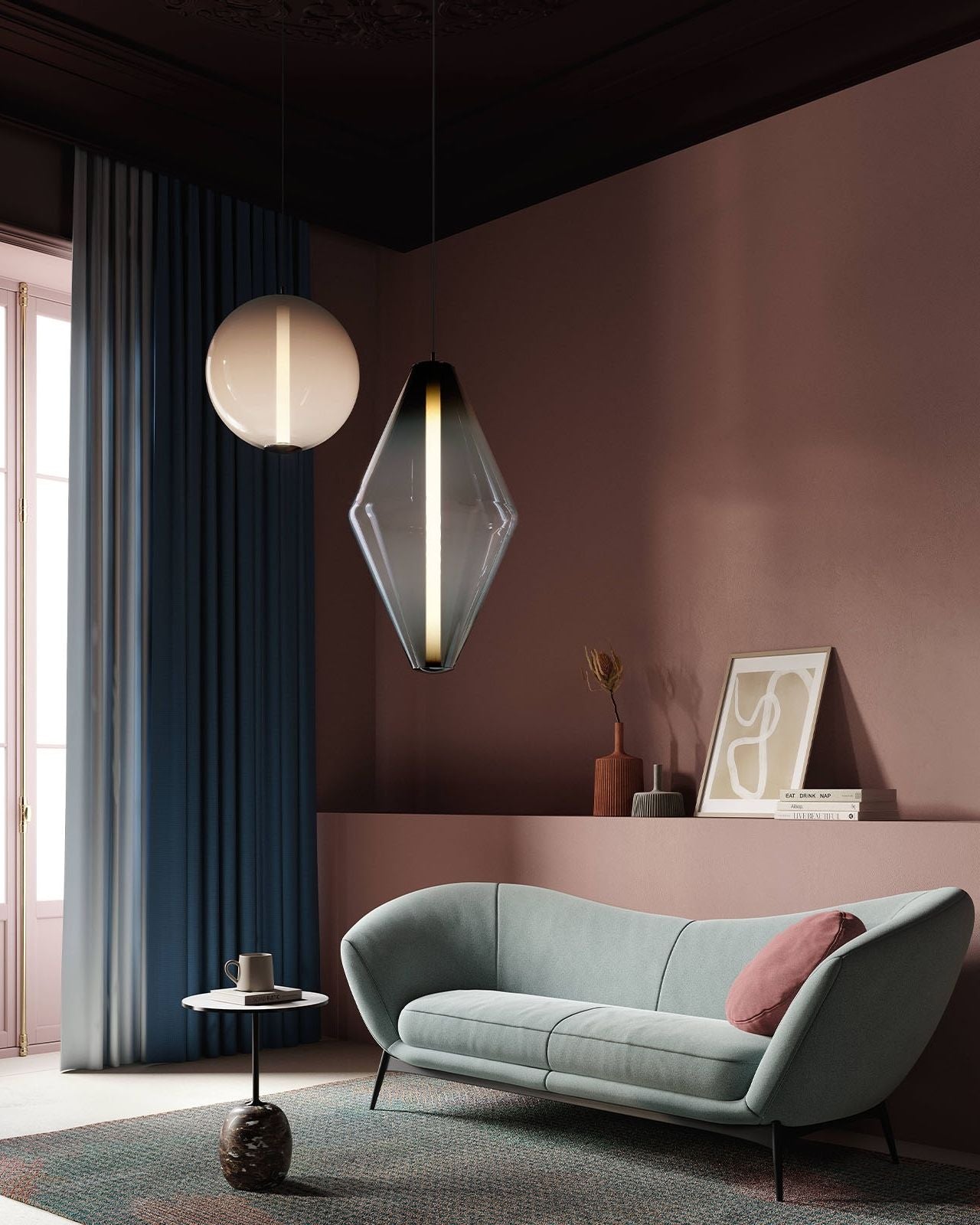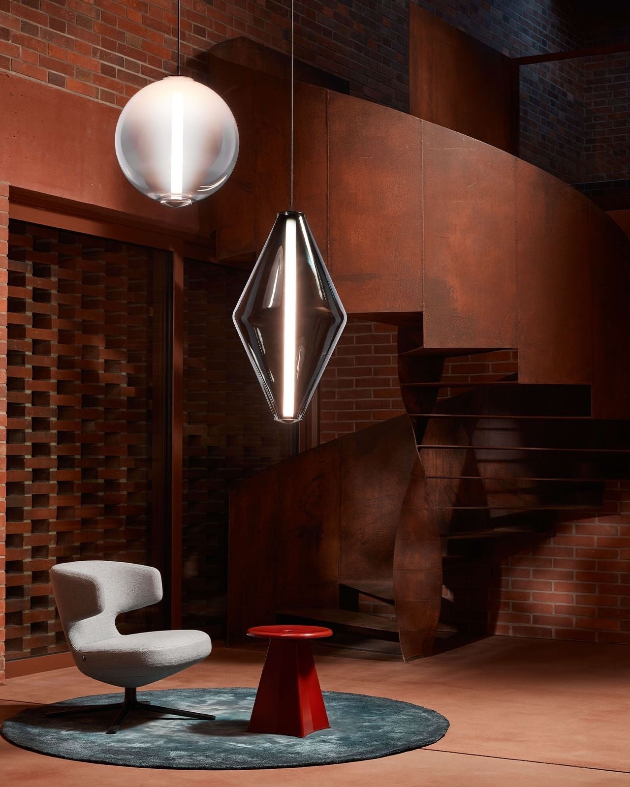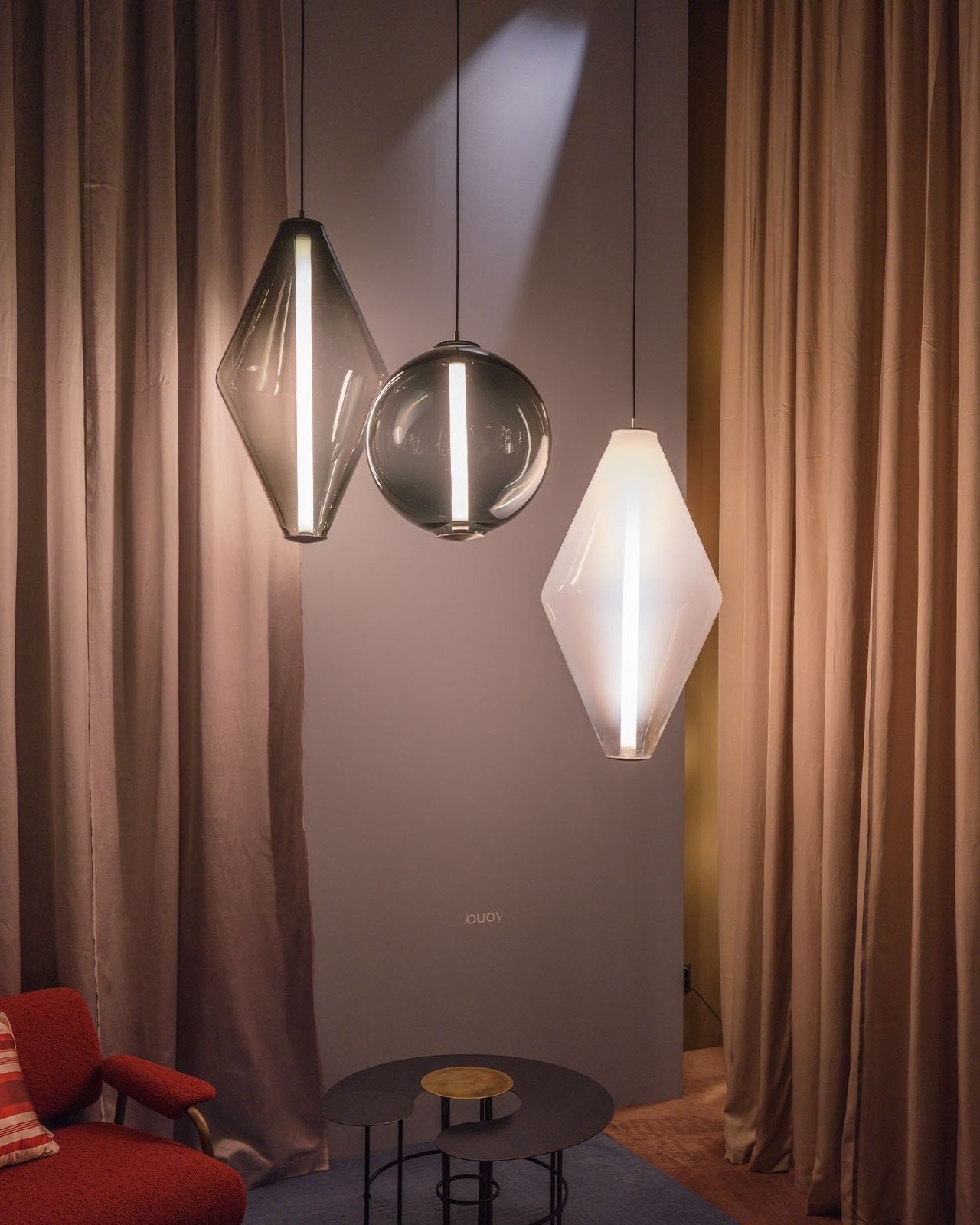 Inspired by buoys that served as orientation point for sailors during days and nights, this geometric and minimalist pendant was designed by Václav Mlynář. Crafted from hand-blown clear, white or smoked crystal glass, this double cone light features a unique rod made from sandblasted polycarbonate at the centre allowing the light to evenly run through the body. To add some refinement, this fixture also includes black or silver aluminium fitting. Looking great on its own, it can also make a statement as a cluster playing with finishes.