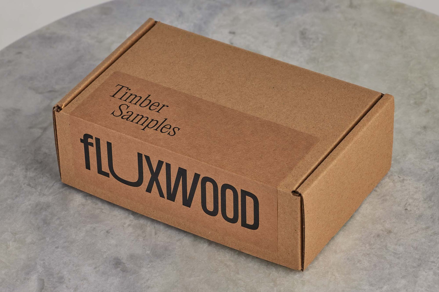 Fluxwood timber swatch features 8 timber species including Victorian Ash, Spotted Gum, Tasmanian Blackwood, Walnut and American Oak. American Oak is shown available in our standard finish, oil finish, and black or white options. Their samples are available in individual pieces or a full box set of all 8 samples.
