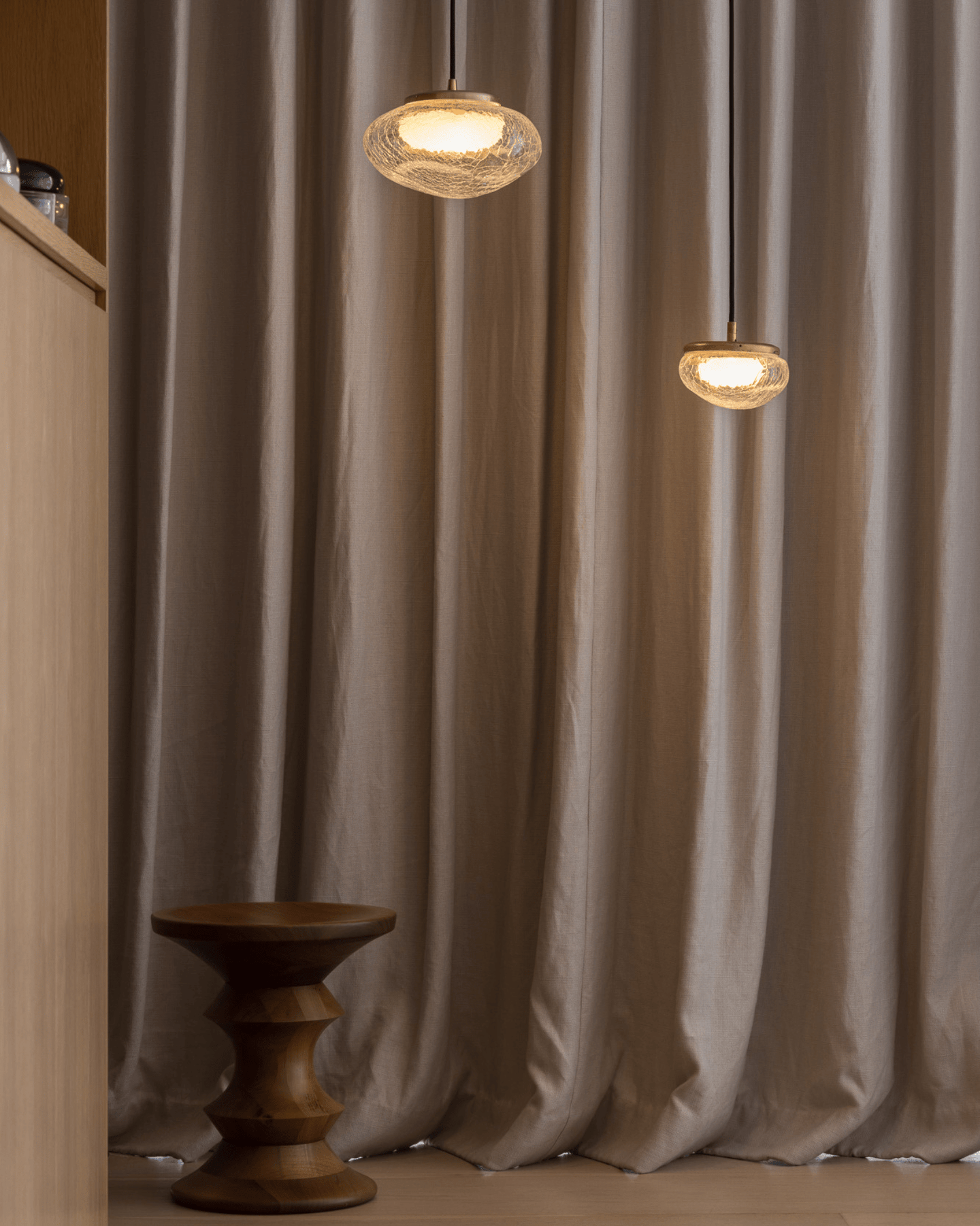The Crackle Glass Pendant Light draws inspiration from the organic forms and delicate beauty of natural textures. Uniquely combining a blown glass external diffuser with a 3D-printed internal structure. This pendant softens light to create a calm and warm ambiance — making it a sculptural statement for commercial and residential projects. Designed for versatility, it suits kitchen islands, dining and living areas. Rated IP55 it is also suitable for bathrooms and covered exterior spaces. Available in small and large, handcrafted in Sydney by ADesignStudio.