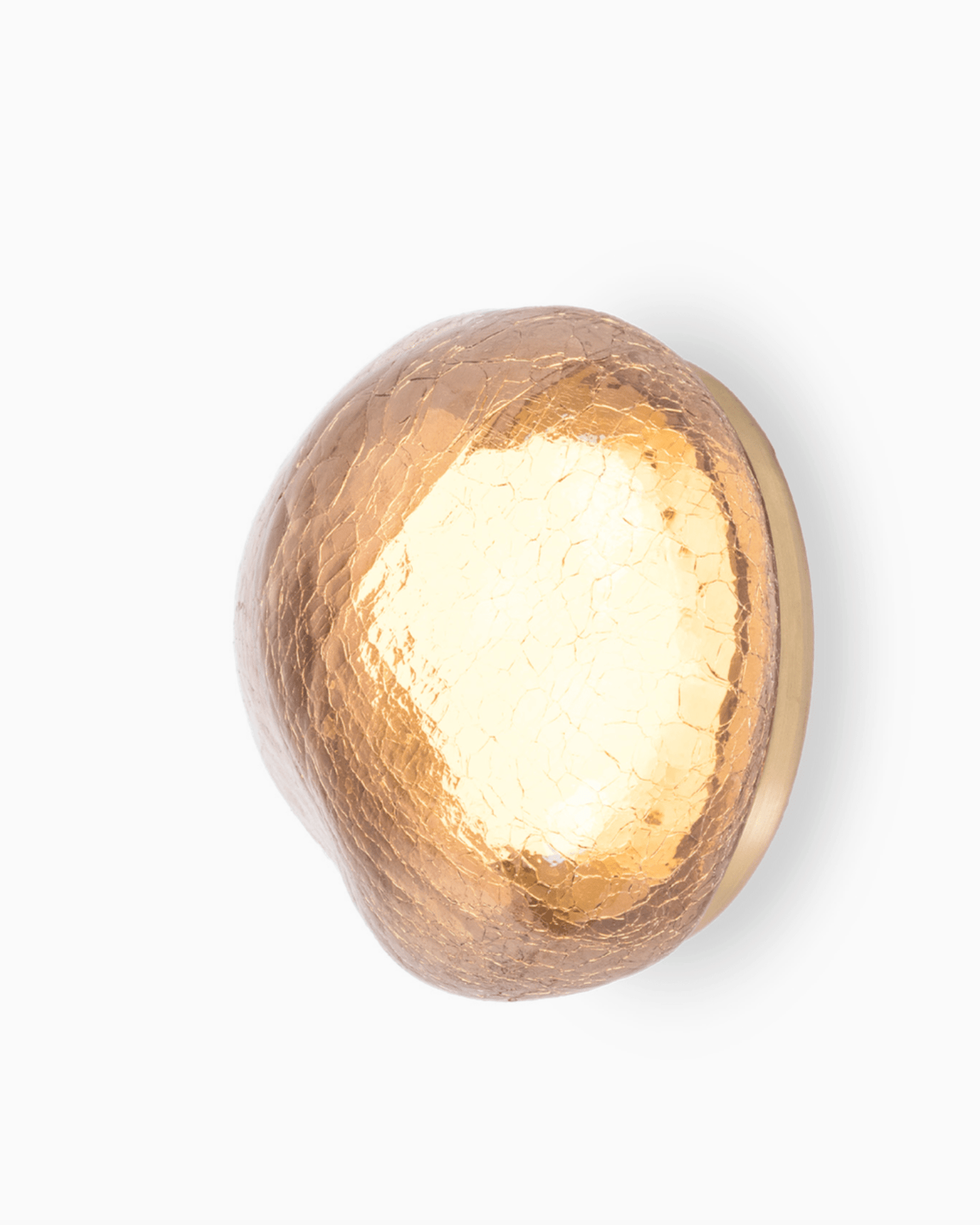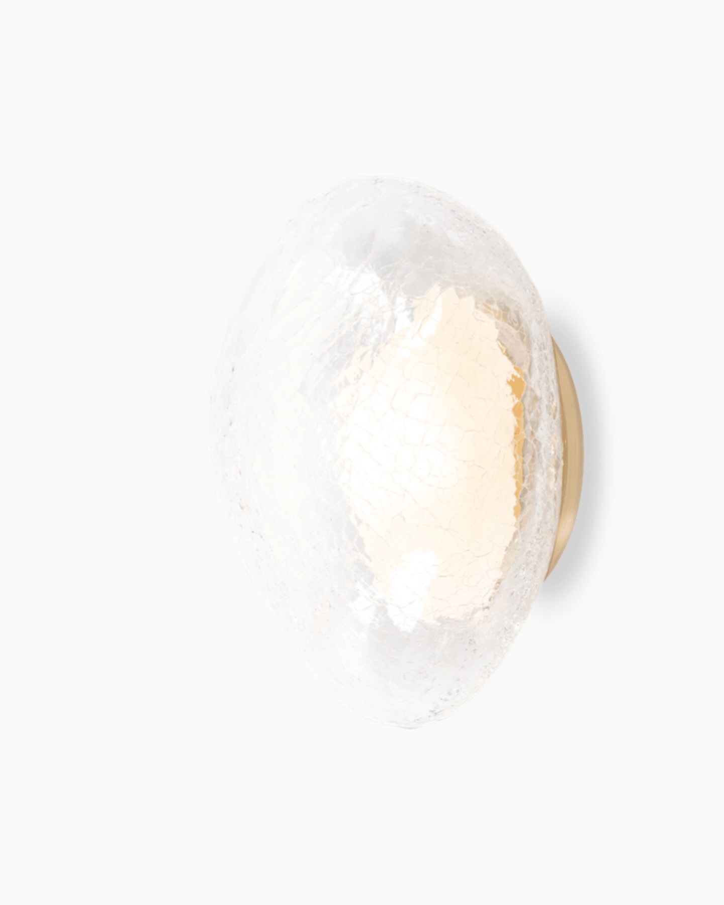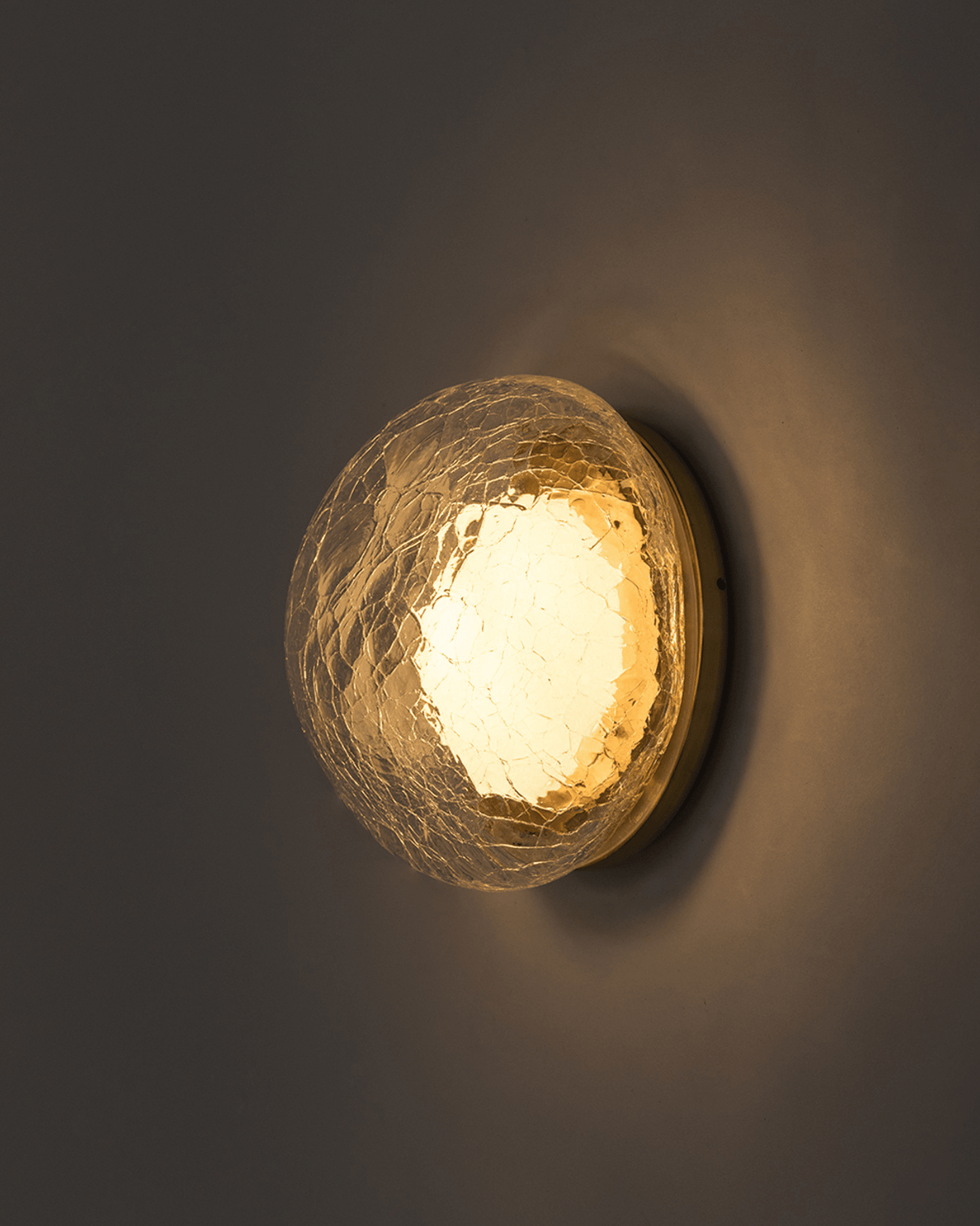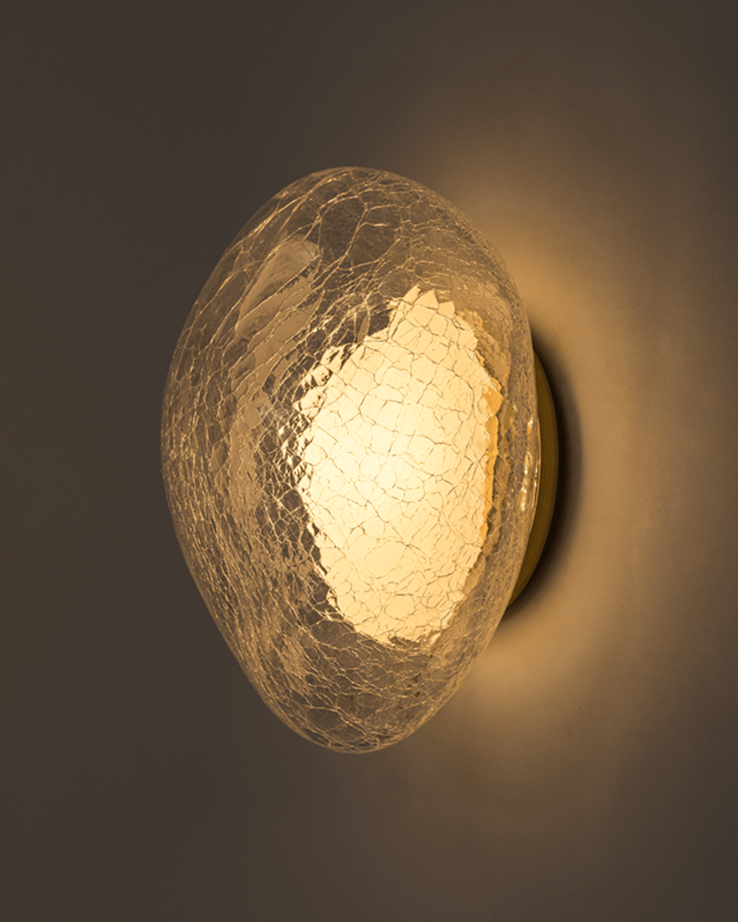 The Crackle Glass Wall Light draws inspiration from organic forms and the delicate beauty of natural textures. Combining a crackled blown glass external diffuser with a 3D-printed internal structure, it softens light to create a calm and warm ambiance — making it a sculptural statement for both indoor and outdoor spaces.