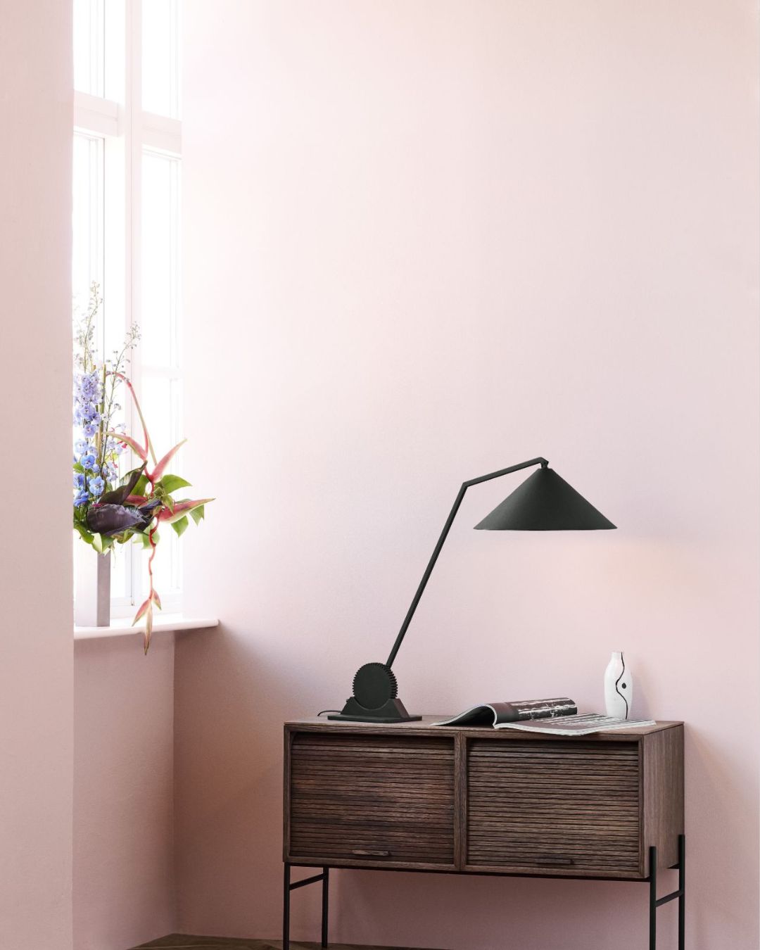 Modern desk with a lamp and open book against a light pink wall.