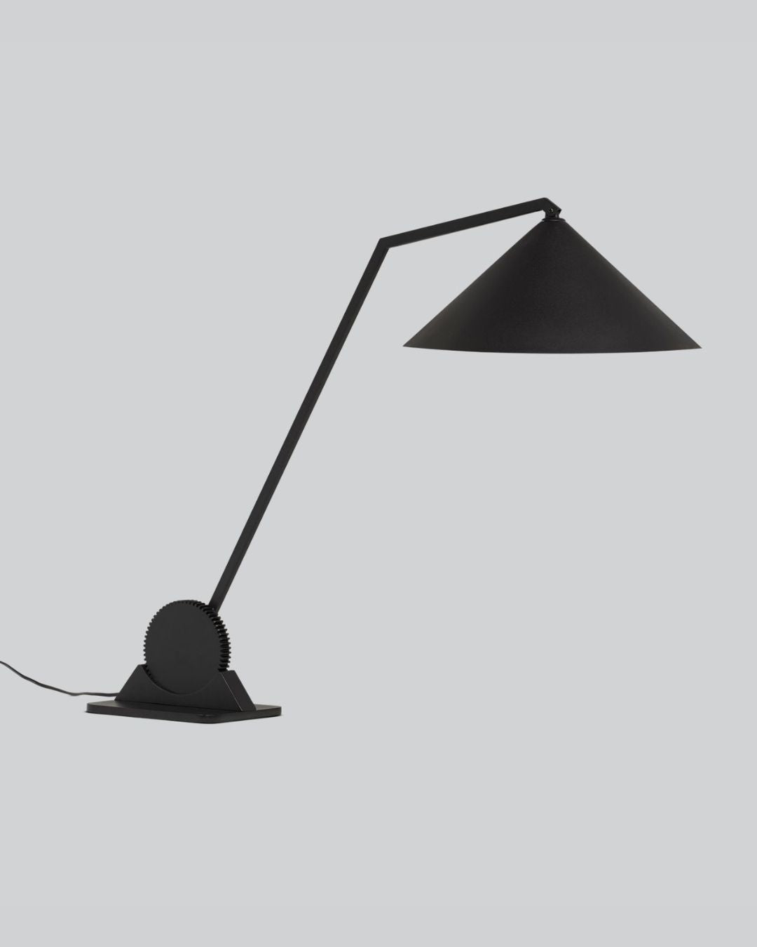 An adjustable industrial-style table lamp featuring rotating gear details and clean, defined lines, this piece makes a bold addition to any workspace or desk. The height is easily set using a manual lever, which locks firmly into place once positioned.