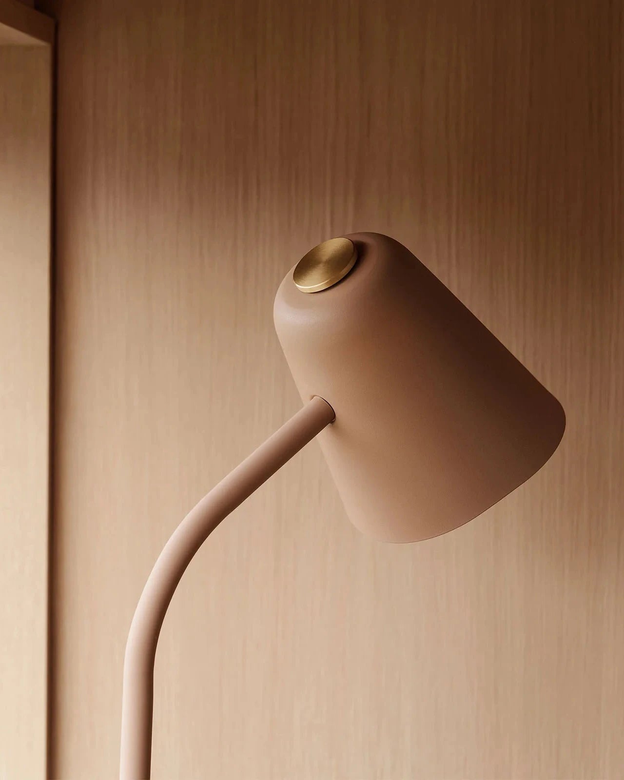 Modern room with a desk, chair, and Contemporary Funky Floor Lamp Warm Beige against a wooden wall.