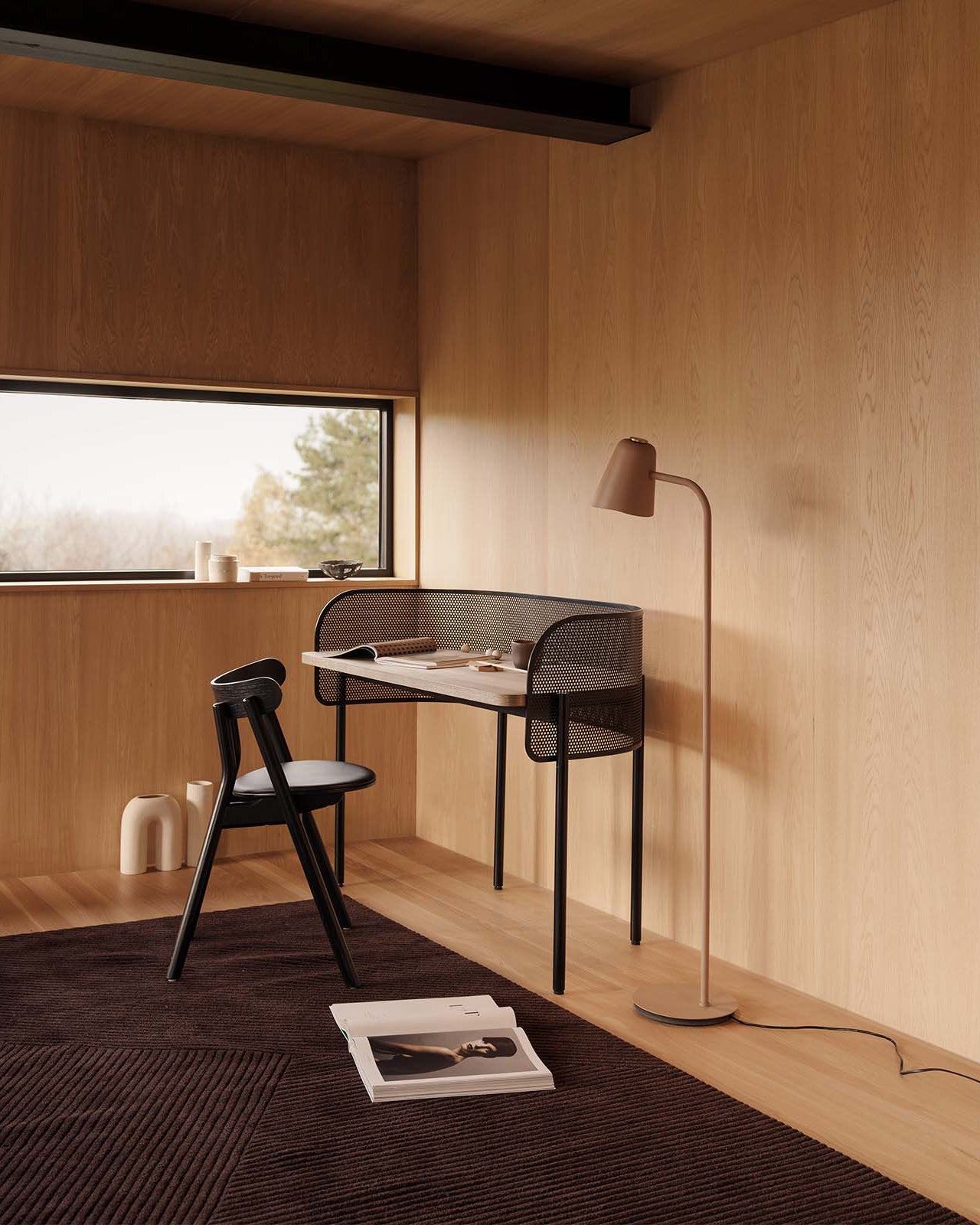 Modern floor lamp with a wooden desk and chair against a wooden wall.