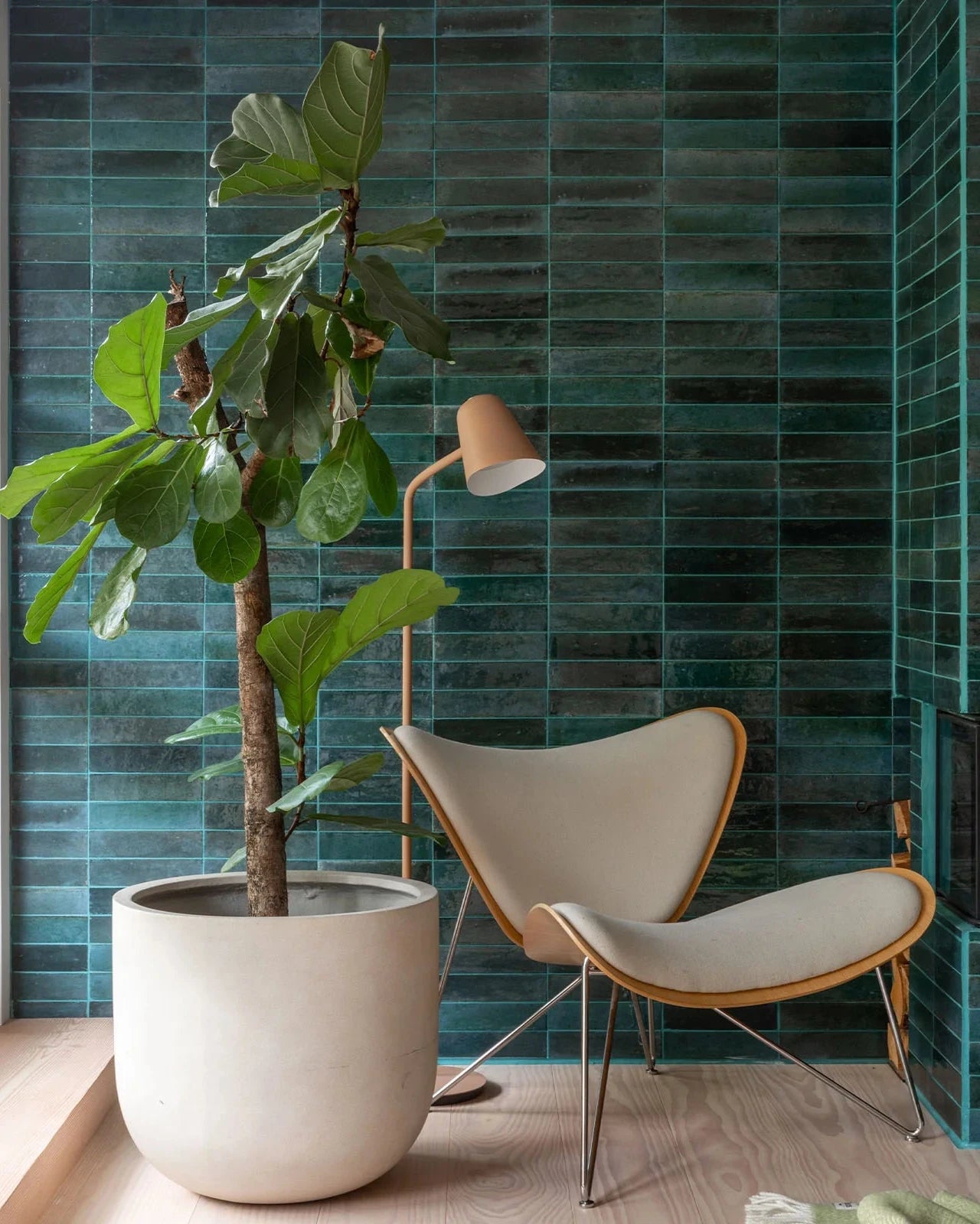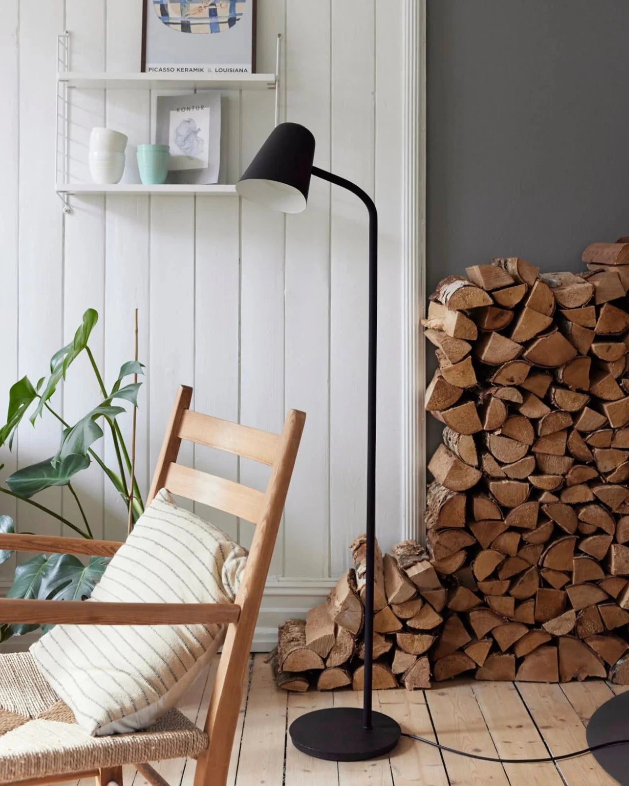 Contemporary Funky Floor Lamp Warm Beige next to a wooden chair and stacked firewood in a room with white walls.