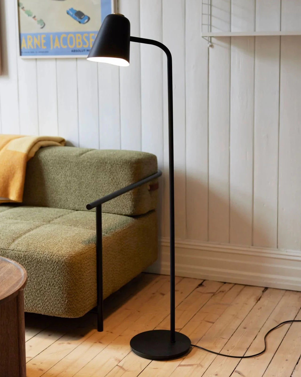 Modern floor lamp in a living room setting with a sofa and side table.