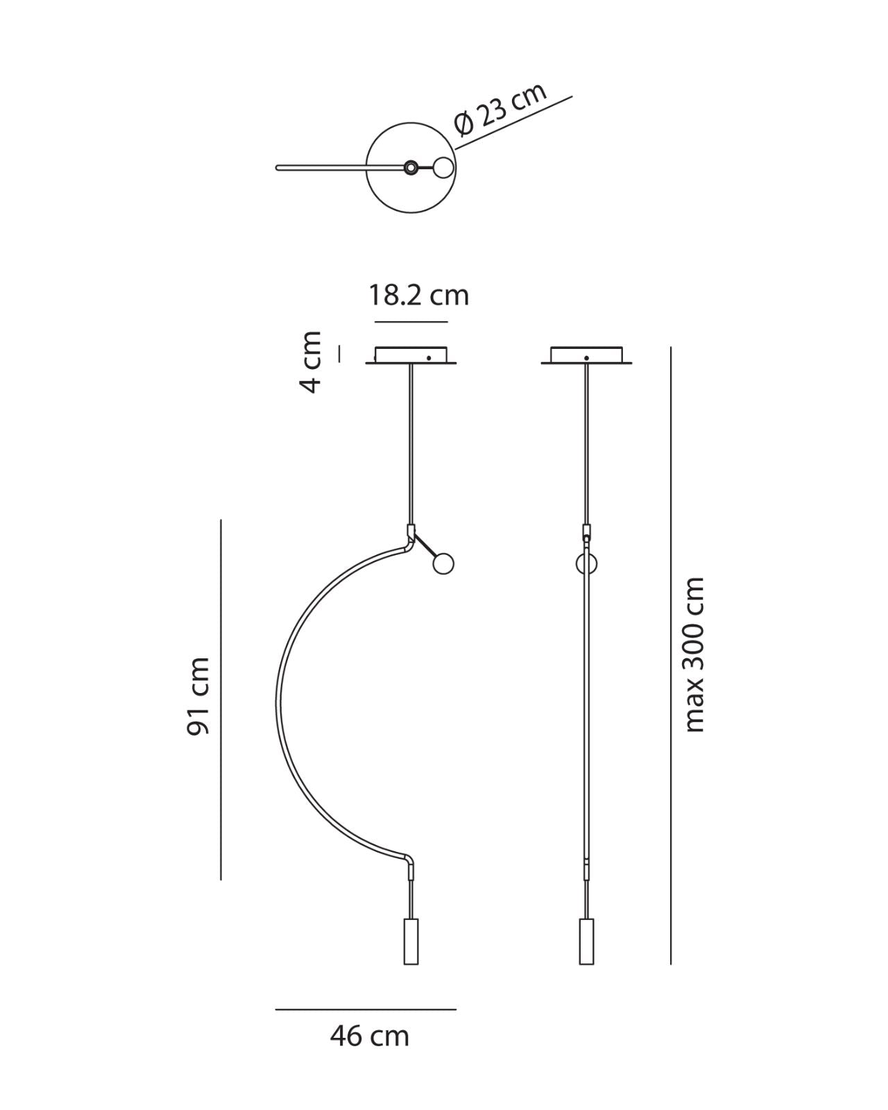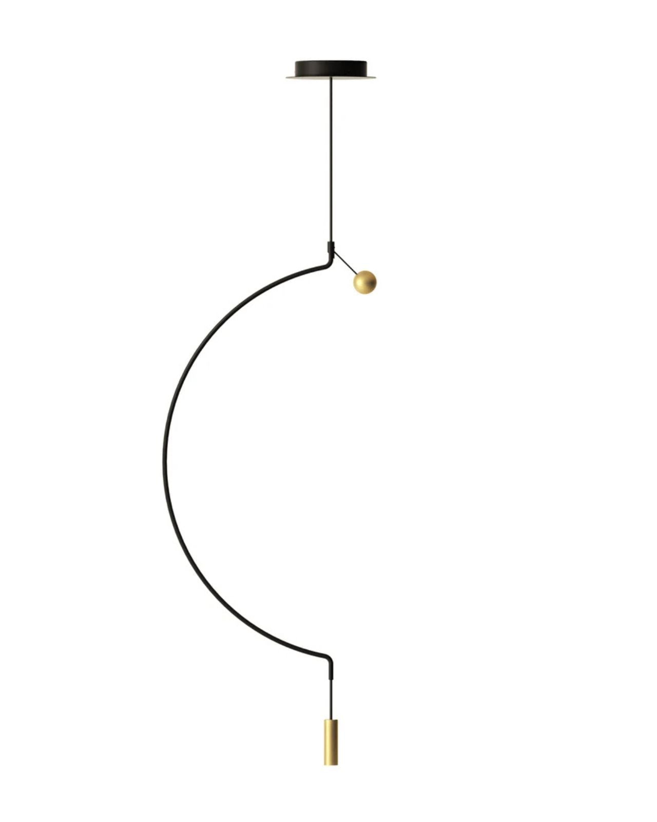 A uniquely beautiful statement piece to showcase. This metallic structure composes of a slender curve suspended on a metallic rod. Evoking a sense of modern playfulness in an elegant and sleek form. Crafted in Italy, this pendant is available in custom configurations, available on request.