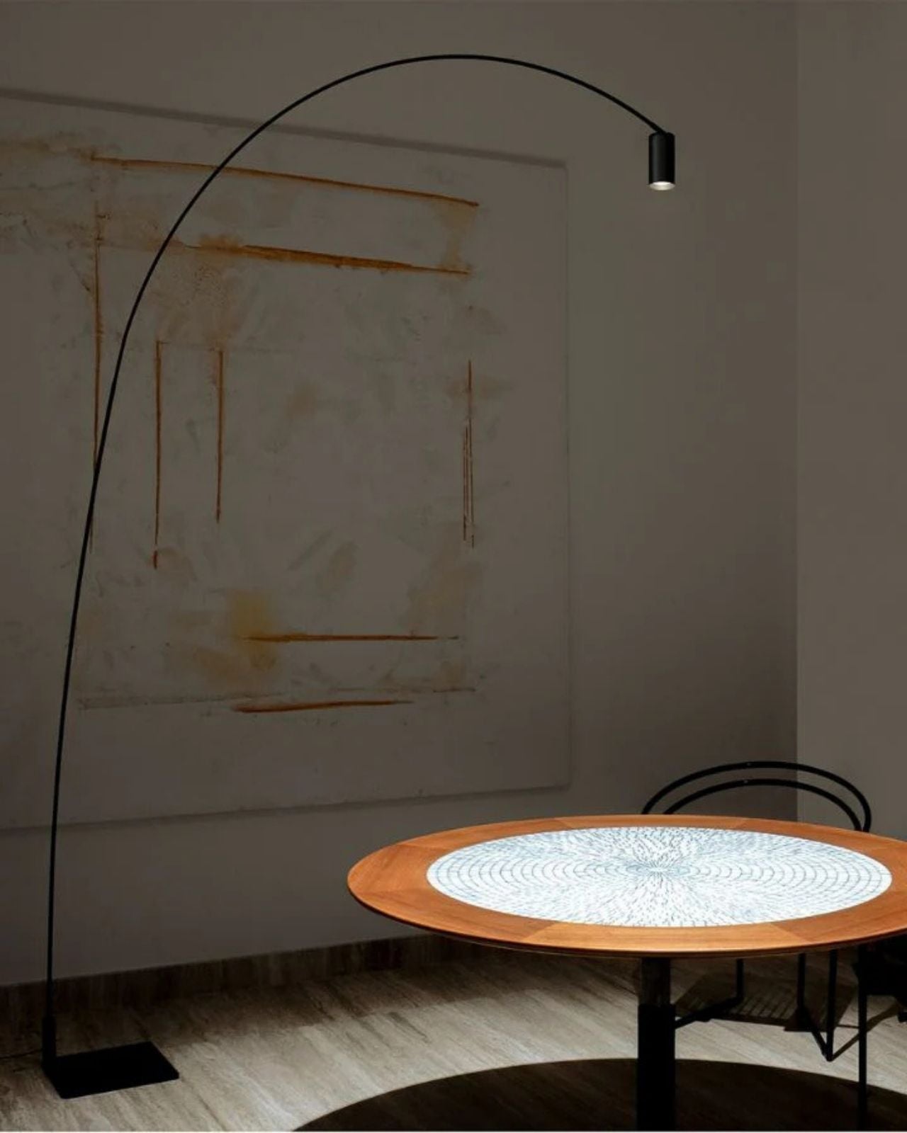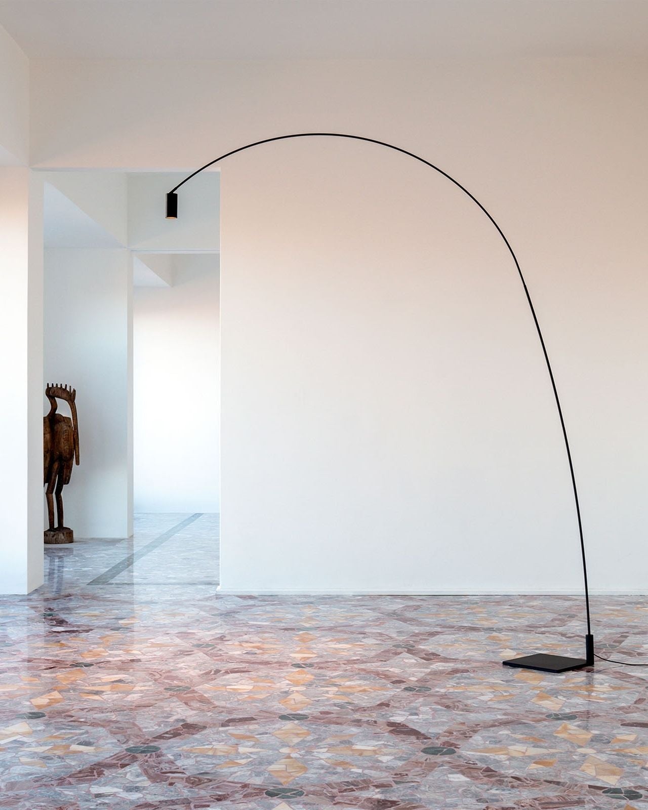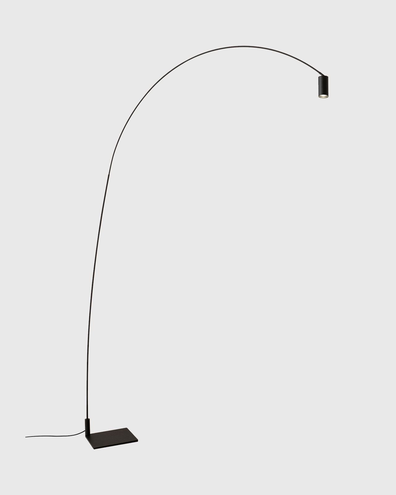The Counter-Balanced Black Floor Lamp designed by Bernhard Osann, features a steel structure and matte black aluminium head for a sleek and minimalistic design. With a swivelling arc and adjustable cylindrical head, this lamp offers optimal movement and flexibility to direct a warm, diffused light. Osann utilises the laws of physics and movement to create interesting silhouettes from simple structures. This design comes with a removable honeycomb lens to further diffuse light.