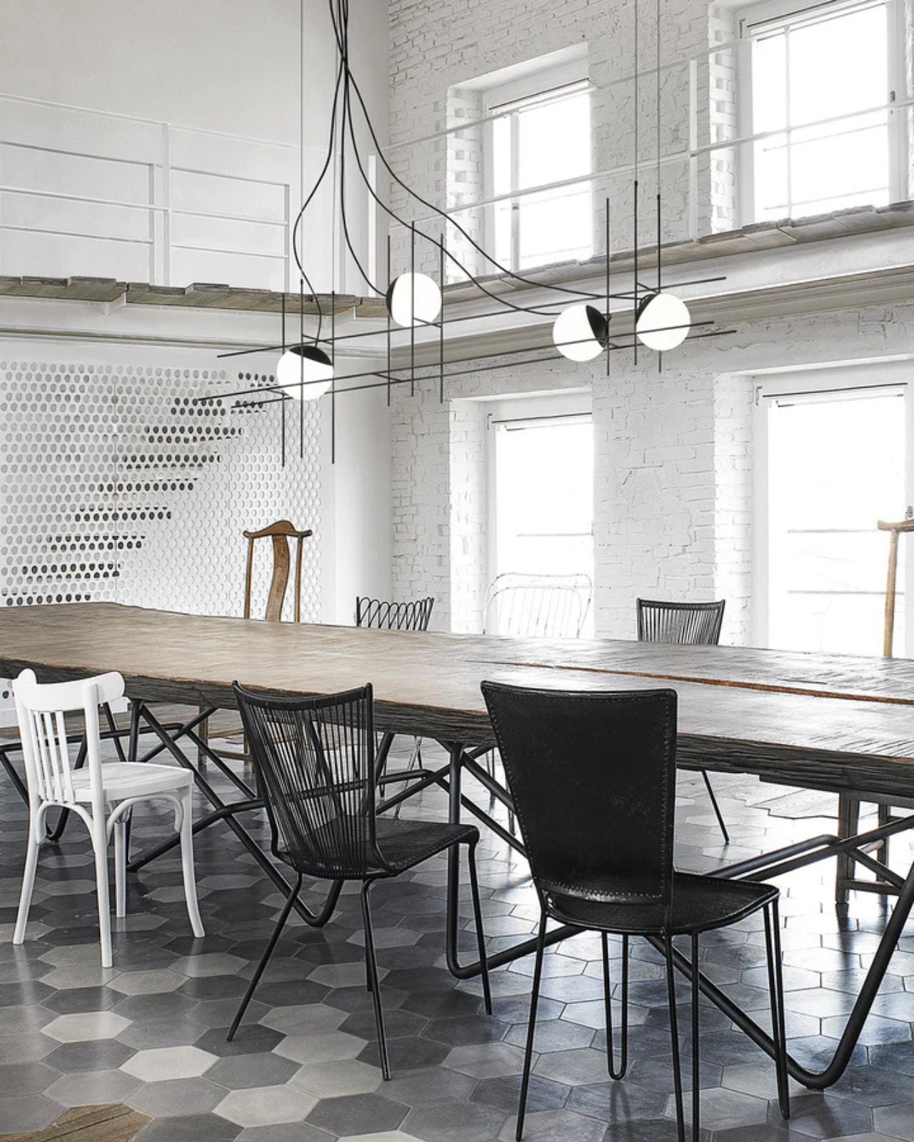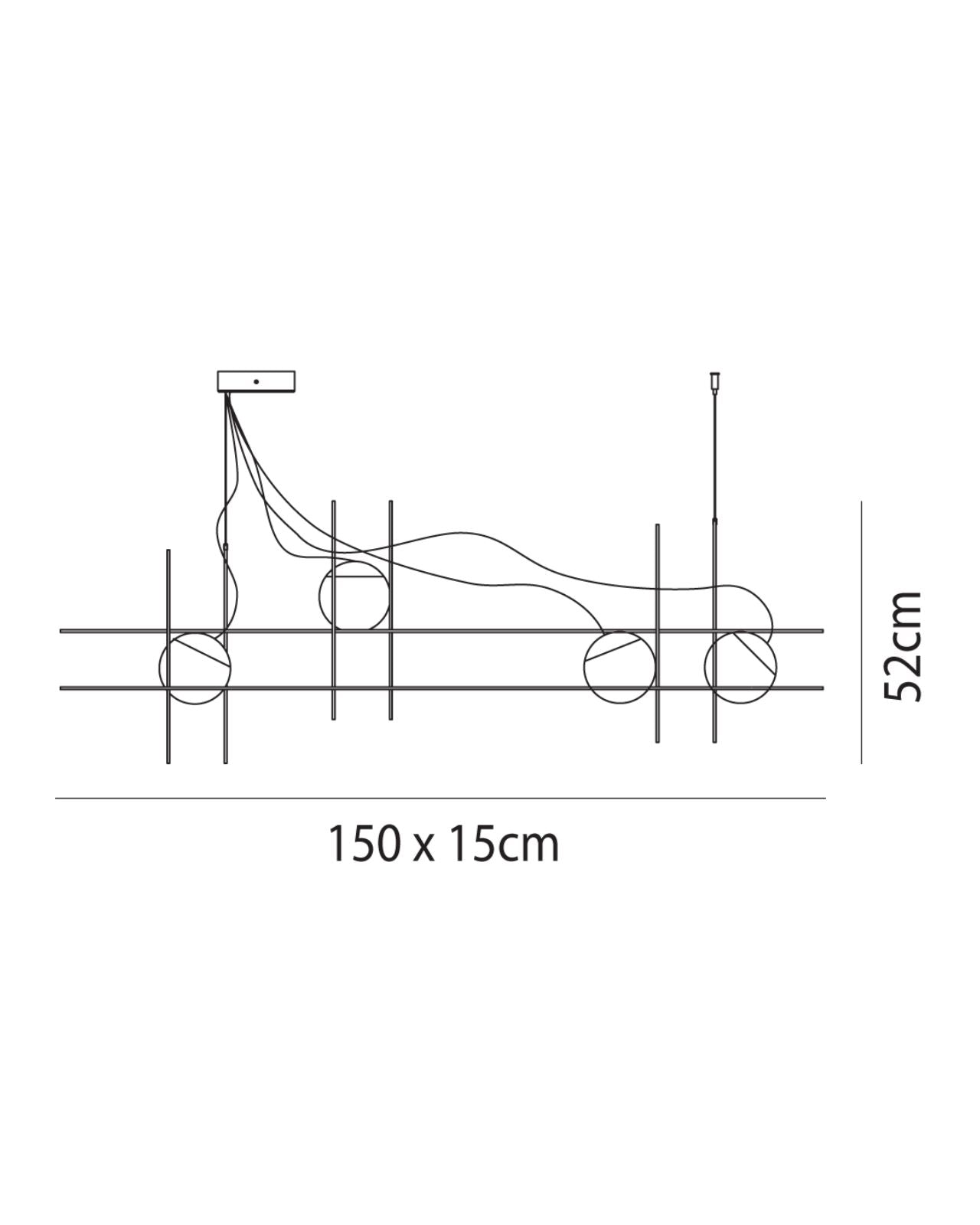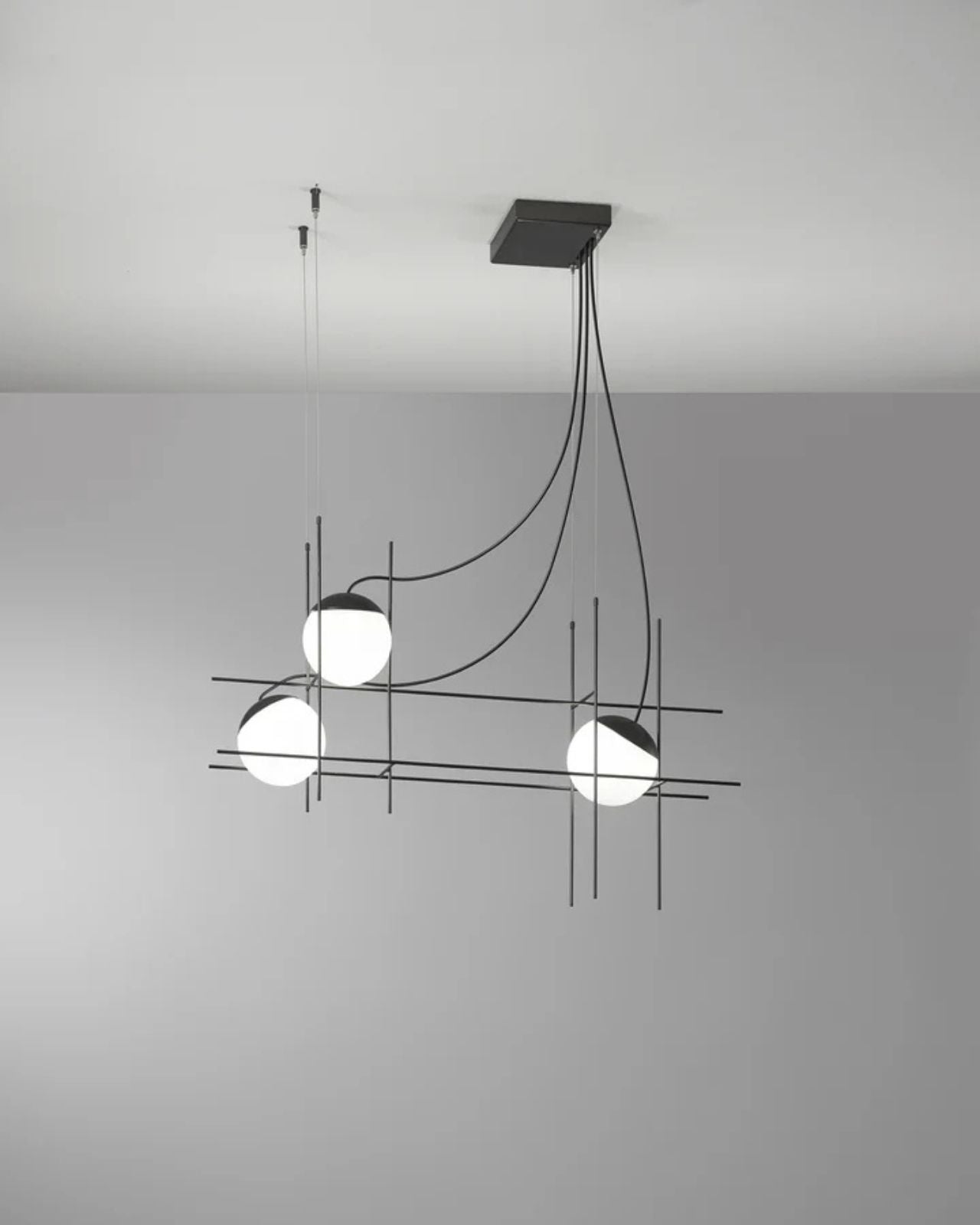 Handmade in Italy the design focus of this fitting is to create the illusion of light suspended in motion. Its linear weft crafted from Matte Black metal creates an exquisite form ideal for installation in high ceiling interior spaces over stairwells or dining areas. The capped blown glass white diffusers house a built-in LED source creating a focal point that will illuminate any room. Available in 3 or 4 light variations.