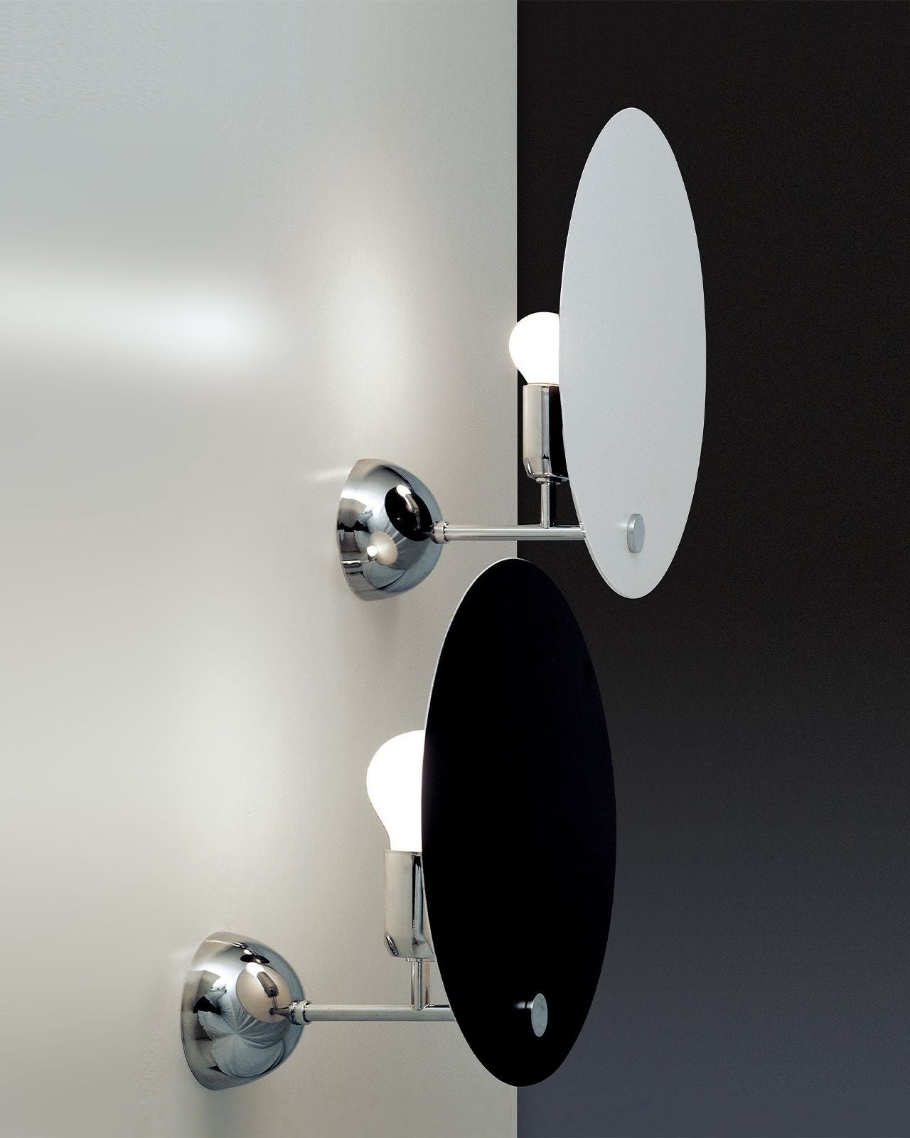 Designed by renowned Italian architect Vico Magistretti this indirect wall light plays with light and shadow combining geometric rigour and simplicity. This fixture is composed of a small hemispherical base with a chrome finish and a slender metal stem on which is fixed the light source and an aluminium circular reflector. The reflector is available in a white or black finish and provides a diffused illumination remenicent of a solar eclipse creating an inviting atmosphere that will suit modern corridors, contemporary living rooms or mid-century bedrooms.