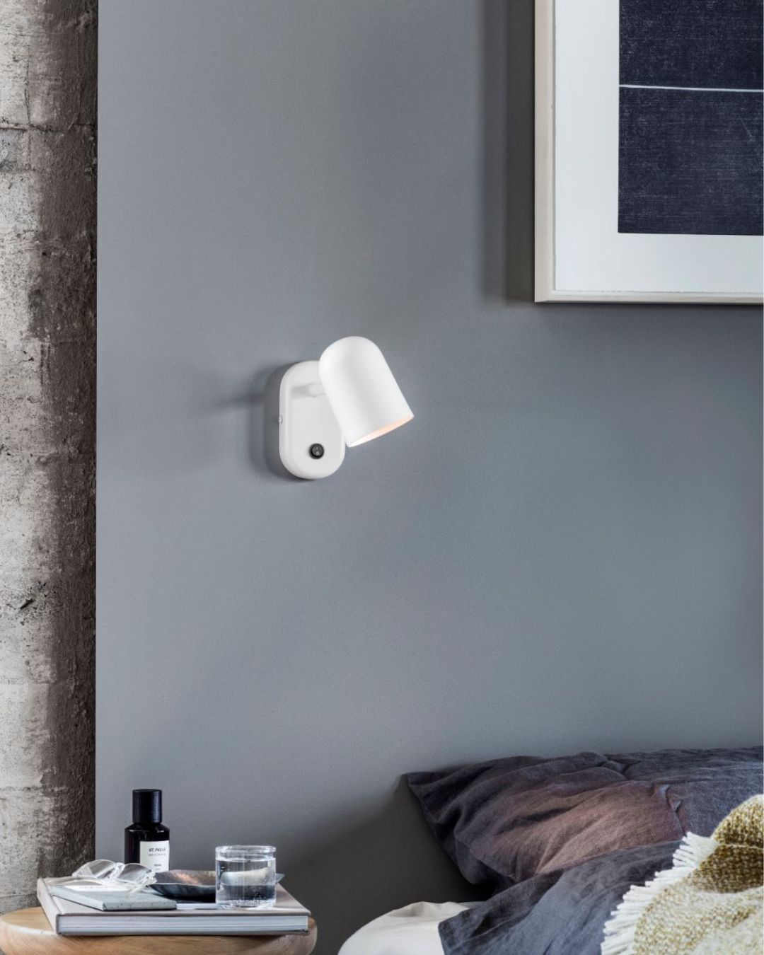 White wall-mounted lamp with a single adjustable head on a light gray background | Lighting Collective
