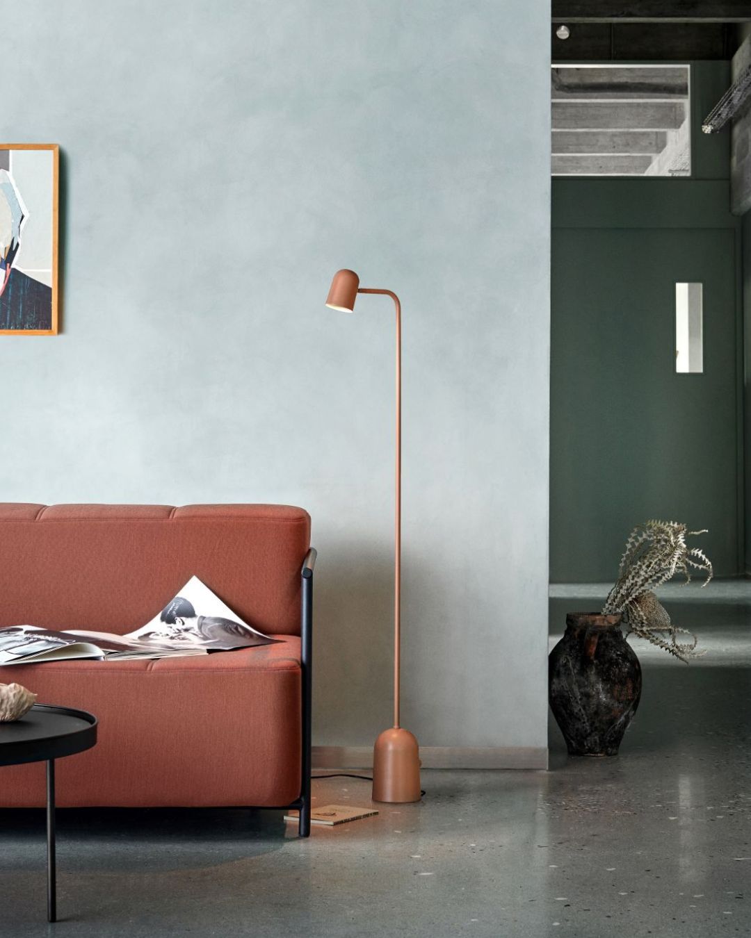 Modern living room with a red sofa, floor lamp, and a Tall Scandinavian Floor Lamp