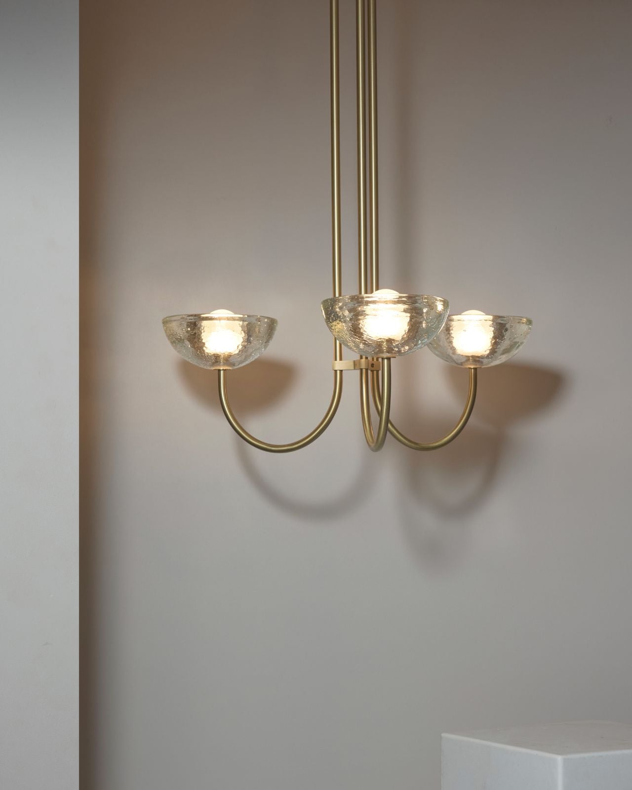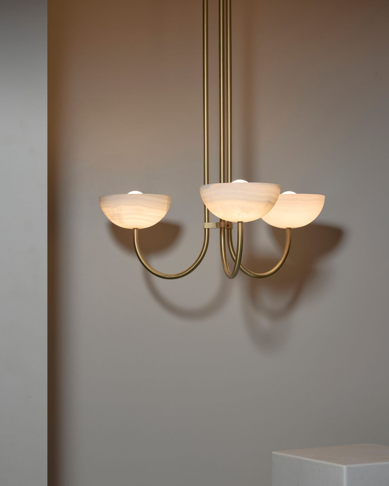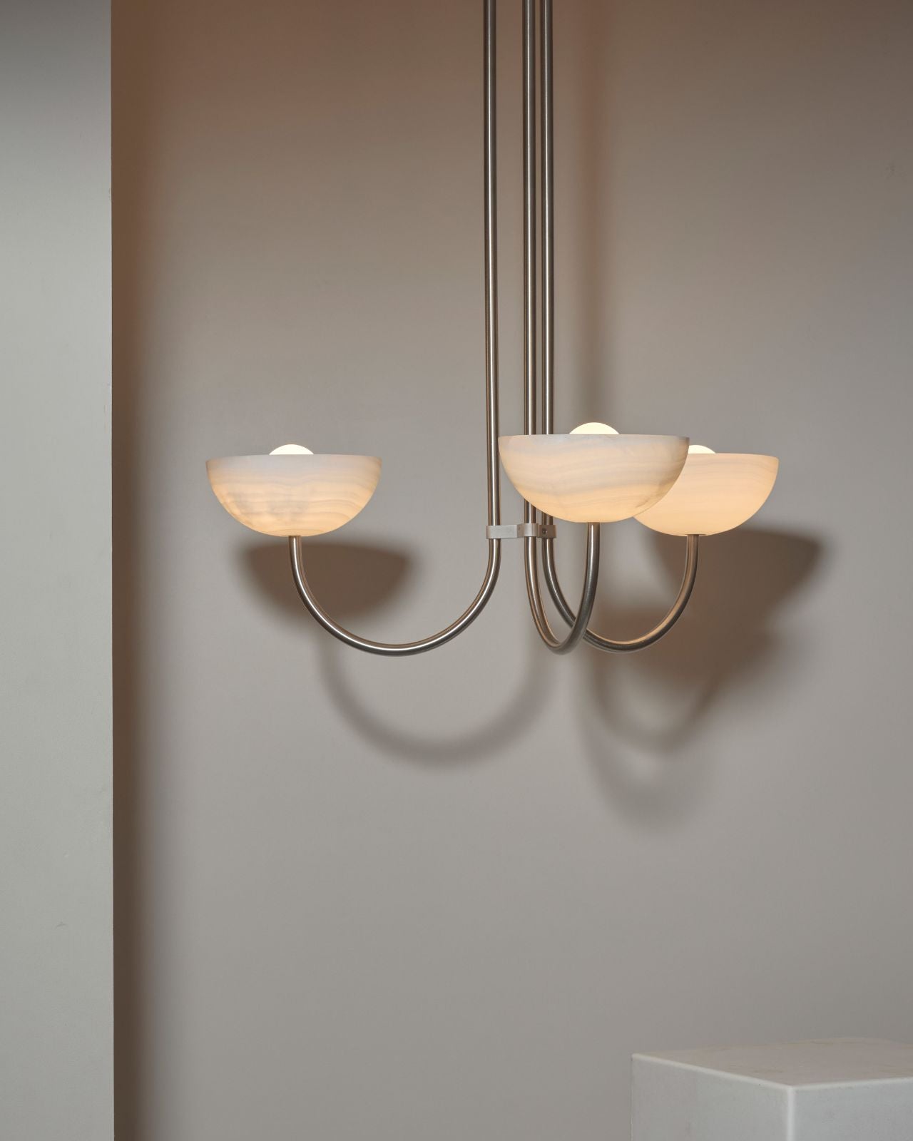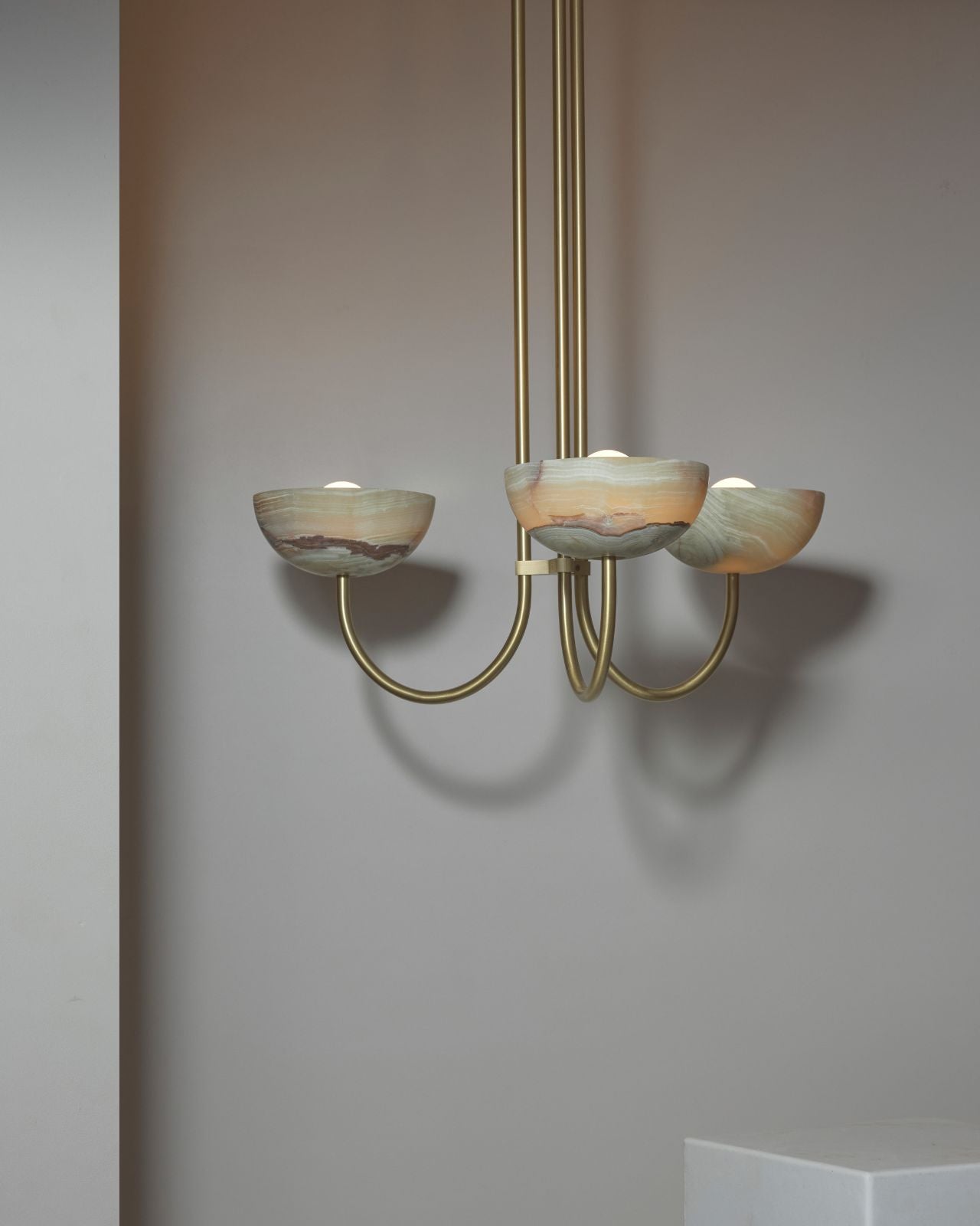 This triple dome pendant is a contemporary version of a classic chandelier with shades turned upside down for stunning soft illumination. This fixture is made from glass, jade or white onyx and is paired with solid metal rods available in four finishes, brass, brushed black, brushed nickel or satin white and two different sizes. Ideal in living rooms, dining rooms or restaurants, this pendant will bring a celestial and refined touch to the surroundings.