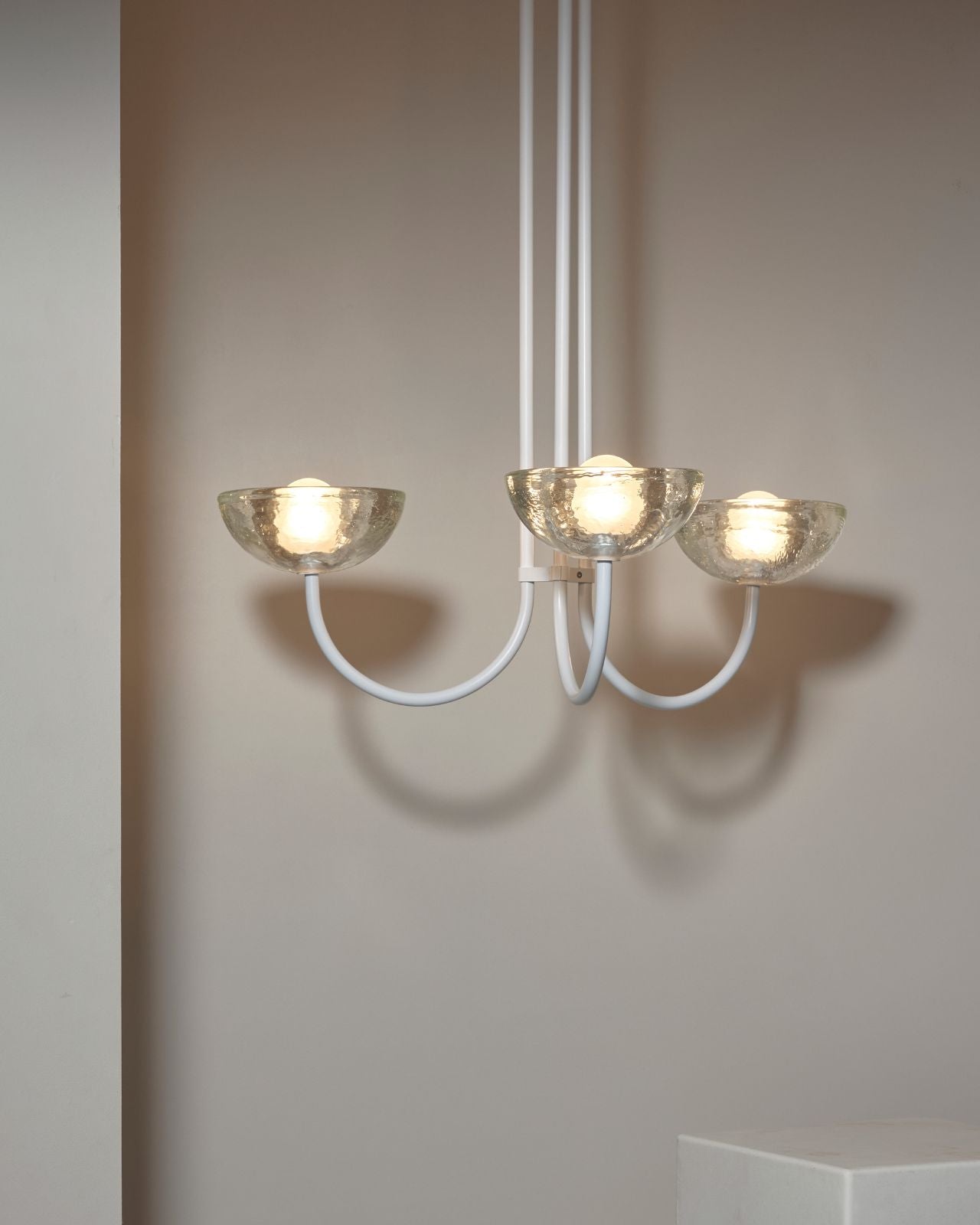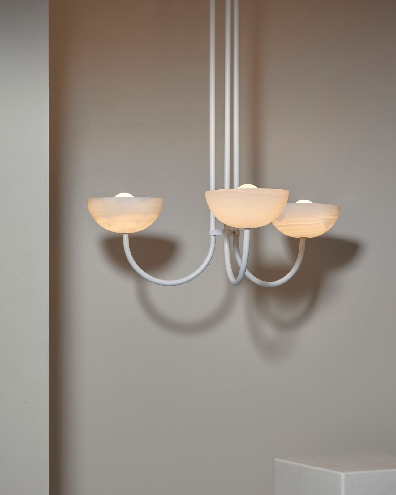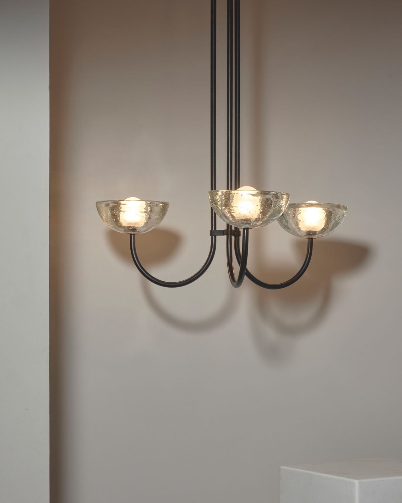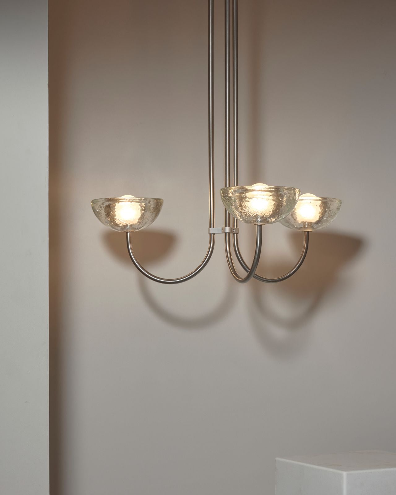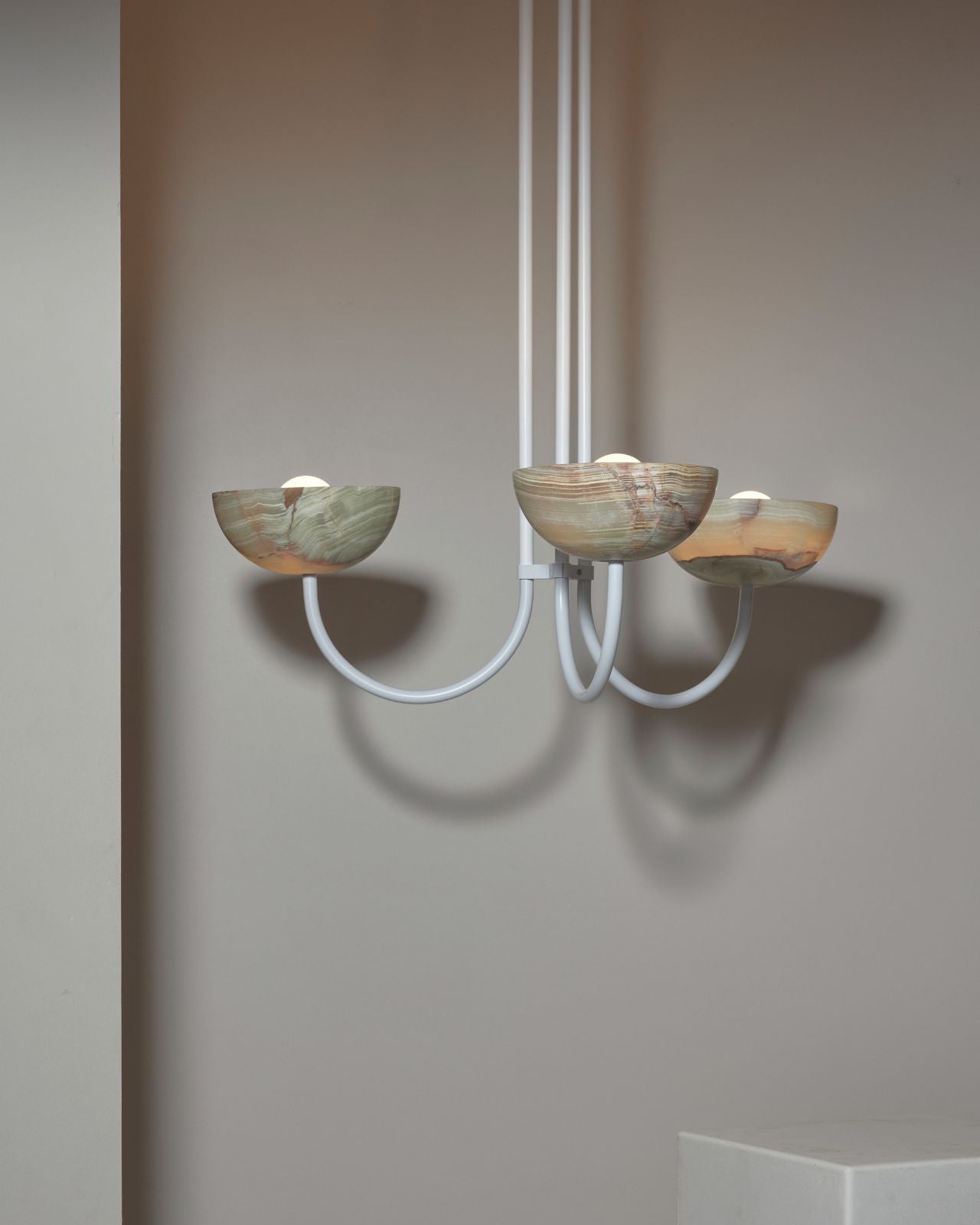 This triple dome pendant is a contemporary version of a classic chandelier with shades turned upside down for stunning soft illumination. This fixture is made from glass, jade or white onyx and is paired with solid metal rods available in four finishes, brass, brushed black, brushed nickel or satin white and two different sizes. Ideal in living rooms, dining rooms or restaurants, this pendant will bring a celestial and refined touch to the surroundings.