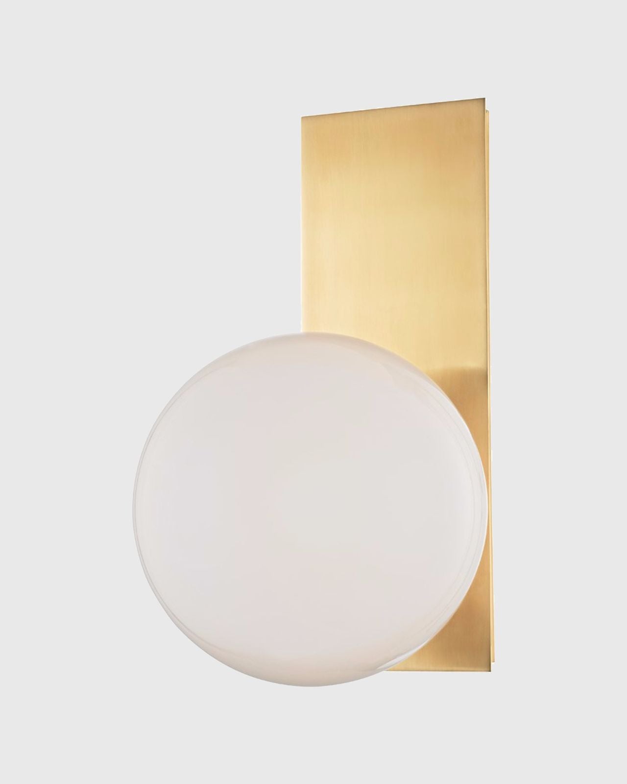 The playful Frosted Orb Wall Light has been designed to complement a number of interiors with its minimal design. Its hand-blown glass orb is seamlessly fixed to a rectangular backplate available in Aged Brass.