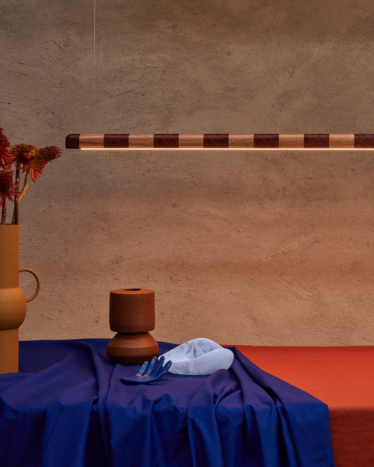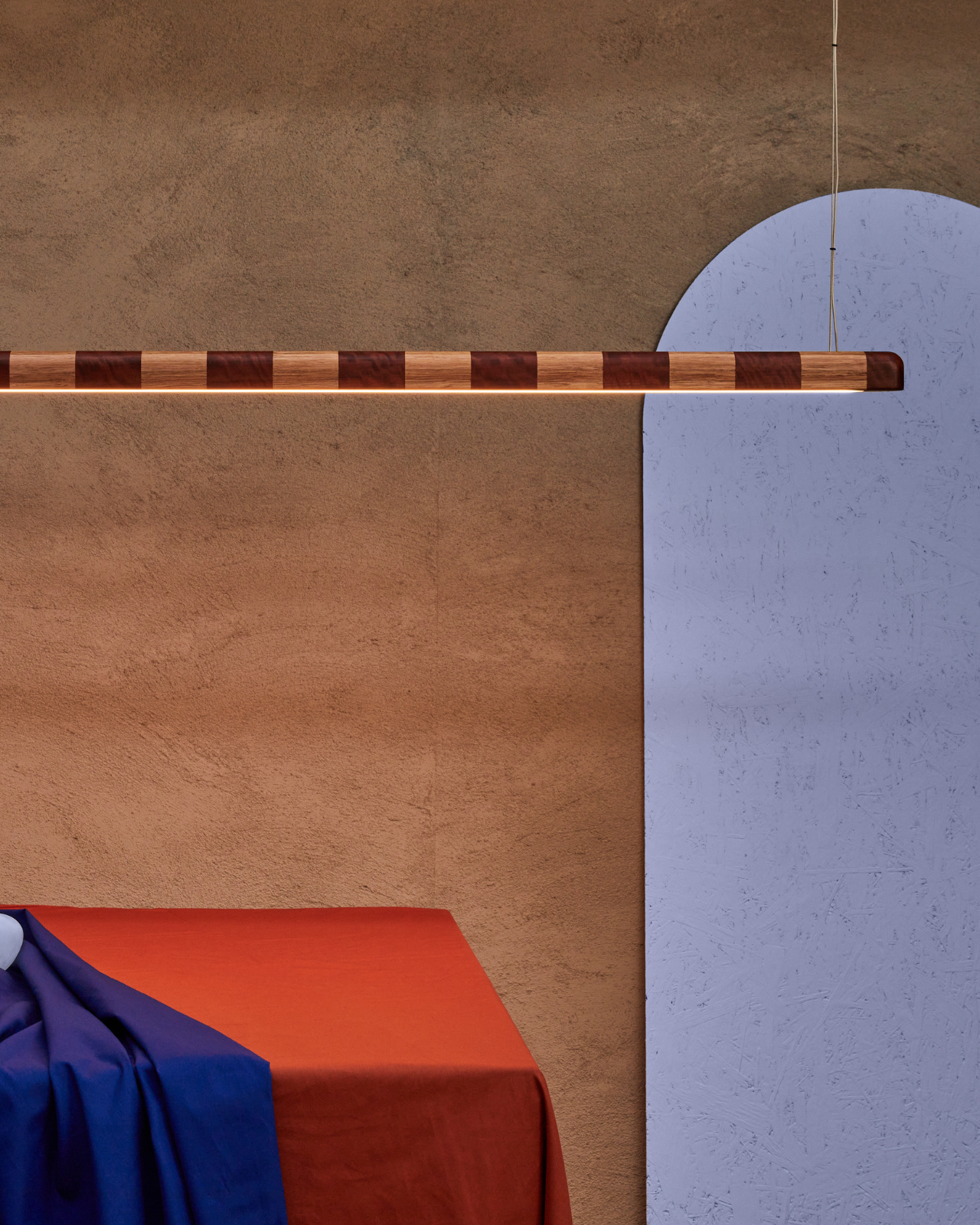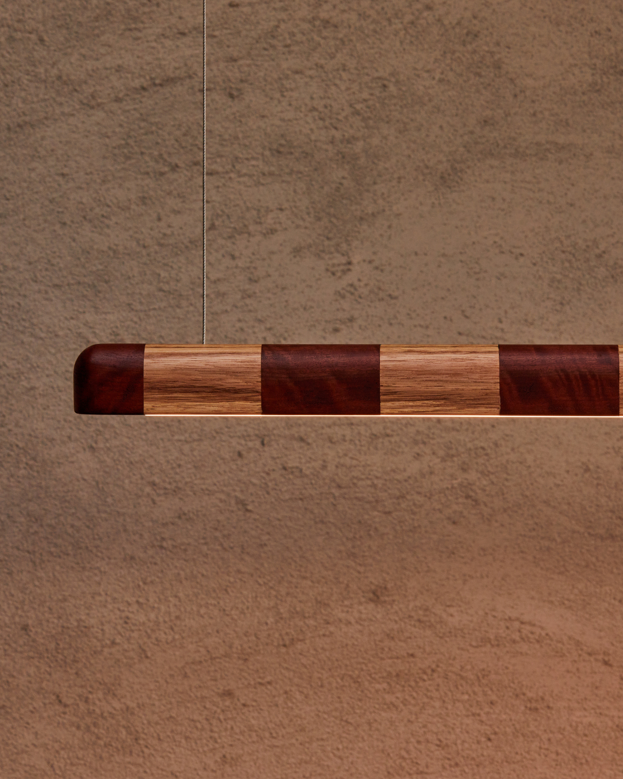 The Kich Pendant Light is a linear statement piece defined by its striped hardwood design and refined proportions. Handcrafted in Geelong from locally sourced Australian timbers, it features alternating tones of contrasting wood that create a bold, rhythmic pattern across its surface.