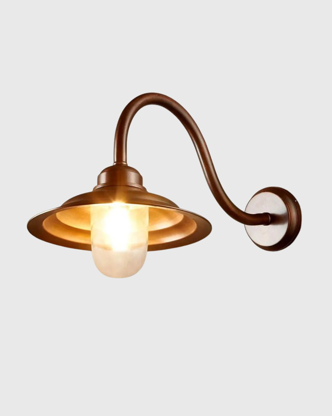 The Exterior Gooseneck Wall Light features a traditional farmhouse-style silhouette, available in Dark Brass or Antique Silver. With a clear glass shade connected to the main shade, the lightbulb is protected while the light is slightly diffused, adding a modern touch to the fitting. Ideal for exterior application, this wall light has an IP54 rating, making it perfect for entryways and patios.