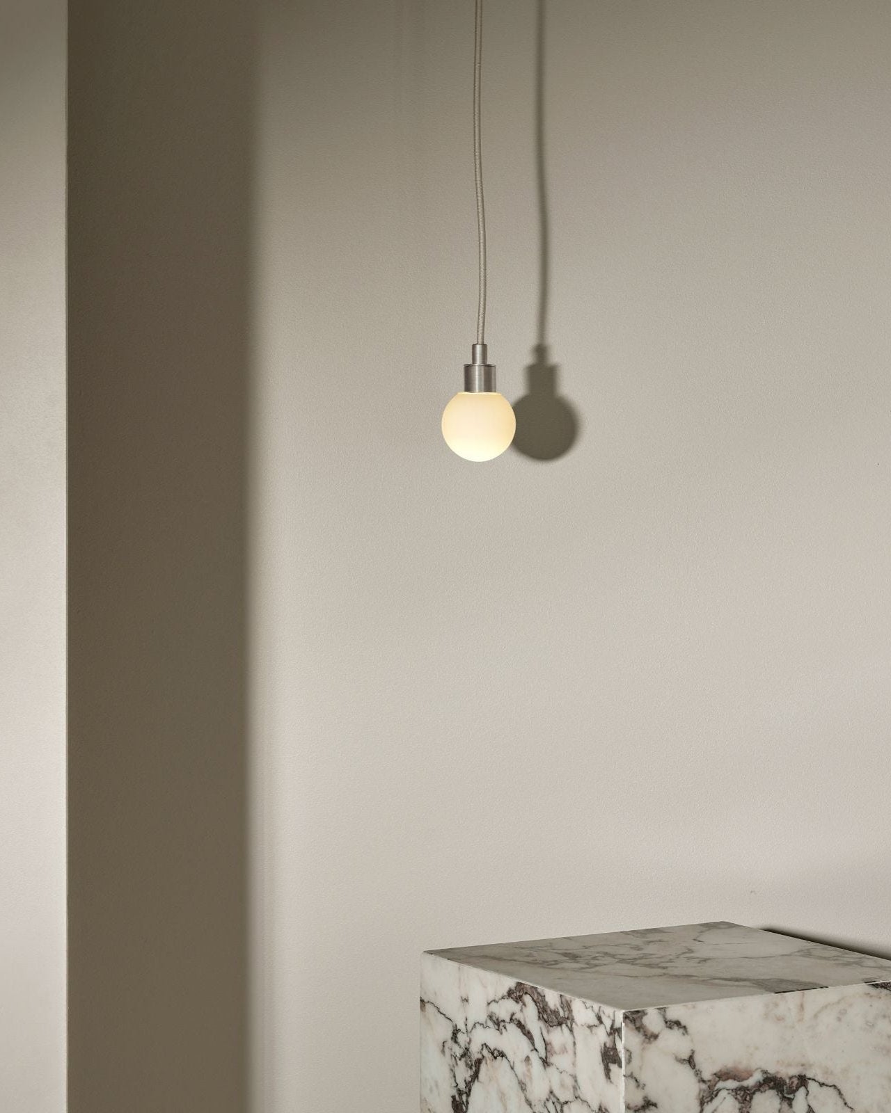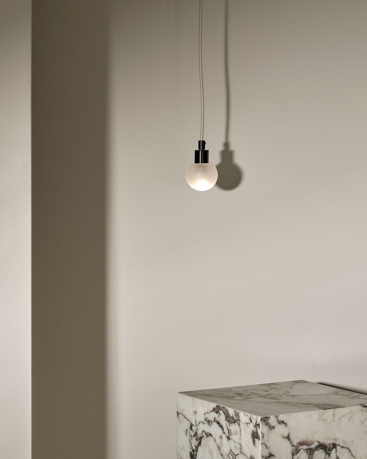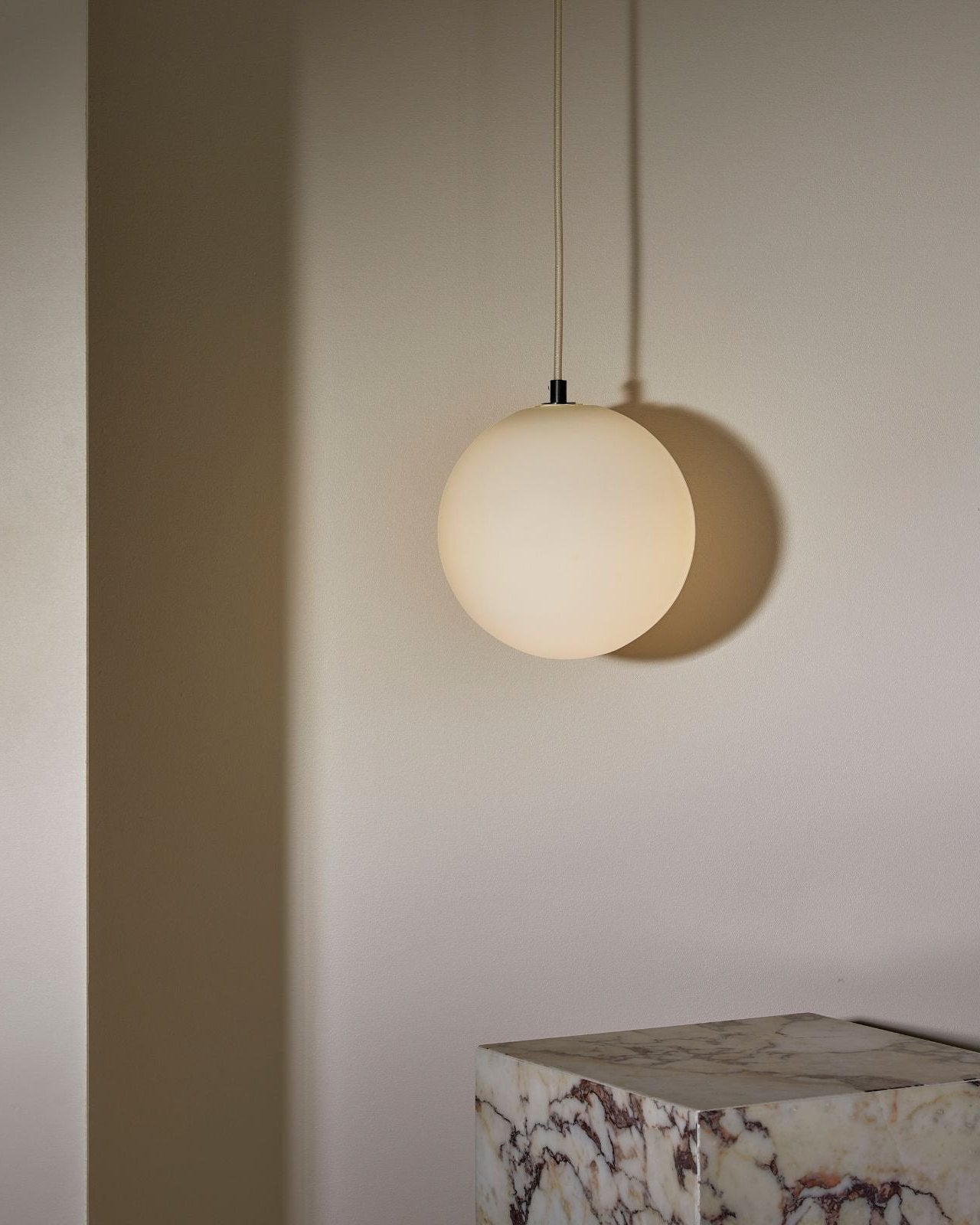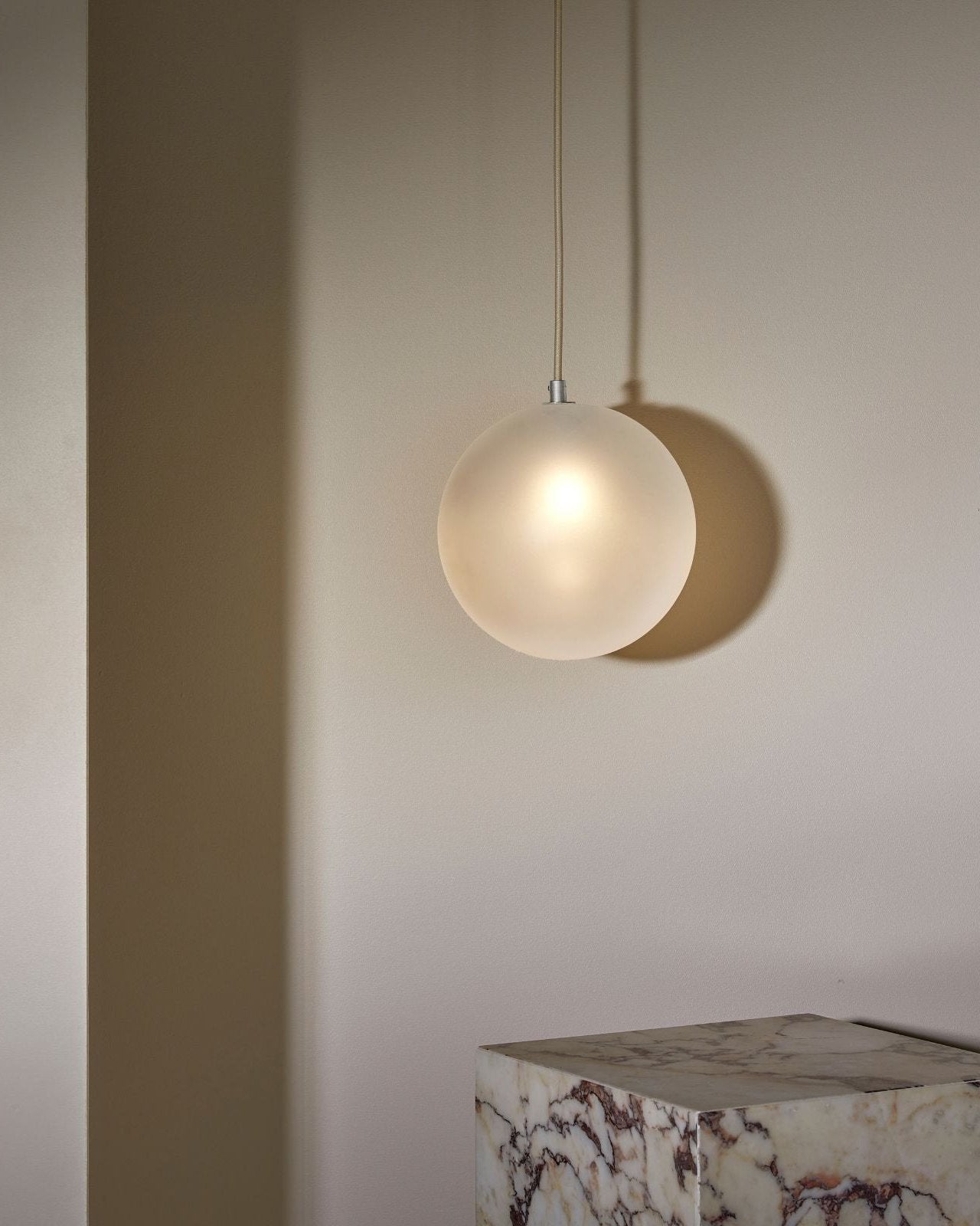 Suspended by a flex beige fabric cord, this spherical aerial pendant will make a statement in a living room, entrance hall, bedroom or even bathroom. IP44 rated and dimmable, it is suitable for damp areas and it help create the most suitable light ambience, from cosy to bright. The simple and compact shade is available in three sizes and is made from glass, with a clear frosted, white frosted or opal finish. Combined with a minimalist metal mount available in brass, brushed black or satin white, it will bring a pleasant elegant touch to classic or modern interiors.