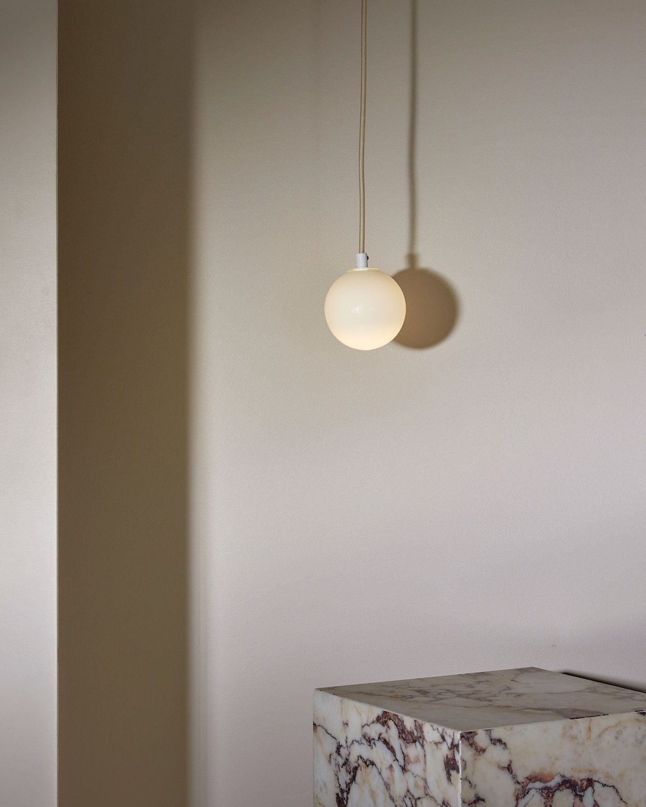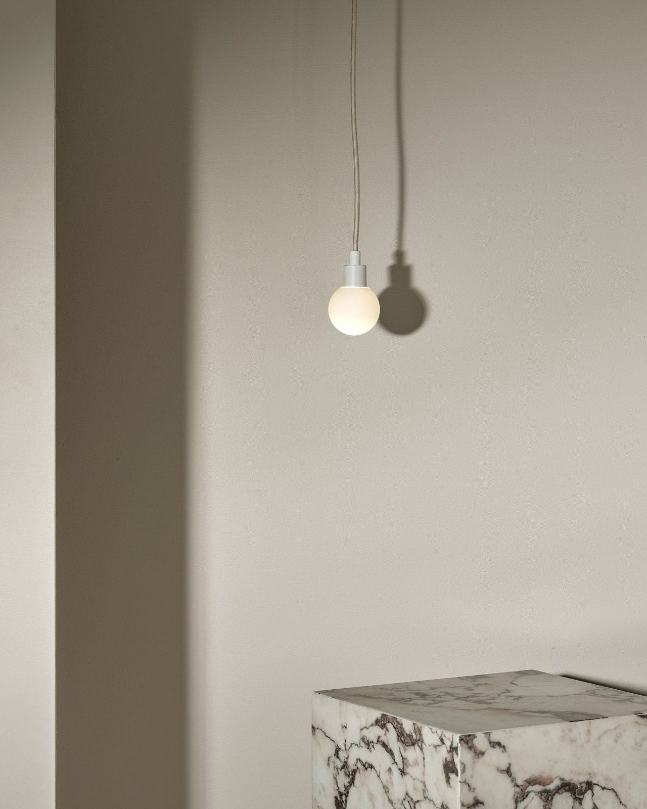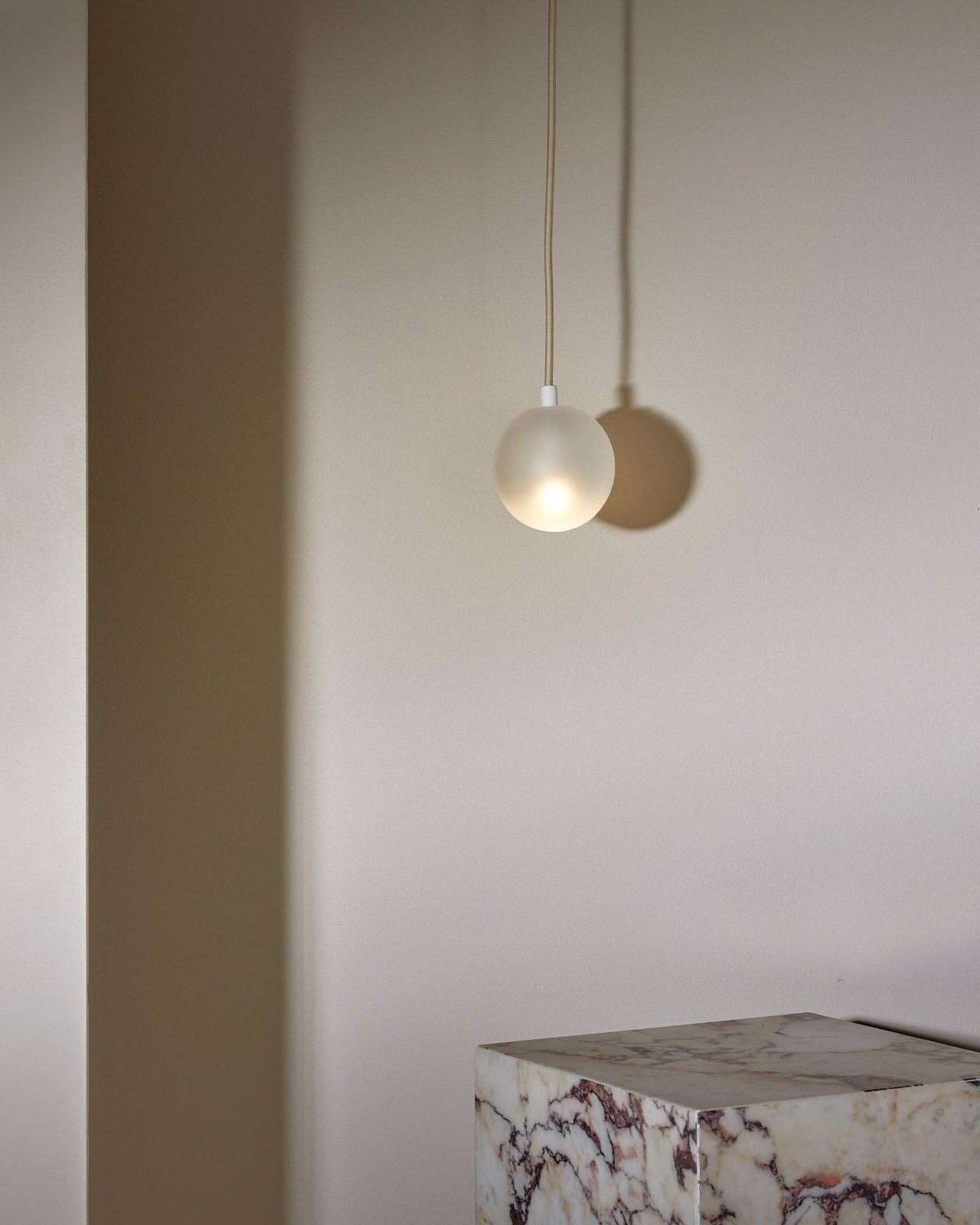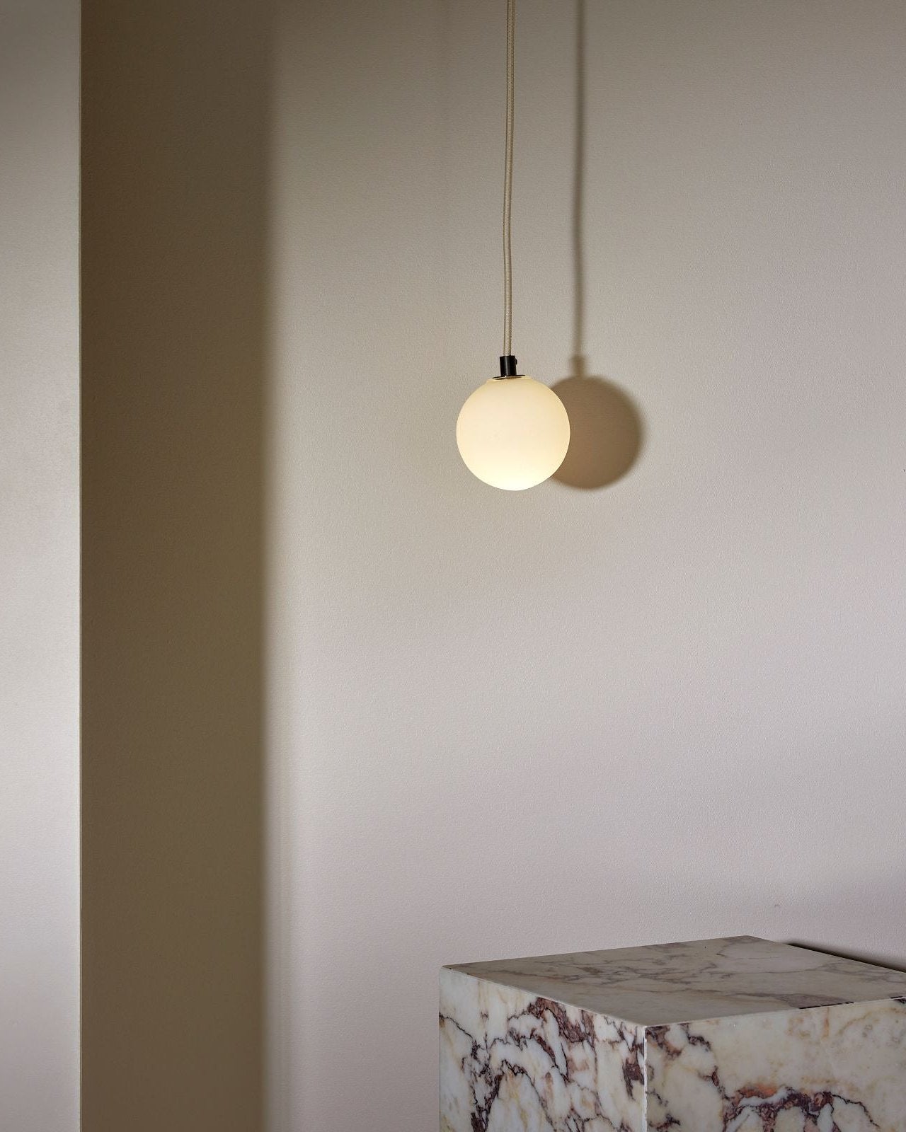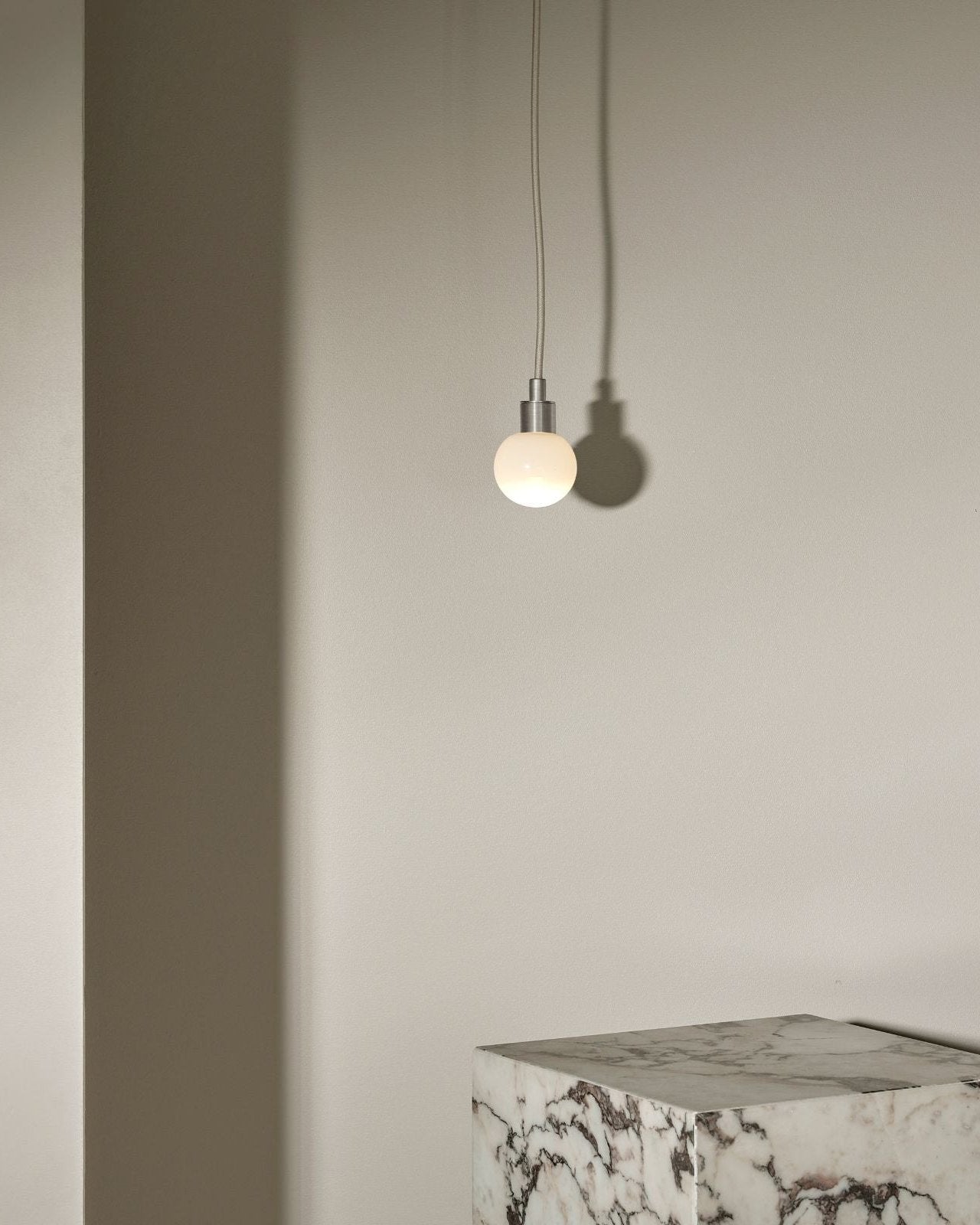 Suspended by a flex beige fabric cord, this spherical aerial pendant will make a statement in a living room, entrance hall, bedroom or even bathroom. IP44 rated and dimmable, it is suitable for damp areas and it help create the most suitable light ambience, from cosy to bright. The simple and compact shade is available in three sizes and is made from glass, with a clear frosted, white frosted or opal finish. Combined with a minimalist metal mount available in brass, brushed black or satin white, it will bring a pleasant elegant touch to classic or modern interiors.