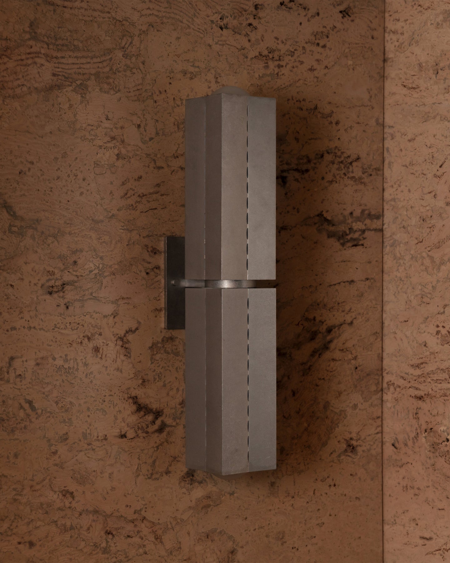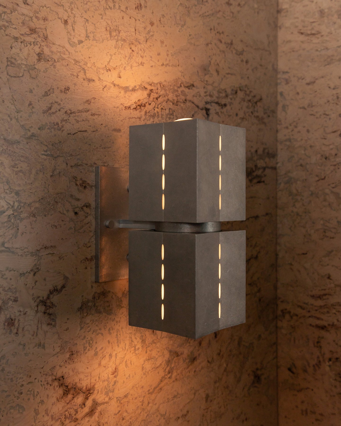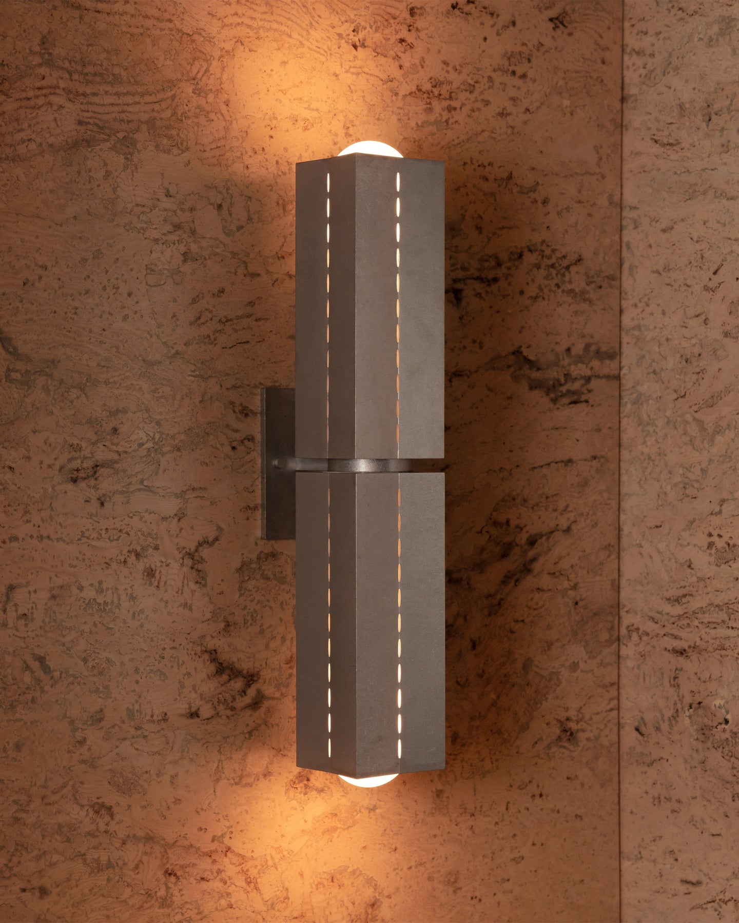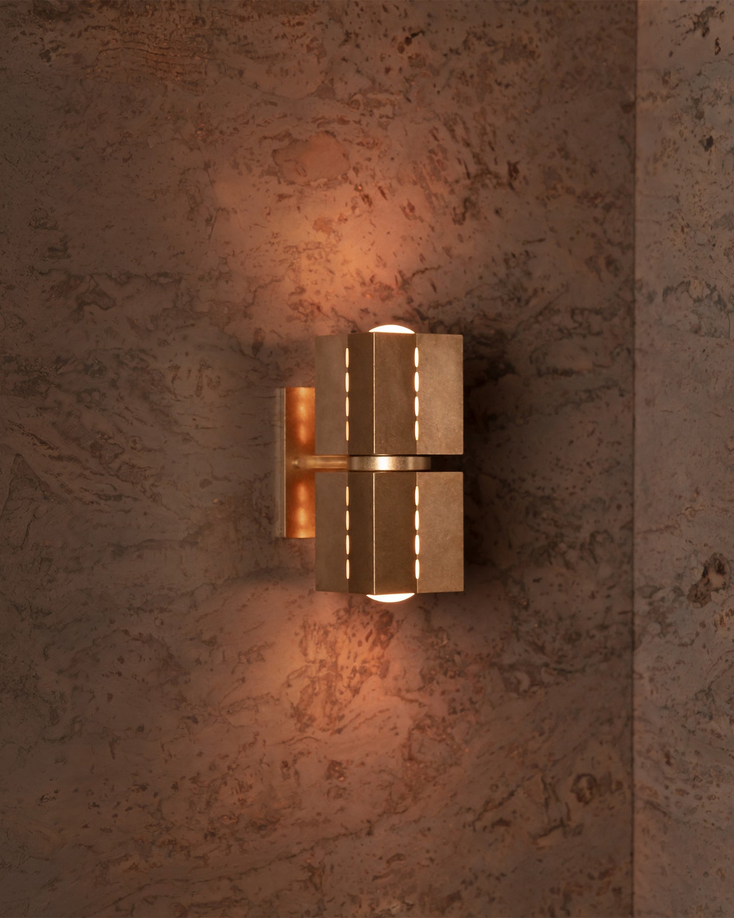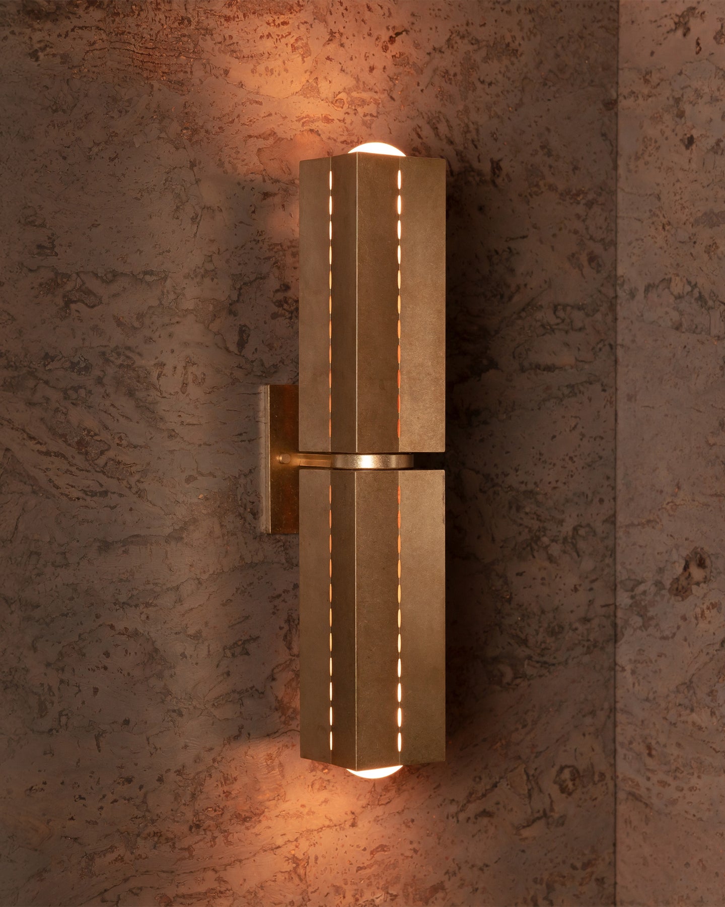 The Perforated Metal Wall Light | Polaris takes inspiration from Brutalist architecture and the guiding symbolism of the North Star. Defined by its geometric form and celestial illumination, this sculptural fixture features machined metal shades with fine linear perforations that create a striking interplay of light and shadow when illuminated.