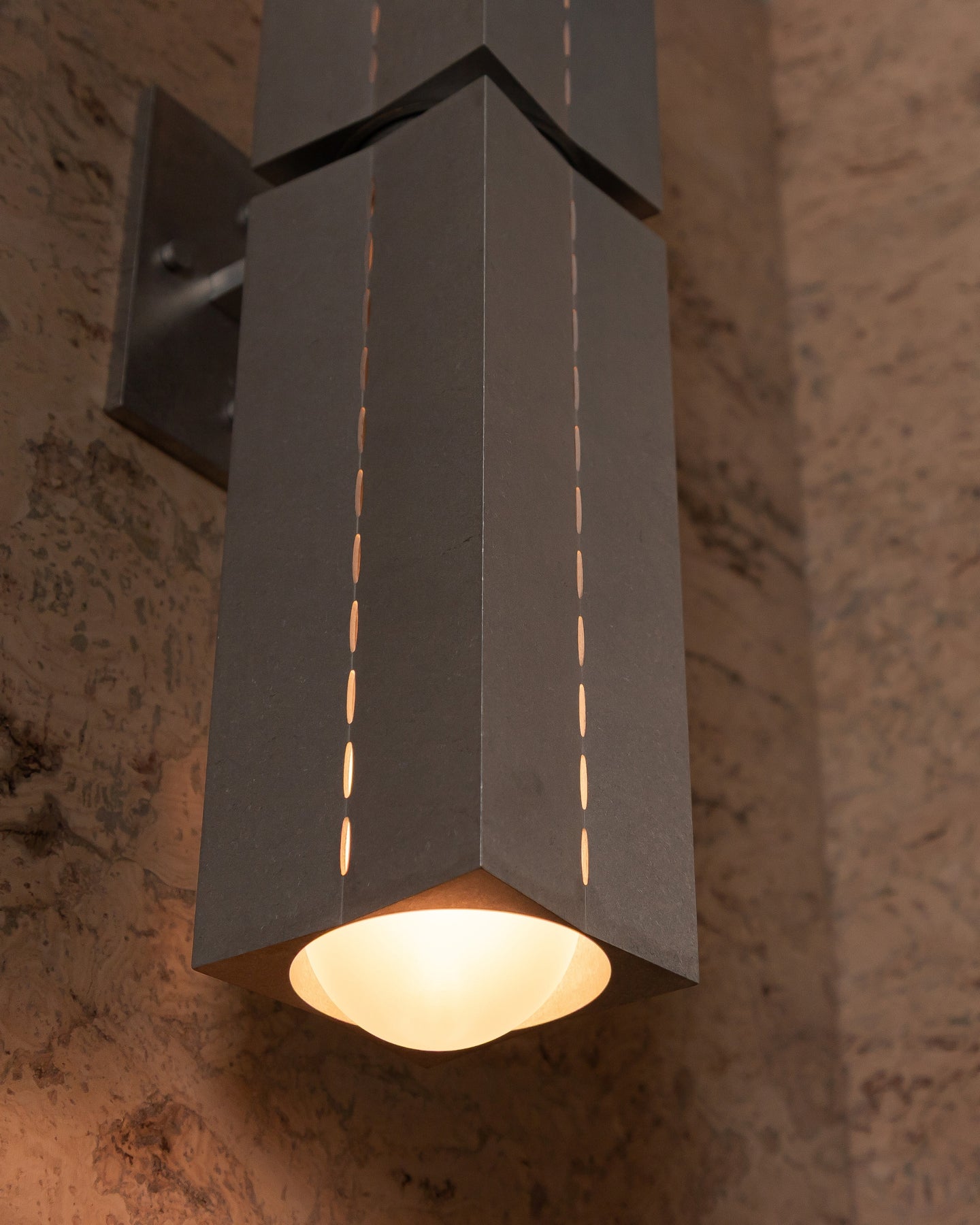 Modern wall sconce with geometric design on a textured wall.