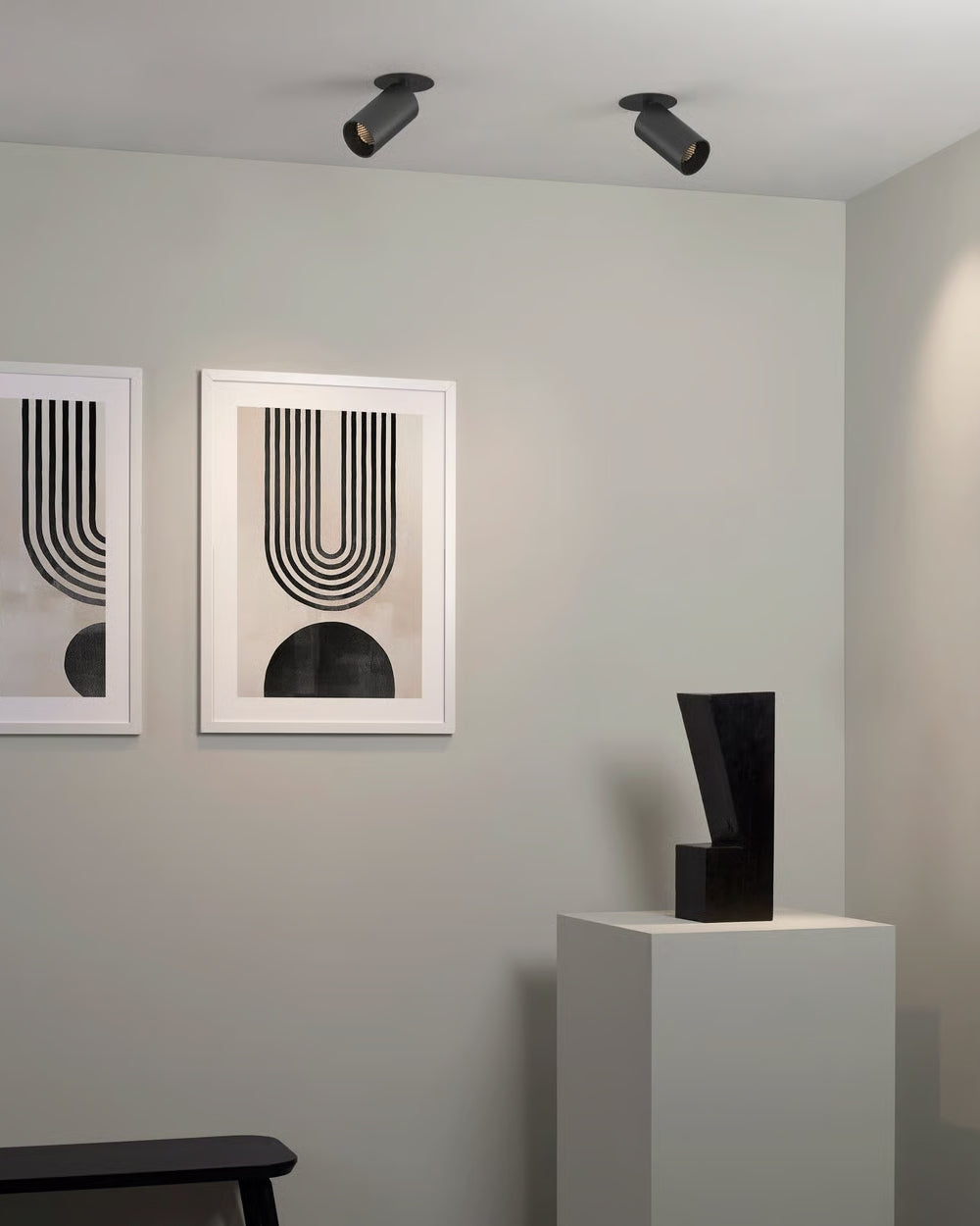 Two black spotlights with framed abstract artworks on a wall and a black sculpture on a white pedestal.