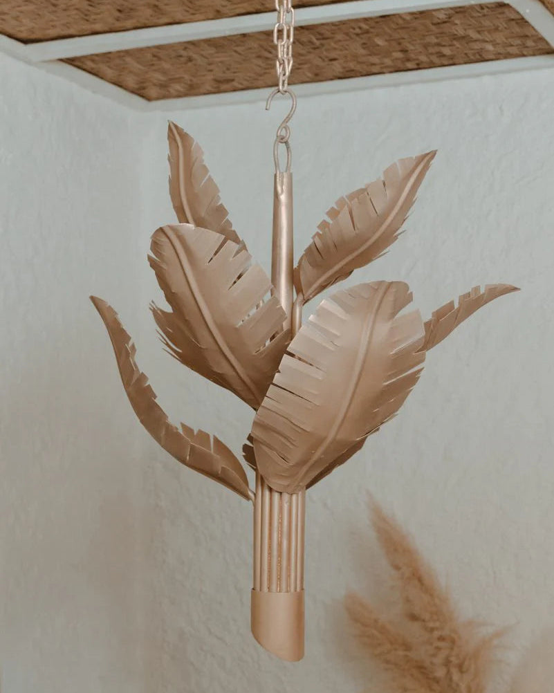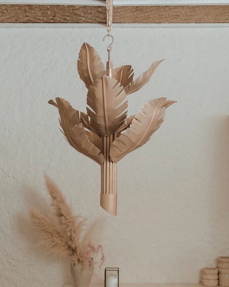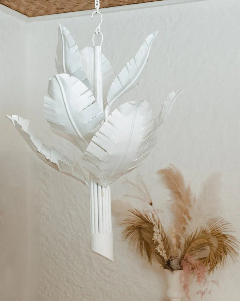 Inspired by nature and in particular by banana trees, this handmade pendant light is available in a champagne or a white finish. This stunning light will bring a coastal luxe feel to any home reminiscent of warm weather and summer breeze. The hanging lamp features 6 bright lights and is made from double powder-coated and stainless steel.