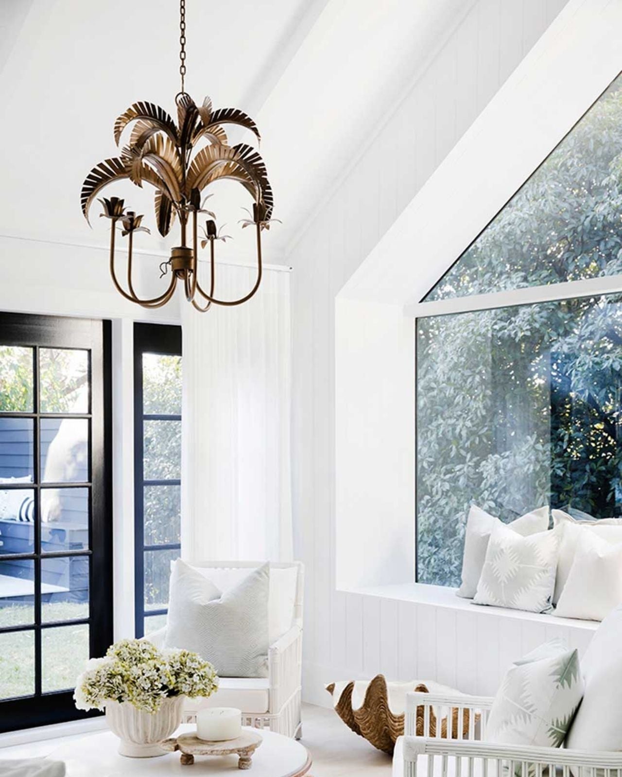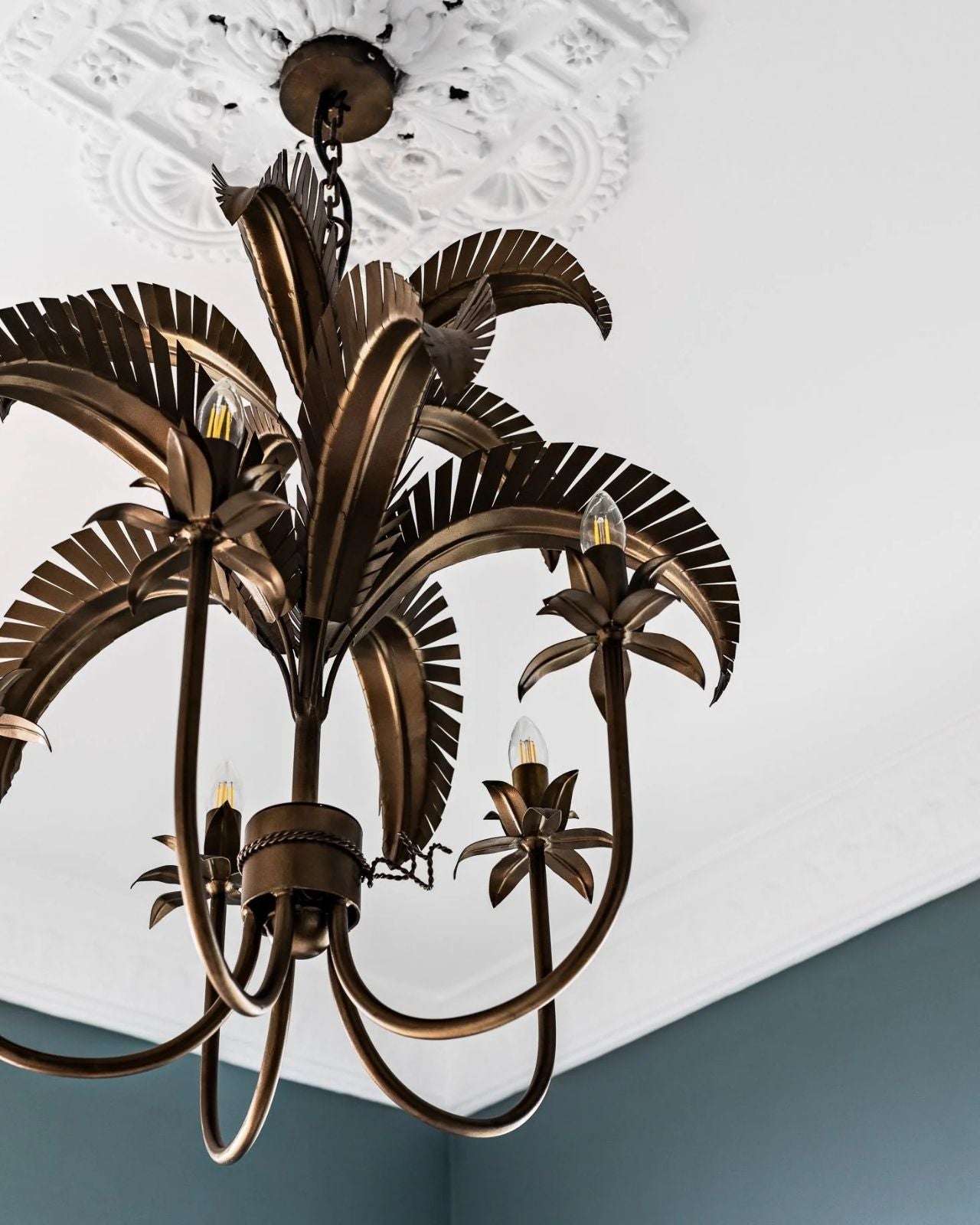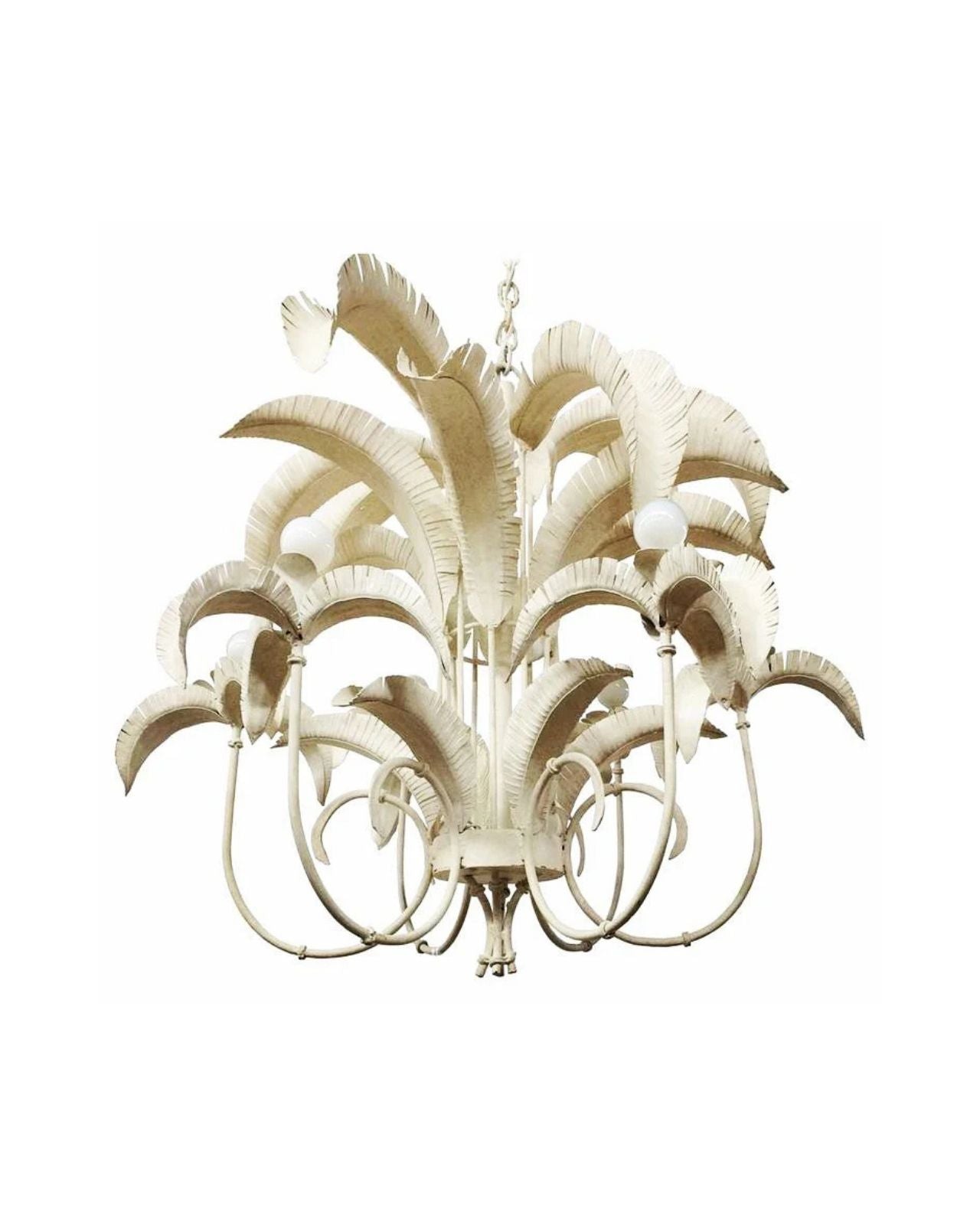 Coastal chic-inspired chandelier consisting of an iron shade with leaf blades suspended from a stunning 1m chain suspension. This quirky chandelier is available in three finishes and a matching Wall light.