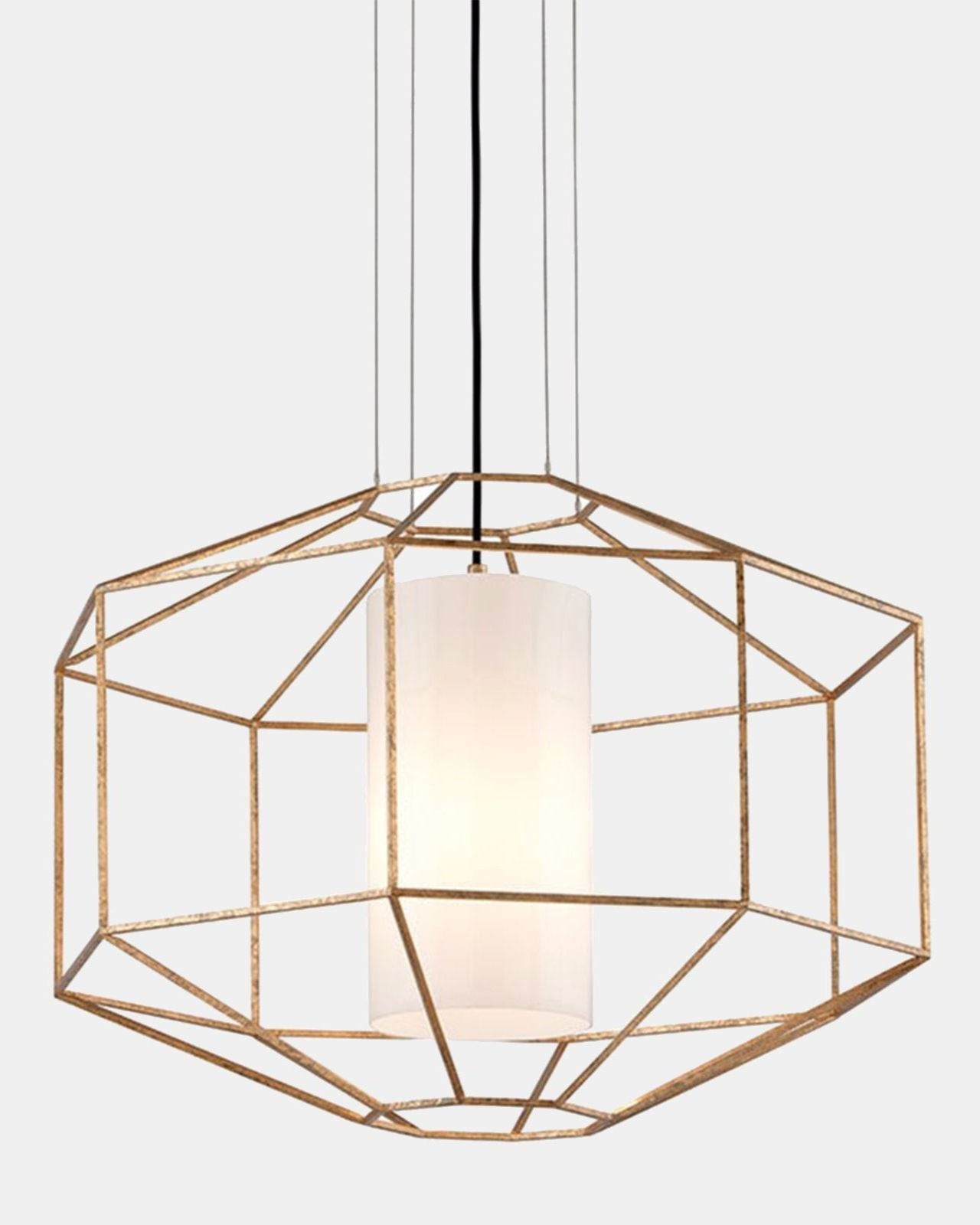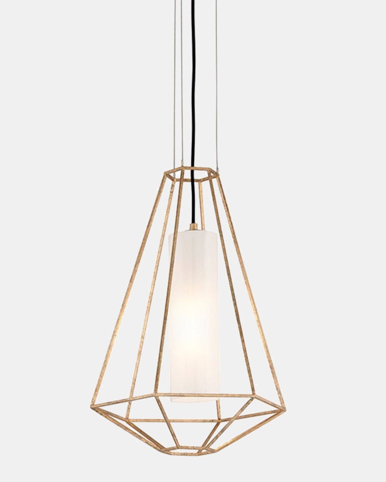 The simple geometric aesthetic of this Gold Leaf fitting is perfectly suited for application within modern interiors. Used as accent lighting in smaller spaces or as a design focal point this fitting will enhance your interior. Available in small or large the metal frame of this fitting encloses a cylindrical glass diffuser proving beautiful illumination.