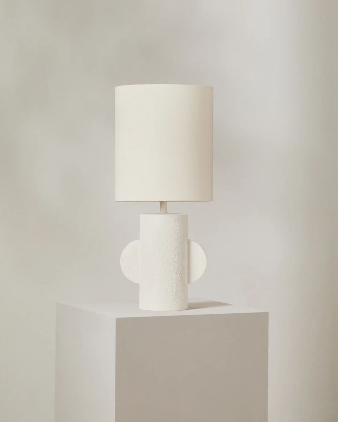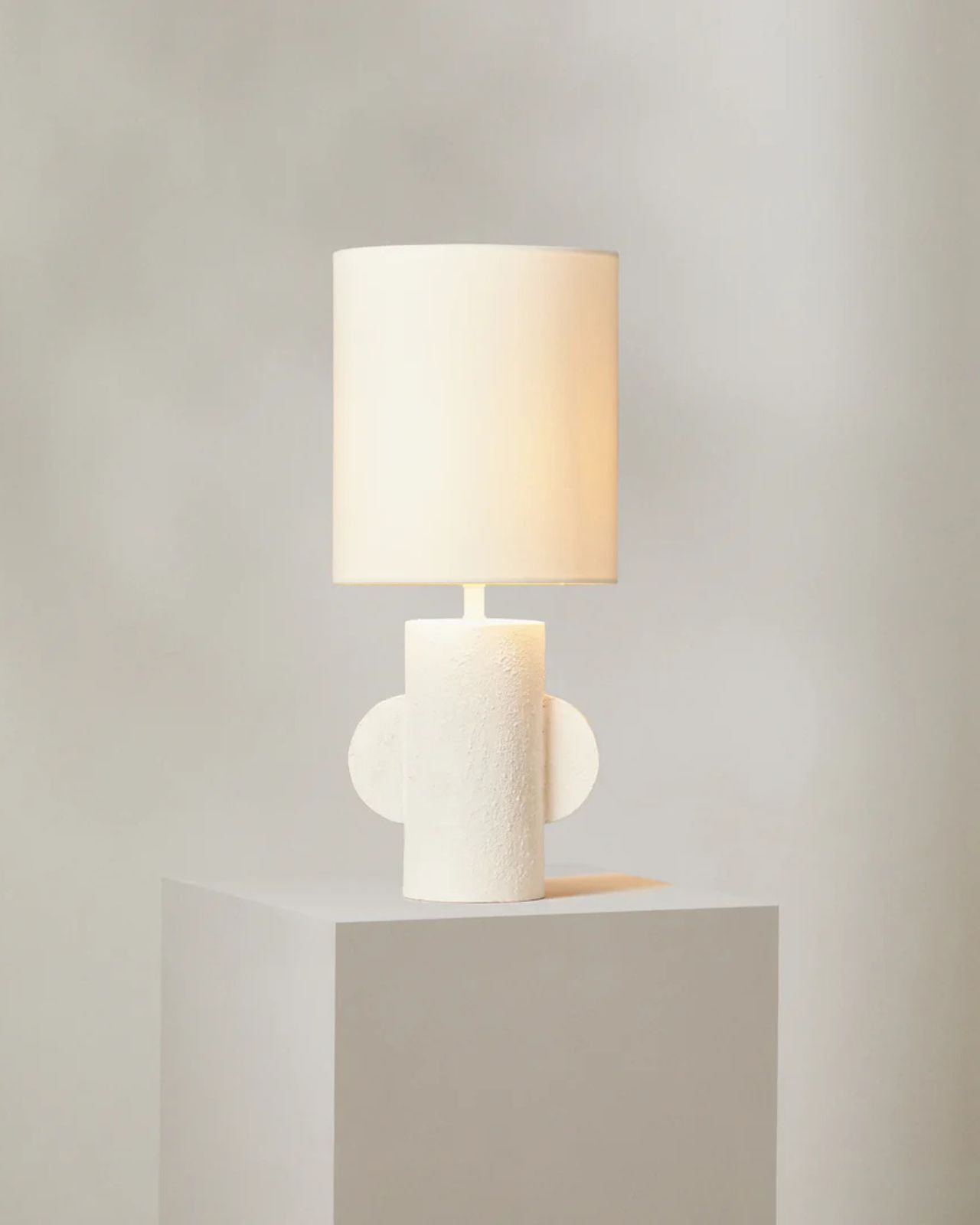 Inspired by the Greek Islands, the Handloom Shade Table Lamp will illuminate interiors with a soft, diffused light. Made from an iron base with a textural, white finish and topped with a tall shade made from Handloom this design is perfect to be placed atop a side table, hallway console or bedside table. Featured with an on/off switch located on the lamp's cord.