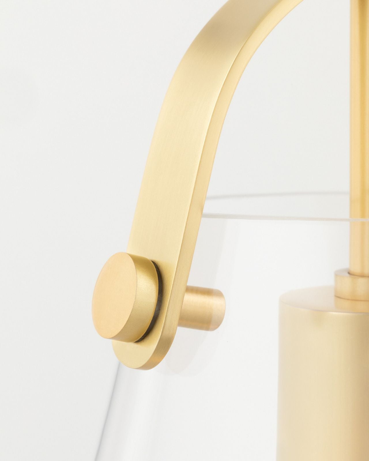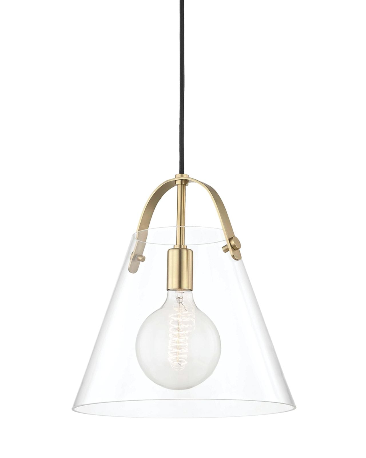 This stunning simplistic glass pendant boasts a translucent conical shade and metallic features. Creating a uniquely beautiful piece suited to a variety of spaces. Available in both small and large and with either aged brass or polished nickel. Cast shadows and soft lighting through an elegant filament bulb.