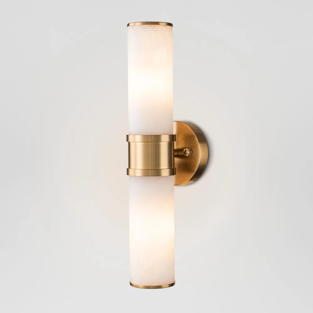 This wall light seamlessly combines the refinement of alabaster with the strength and sophistication of brass, resulting in a sleek and sophisticated design that will complement modern or traditional interiors. This fixture provides evenly distributed warm light in both upward and downward directions, creating a cosy and inviting ambiance.