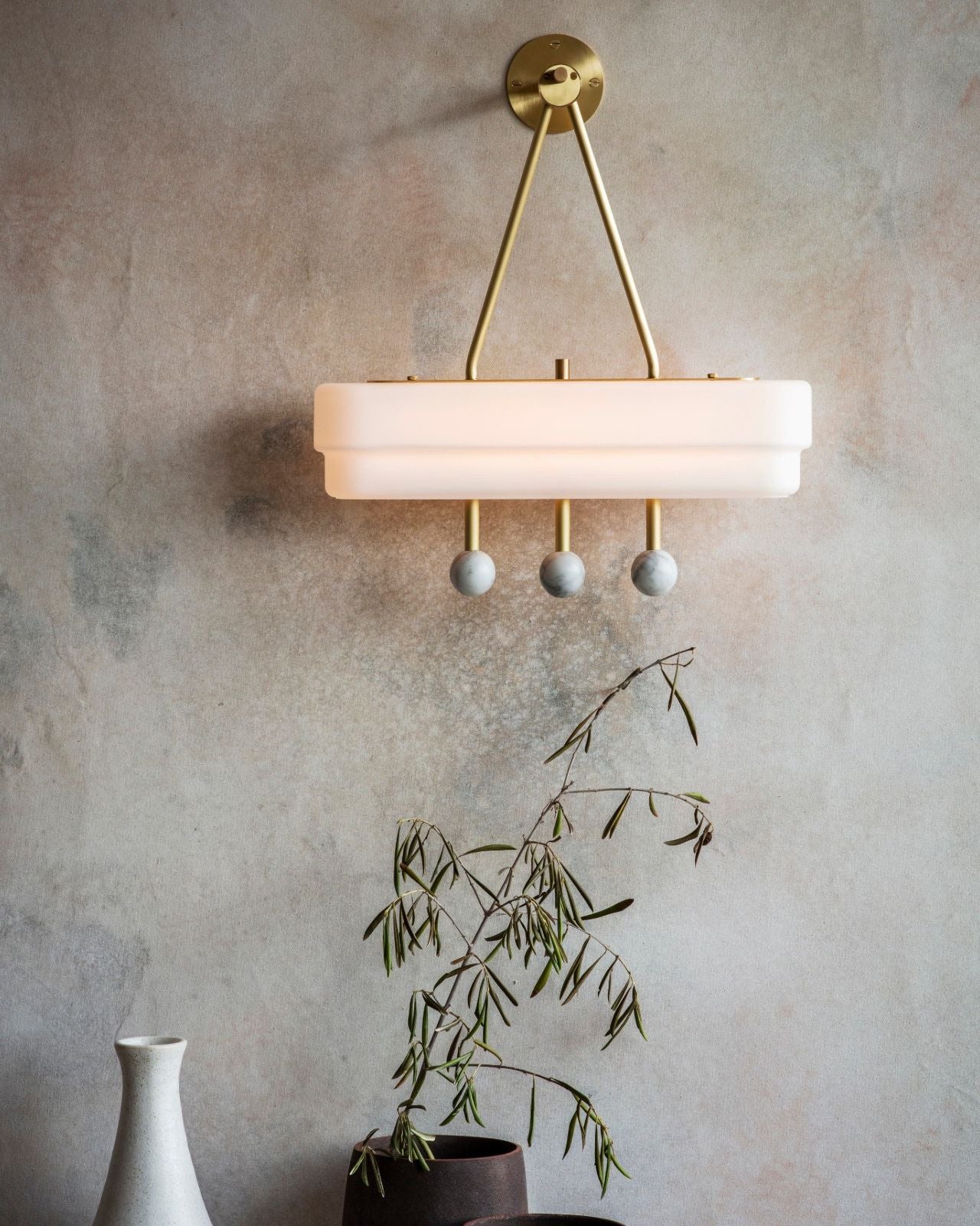 Inspired by jewel-like combining luxury elegance this wall light will be an eye-catching centrepiece in your interior space. Art-Deco design inspired, the Etched Opal Glass Wall Light features soft opal glass, and solid brass metal work and is finished with suspended luxurious marble spheres, to elevate your space through an artist statement when used in living rooms, or above an entry console table.