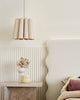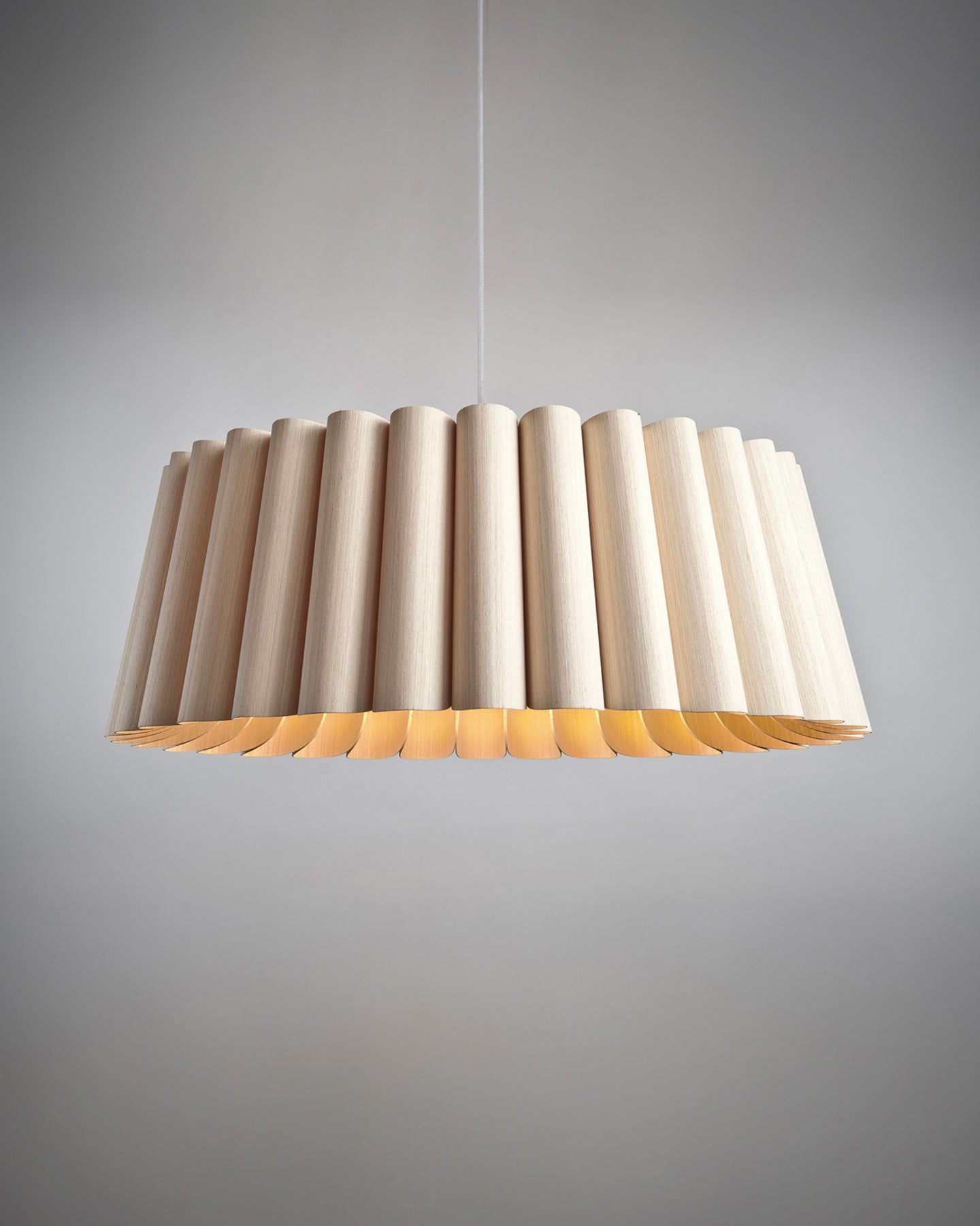 Modern pendant light with ribbed design on a gray background