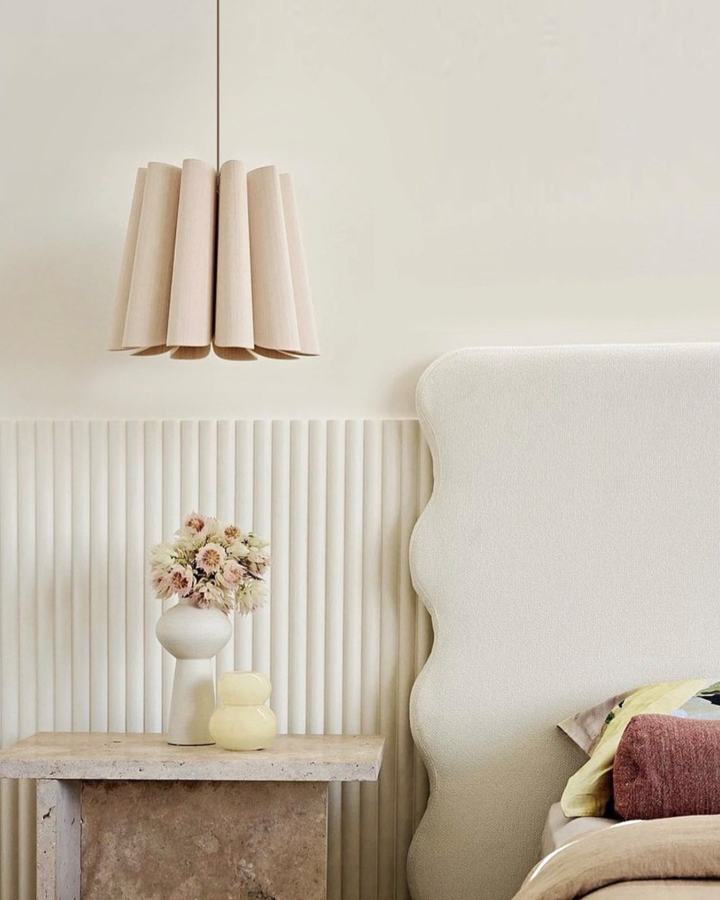 Decorative lampshade hanging above a table with a vase and flowers against a neutral wall.