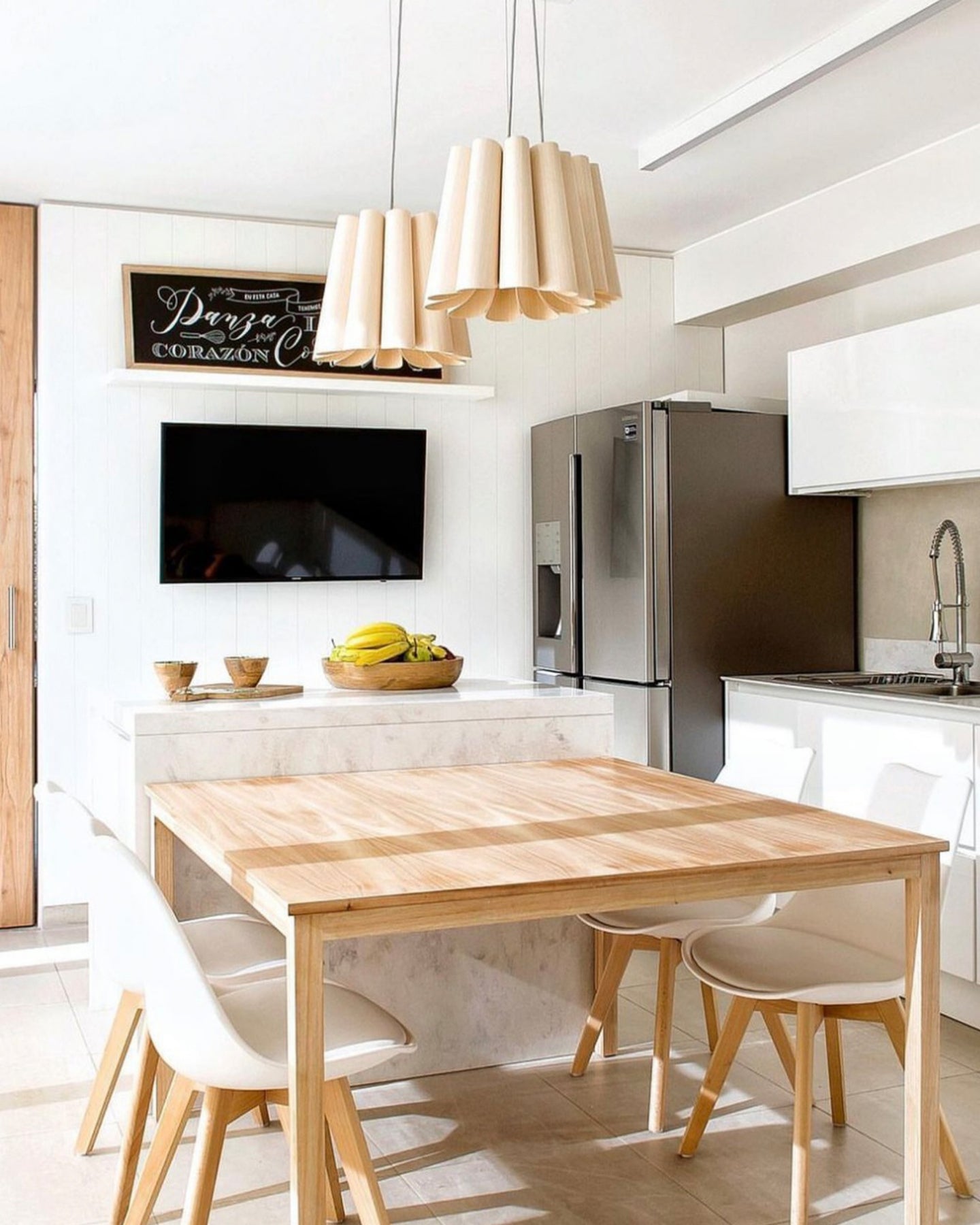 Modern kitchen with wooden dining table and chairs, stainless steel refrigerator, and pendant lights.