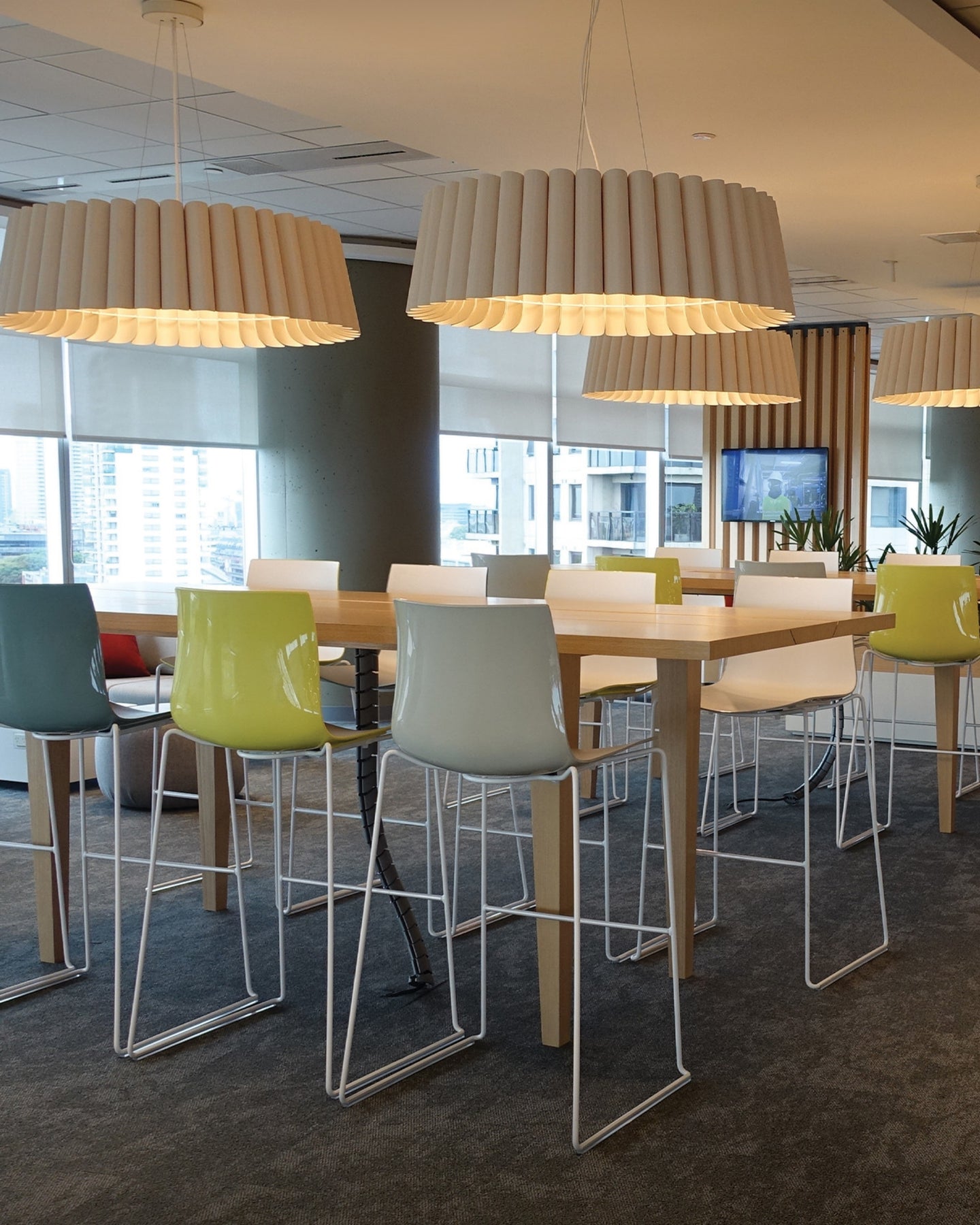 Modern office space with colorful chairs and pendant lights.