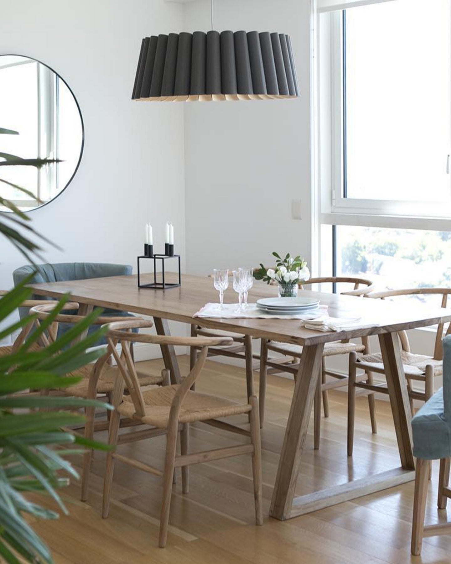 Dining room with wooden table and chairs, large window, and modern pendant