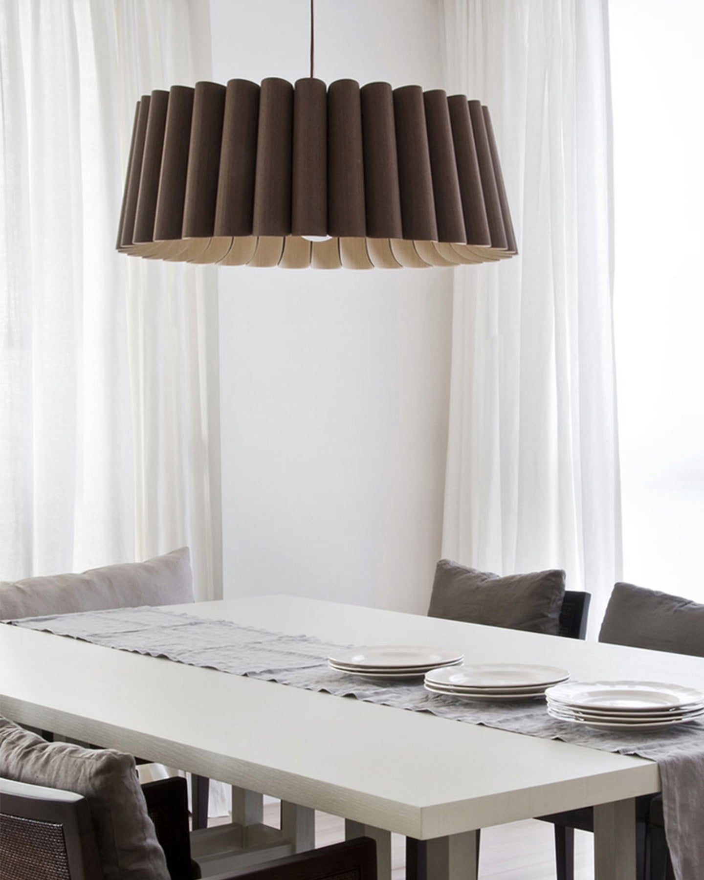 Dining room with a modern lampshade over a table set for dinner.