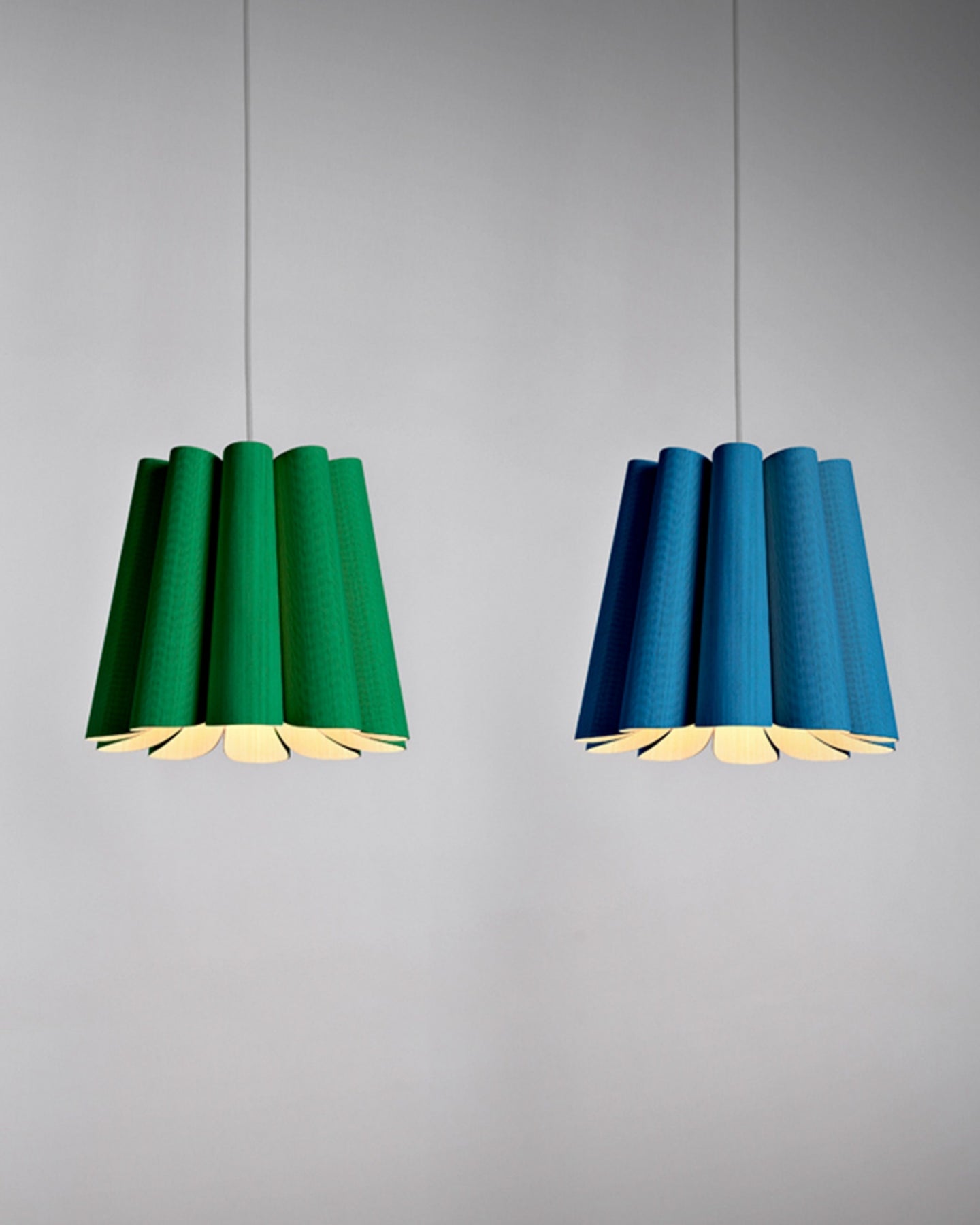 Two pendant lights, one green and one blue, on a gray background