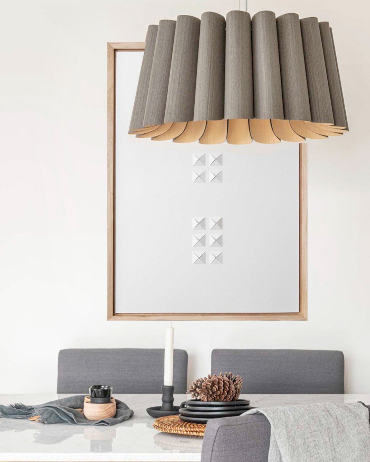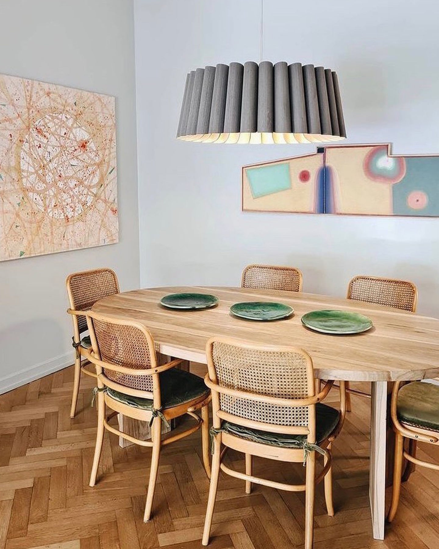 Dining room with wooden table and chairs, abstract art on the wall, featuring a wavy wooden pendant