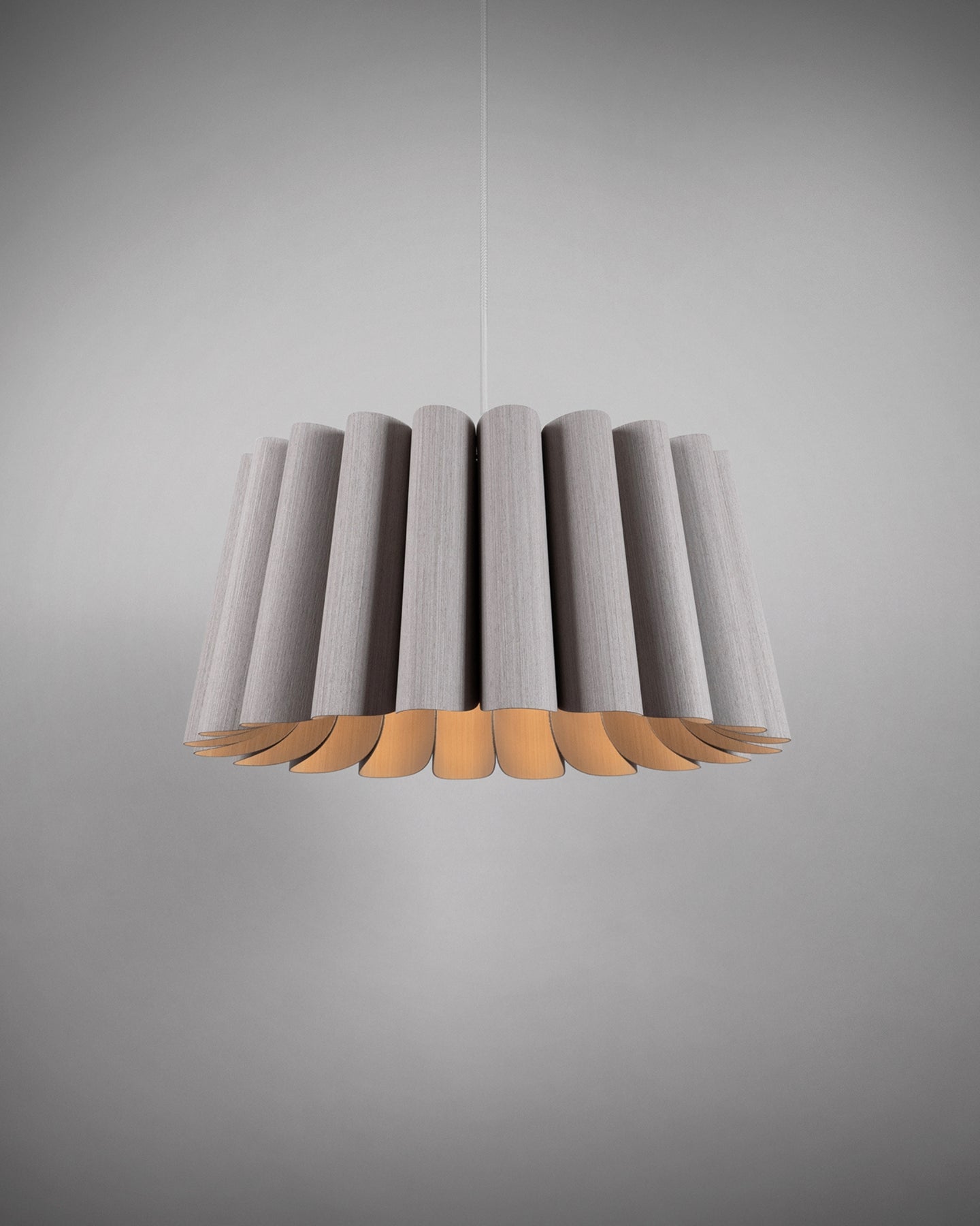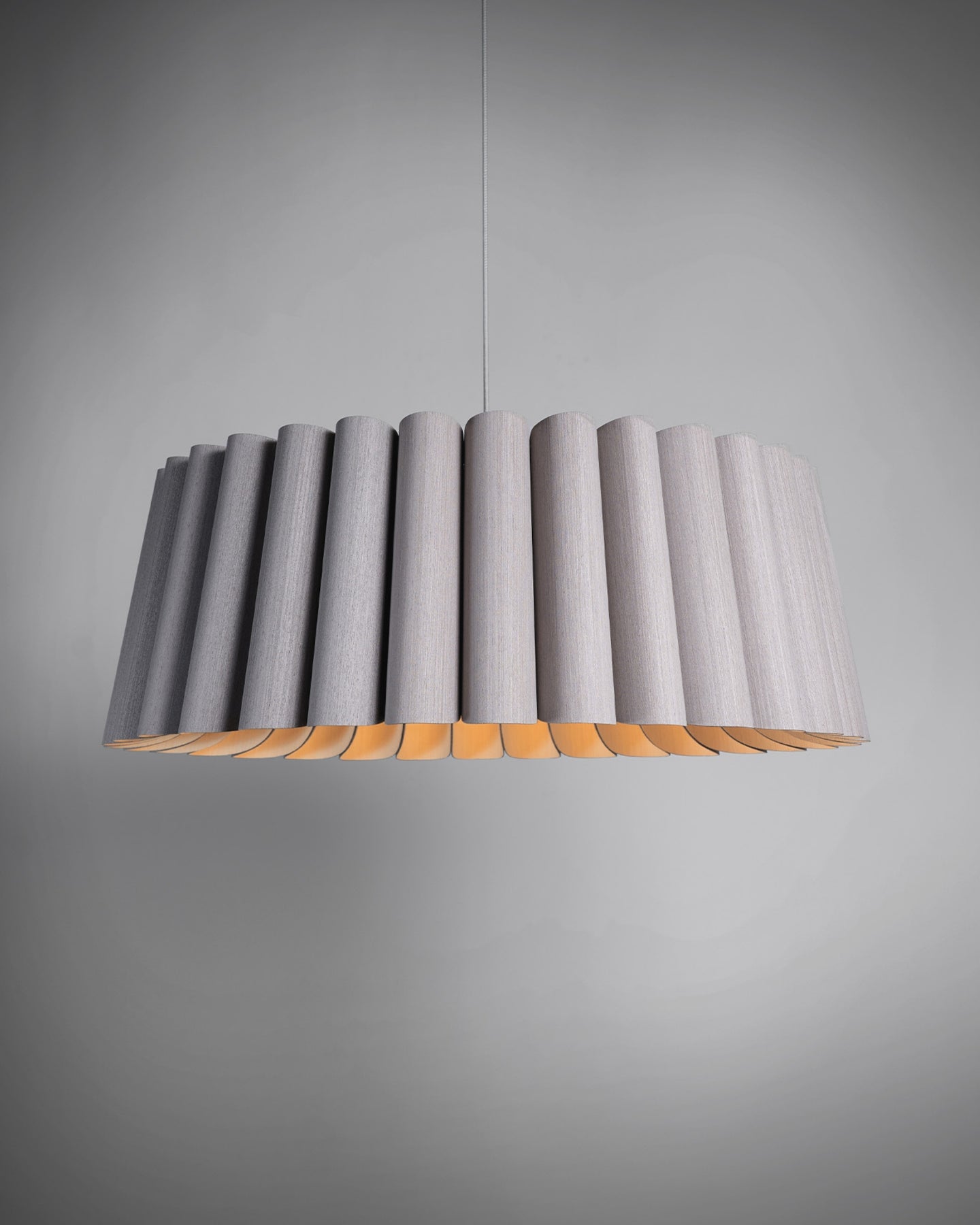 Modern pendant light with a ribbed design on a gray background