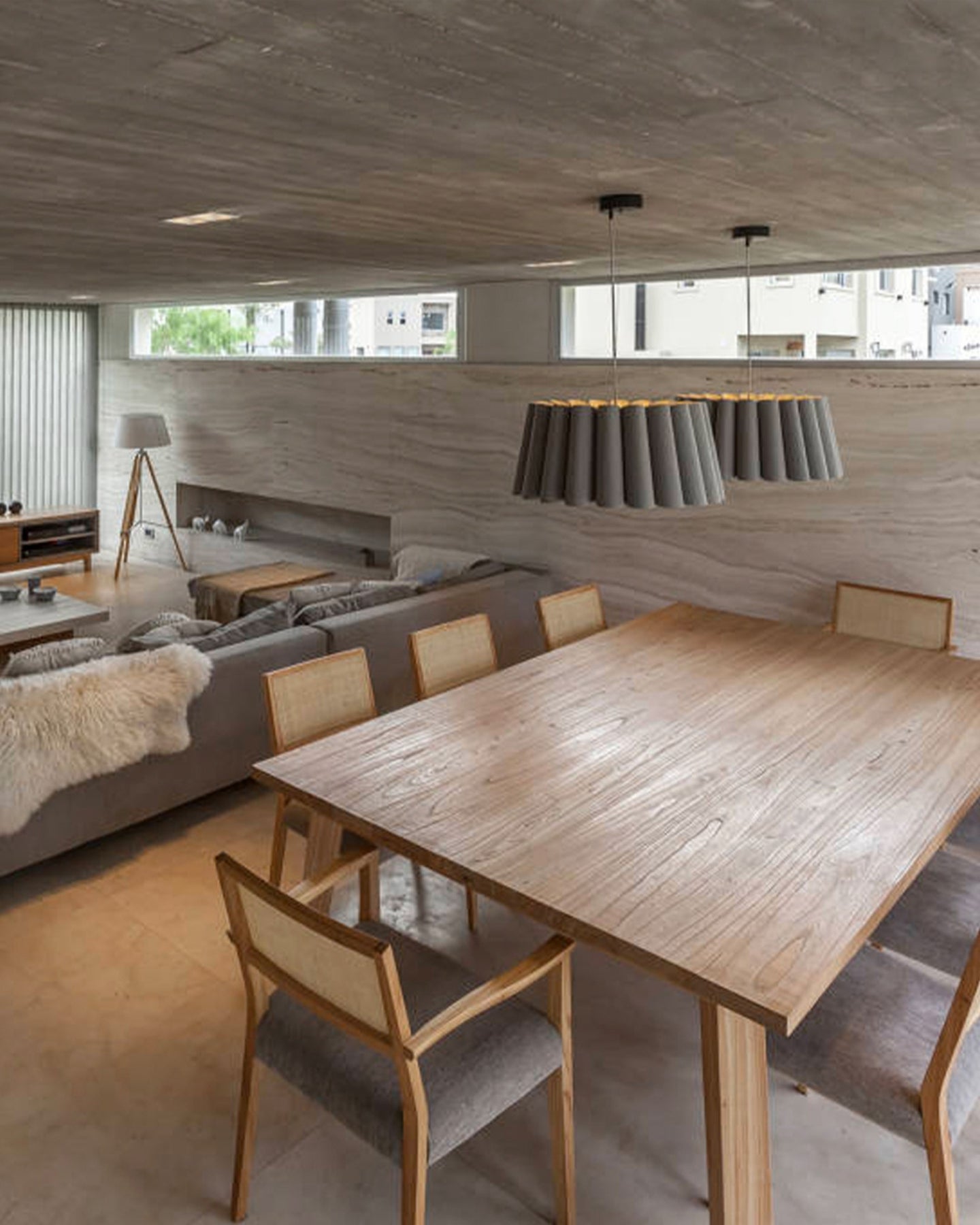 Modern living room with wooden pendant, dining table and chairs, concrete walls, and ceiling.