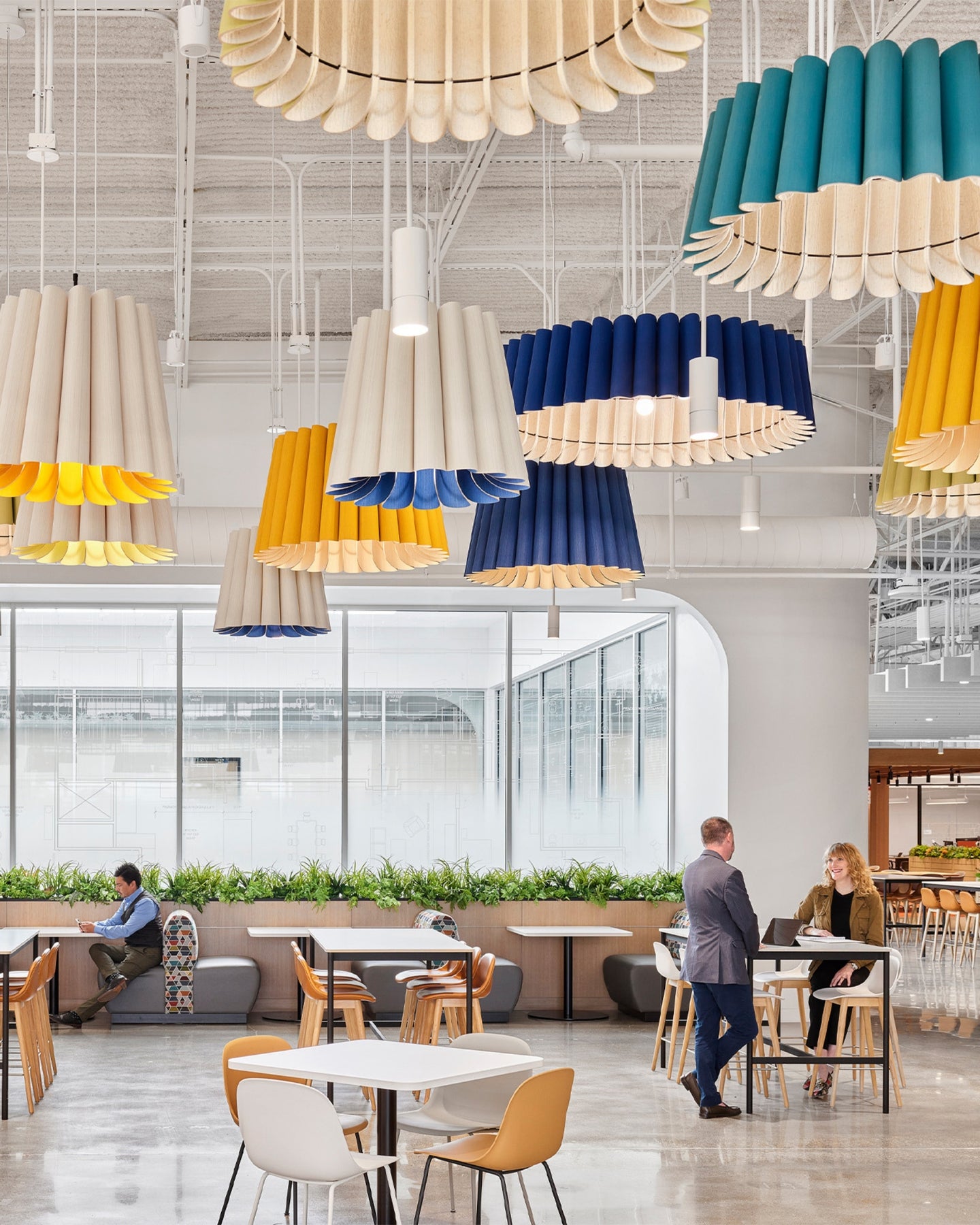 Modern interior with colorful pendant lights and people sitting at tables.