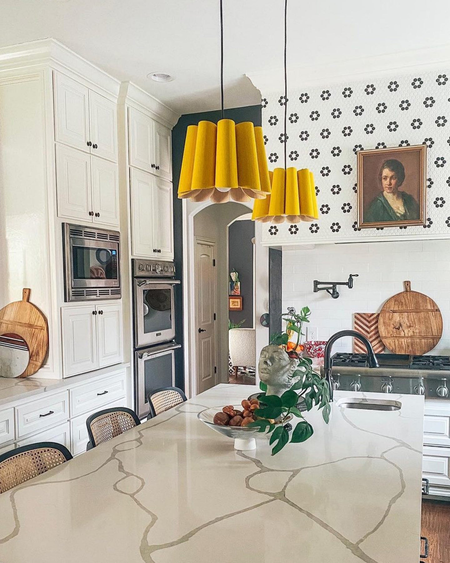 Modern kitchen with white cabinets, yellow pendant lights, and decorative elements.