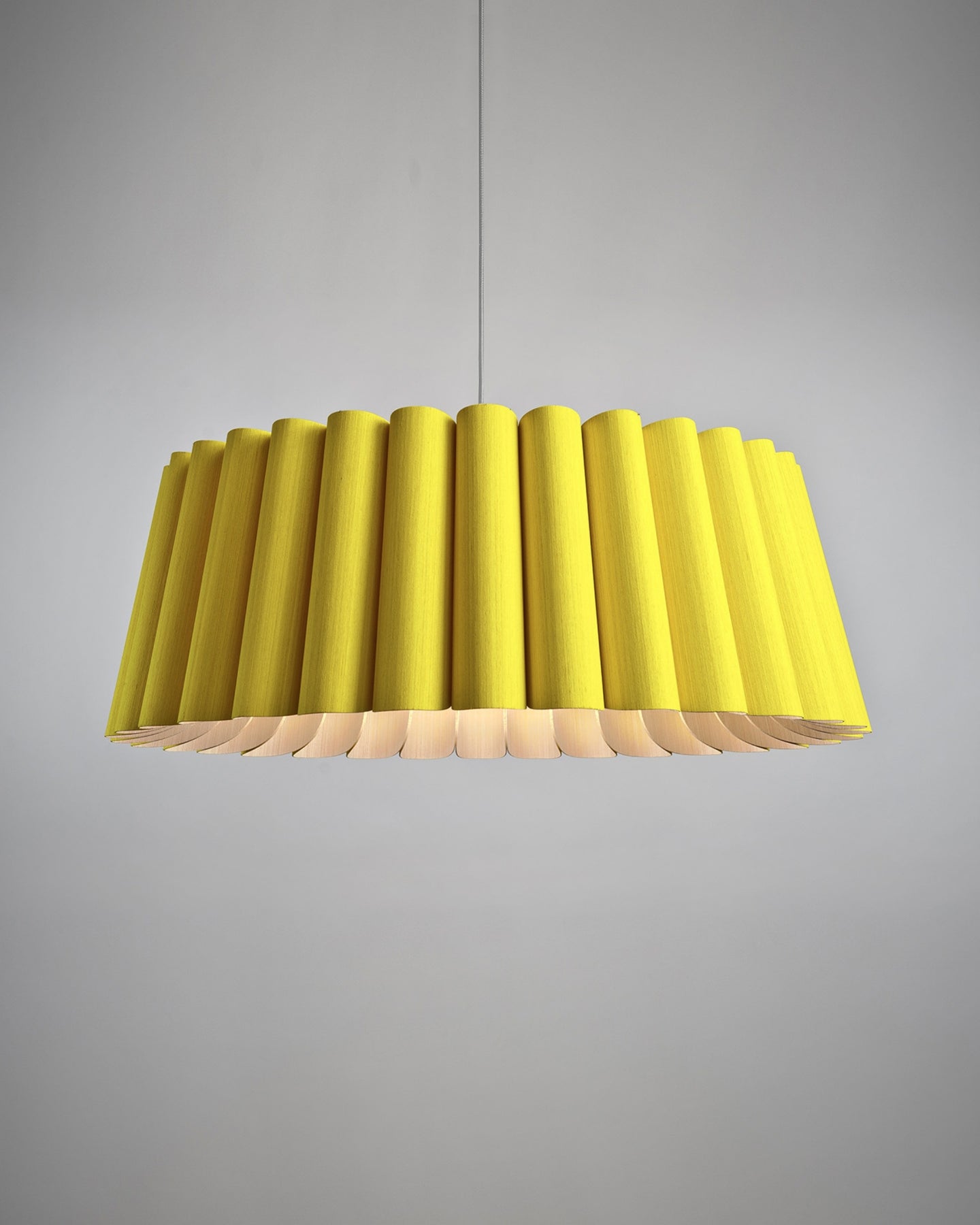 Yellow pendant lamp with a ribbed design on a gray background
