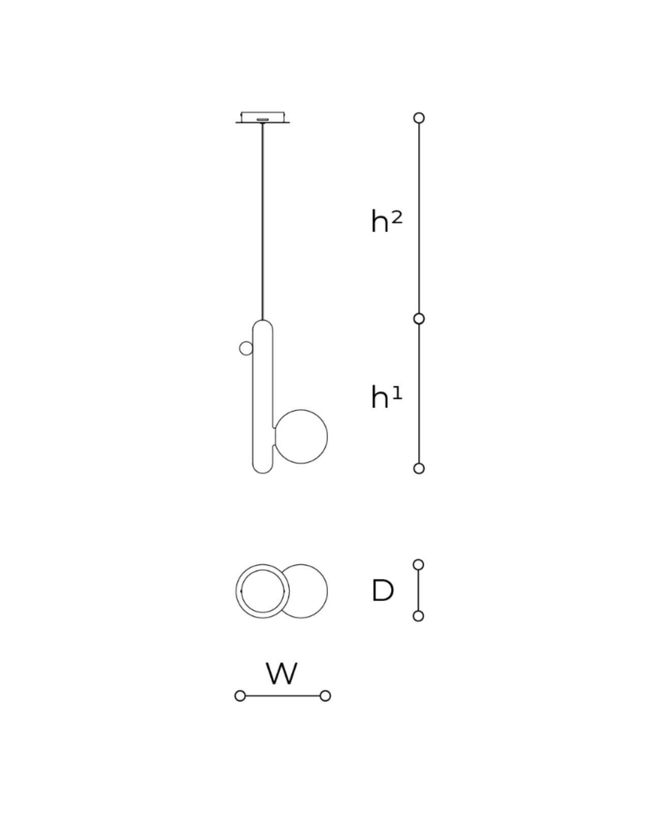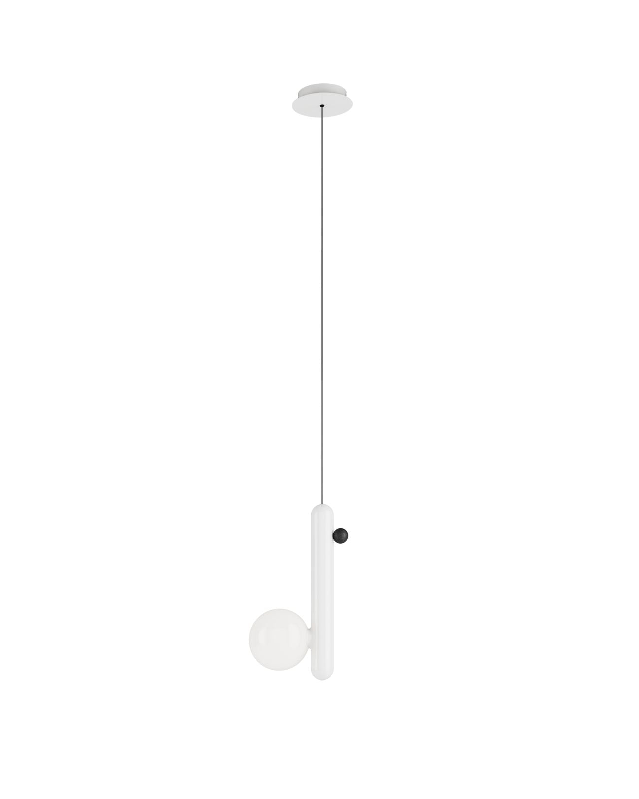 The Asymmetrical Single Pendant features a vertically oriented cylindrical body in a glossy finish, suspended by a fine black cable for a clean, floating effect. A smooth opal glass globe anchors the lower end, while a small decorative metal sphere adds visual contrast and balance. With its minimalist yet playful composition, the design feels both graphic and refined. Ideal as a statement piece above bedside tables, kitchen counters, or in clustered arrangements. Available in glossy white, glossy lava red, or matte midnight grey, with finishes that coordinate across the frame, diffuser, and accent details.