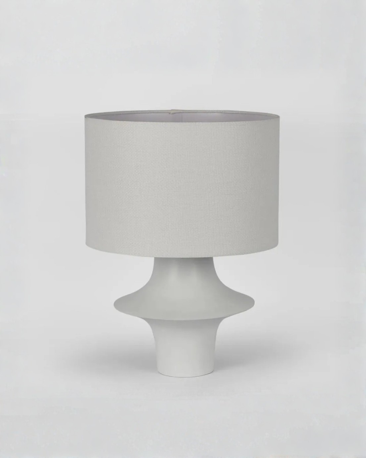 This table lamp is practical and stylish, perfect for modern or contemporary interiors. It radiates elegance, serenity, and timeless charm. You can place it on a bedside table, console, or reading nook. The minimalist design is made from hand-finished resin, and it has a white finish that blends seamlessly into any interior. The lamp is supplied with a versatile natural linen drum shade, adding an extra touch of style to the fixture.