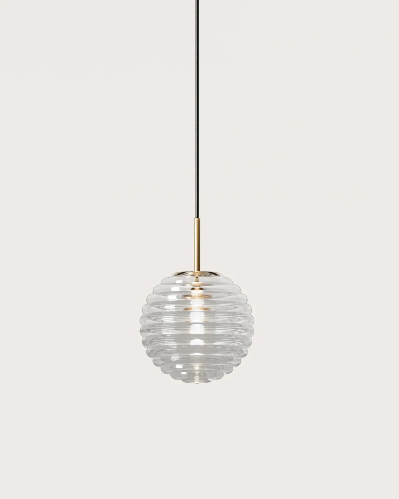 Reminiscent of jewellery, this pendant features an elegant and delicate spherical shade made from ridged transparent glass combined with sleek steel fixtures, available in matte black or matte brass finish. This luminaire will spread a soft ambient light and will bring some softness and elegance to any traditional, modern or contemporary interior space. It will easily enhance a living room, dining room or bedroom.